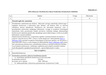 SPECYFIKACJA TECHNICZNA ORAZ WARUNKI GWARANCJI I SERWISU Załącznik nr 1 L.p Żądane Uwagi Oferowane -1- -2- -3- -4- Warunki ogóle dla samochodu 1 Przedmiotem zamówienia jest dostawa fabrycznie nowego samochodu dostawczego z napędem terenowym z nadwoziem typu "pickup", rok budowy 2013, ze sztywną zabudową skrzyni ładunkowej. Wykonawca ma obowiązek dostarczyć wraz z przedmiotem zamówienia następujące dokumenty: wyciągi ze świadectw homologacji samochodu, karty gwarancyjne, książki serwisowe, instrukcje obsługi, dokumentację techniczną do rejestracji pojazdu jako specjalnego uprzywilejowanego w ruchu (wszystkie dokumenty w języku polskim). Pojazd musi być zbudowany i wyposażony zgodnie z postanowieniami zawartymi w ustawie z dnia 20 czerwca 1997 r „Prawo o ruchu drogowym” (tekst jednolity Dz.U. z 2012 poz. 1137), posiadać świadectwo homologacji wystawione zgodnie z art. 68 ustawy z dnia 20.06.1997r. Prawo o ruchu drogowym (tekst jednolity Dz.U. z 2012 poz. 1137), posiadać zaświadczenie (dostarczone z przedmiotem dostawy) o przeprowadzonym dodatkowym badaniu technicznym, z adnotacją o spełnieniu przez pojazd warunków technicznych dla pojazdów specjalnych pożarniczych – uprzywilejowanych w ruchu. Opis szczegółowy 2 Samochód dostawczy 2.1 Konstrukcja, parametry, gabaryty kompletnego pojazdu a) konstrukcja samochodu zbudowana na sztywnej ramie ● minimalny prześwit - 210 mm ● rozstaw osi w zakresie - 3100 - 3300 mm b) kabina podwójna 4 drzwiowa, przystosowana do przewozu 5 osób, c) DMC pojazdu max. 3500 kg, d) nadwozie w kolorze czerwonym, białym lub srebrnym, e) silnik wysokoprężny, doładowany o minimalnej mocy 180 KM , maksymalny moment obrotowy powyżej 350 Nm, norma czystości spalin min. EURO 5 (należy podać typ i moc silnika w KM i kW ) f) napęd 4x4 z odłączanym napędem kół przednich, g) pojazd wyposażony w reduktor (przełożenia terenowe), h) blokada mechanizmu różnicowego, i) skrzynia biegów manualna minimum 5 przekładniowa + bieg wsteczny, j) pojazd wyposażony w system kontroli trakcji ESP, k) osłona silnika wykonana z blachy stalowej, l) skrzynia ładunkowa o ładowności min 700 kg, m) zabudowa skrzyni ładunkowej na wysokości dachu kabiny wykonana z tworzywa sztucznego w kolorze nadwozia zamykana na zamek z kluczem, otwierana z tyłu, z możliwością szybkiego demontażu i dodatkowym oświetleniem wnętrza, zabudowa wyposażona w szybę na tylnej klapie oraz system mocowania przewożonego ładunku. n) podłoga i burty przestrzeni ładunkowej zabezpieczone materiałem z tworzywa sztucznego odpornego na uszkodzenia i wodę, zespolonym trwale z konstrukcją tej przestrzeni i stanowiącym szczelną całość, o) boczne stopnie zewnętrzne, p) tylny zderzak ze stopniem, q) w kabinie dywaniki gumowe przód i tył, r) felgi ze stopów lekkich w rozmiarze min.18” s) pełnowymiarowe koło zapasowe, t) dodatkowy komplet 4 kół z oponami zimowymi w rozmiarze min 16” przystosowanym do tego pojazdu, u) układ hamulcowy wyposażony w układ ABS i EBD działający na 4 koła v) układ kierowniczy wyposażony we wspomaganie oraz regulację koła kierowniczego, w) przyciemniane szyby. 2.2 układ elektryczny i wyposażenie (wymagane): a) 12 V jednoprzewodowy z "minusem" na masę , wyposażony w alternator i akumulator pokrywający zapotrzebowanie na energię elektryczną przy pełnym obciążeniu. b) światła przeciwmgielne z przodu i tyłu pojazdu, c) immobilizer, d) elektrycznie podnoszone szyby przednie i tylne, e) elektrycznie regulowane, podgrzewane lusterka zewnętrzne, f) centralny zamek sterowany z pilota, autoalarm, g) klimatyzacja automatyczna dwustrefowa , h) w kabinie zamontowany radiotelefon przewoźny z anteną ćwierćfalową ze sprężyną wyniesioną na dach samochodu, dopuszczony do stosowania w sieci PSP o parametrach nie gorszych niż: zakres częśtotliwości VHF 136-174 MHz, moc- 5-25 W odstęp międzykanałowy 12,5 kHz nie mniej niż 250 kanałów oraz funkcjami: wywołanie statusowe, wywołanie selektywne typu SELEKT V wraz z prezentacją na wyświetlaczu funkcja TOT ( ograniczenie czasu nadawania) ustawiona co 1 sekundę, sygnalizacja DTMF i) radioodtwarzacz CD z głośnikami, 2.3 Układ bezpieczeństwa biernego pojazd wyposażony w przednie poduszki powietrzne dla kierowcy i pasażera, poduszki boczne i kurtyny powietrzne, trzypunktowe pasy bezpieczeństwa dla wszystkich miejsc. 2.4 Pojazd musi być oznakowany zgodnie z warunkami technicznymi dla pojazdów uprzywilejowanych określonymi w rozporządzeniu Ministra Infrastruktury w sprawie warunków technicznych pojazdów oraz zakresu ich niezbędnego wyposażenia (Dz.U z 2013 r, poz. 951) „Samochód osobowy operacyjny straży pożarnej z nadwoziem zamkniętym powinien być oznakowany pasem wyróżniającym barwy czerwieni sygnałowej. Po obu stronach pojazdu powinny być umieszczone napisy "STRAŻ" barwy białej lub czerwonej”. Pas wyróżniający wykonany z materiału odblaskowego. Warunki dodatkowe L.p Żądane Uwagi Oferowane -1- -2- -3- -4- 1 Z tyłu pojazdu zamontowany na stałe homologowany hak holowniczy kulowy z przyłączeniowym gniazdem elektrycznym. 2 Z przodu pojazdu zamontowana wyciągarka elektryczna ze sterowaniem na przewodzie o sile uciągu min. 5000 kg. 3 Kamera cofania z wizualizacją 4 Z przodu pojazdu zamontowane orurowanie zabezpieczające 5 Osłona skrzyni biegów i reduktora wykonana z blachy stalowej 6 Zamontowane boczne listwy ochronne 7 Belka świetlna typu "policyjnego" - 4 LED w tym jeden wewnętrzny koloru czerwonego, zamontowana na dachu. Generator sygnału montowany w miejscu niewidocznym z pilotem sterującym na desce rozdzielczej. Na belce podświetlany napis "STRAŻ”. 8 Zintegrowany system nawigacji satelitarnej z zainstalowaną mapą Polski. 9 Samochód oznakowany numerem operacyjnym 401o81 zgodnie z zarządzeniem Nr 13 Komendanta Głównego Państwowej Straży Pożarnej z dnia 27 grudnia 2012 r w sprawie gosp