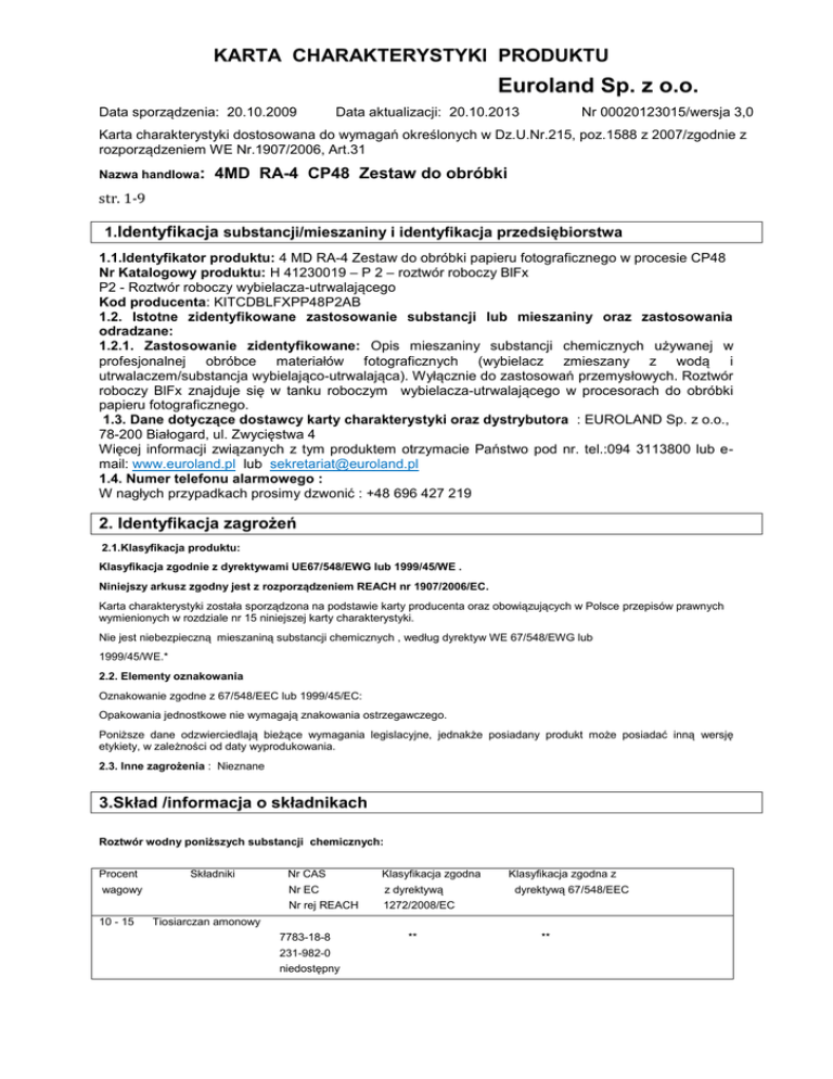 KARTA CHARAKTERYSTYKI PRODUKTU Euroland Sp. z o.o. Data sporządzenia: 20.10.2009 Data aktualizacji: 20.10.2013 Nr 00020123015/wersja 3,0 Karta charakterystyki dostosowana do wymagań określonych w Dz.U.Nr.215, poz.1588 z 2007/zgodnie z rozporządzeniem WE Nr.1907/2006, Art.31 Nazwa handlowa: 4MD RA-4 CP48 Zestaw do obróbki str. 1-9 1.Identyfikacja substancji/mieszaniny i identyfikacja przedsiębiorstwa 1.1.Identyfikator produktu: 4 MD RA-4 Zestaw do obróbki papieru fotograficznego w procesie CP48 Nr Katalogowy produktu: H 41230019 – P 2 – roztwór roboczy BlFx P2 - Roztwór roboczy wybielacza-utrwalającego Kod producenta: KITCDBLFXPP48P2AB 1.2. Istotne zidentyfikowane zastosowanie substancji lub mieszaniny oraz zastosowania odradzane: 1.2.1. Zastosowanie zidentyfikowane: Opis mieszaniny substancji chemicznych używanej w profesjonalnej obróbce materiałów fotograficznych (wybielacz zmieszany z wodą i utrwalaczem/substancja wybielająco-utrwalająca). Wyłącznie do zastosowań przemysłowych. Roztwór roboczy BlFx znajduje się w tanku roboczym wybielacza-utrwalającego w procesorach do obróbki papieru fotograficznego. 1.3. Dane dotyczące dostawcy karty charakterystyki oraz dystrybutora : EUROLAND Sp. z o.o., 78-200 Białogard, ul. Zwycięstwa 4 Więcej informacji związanych z tym produktem otrzymacie Państwo pod nr. tel.:094 3113800 lub email: www.euroland.pl lub [email protected] 1.4. Numer telefonu alarmowego : W nagłych przypadkach prosimy dzwonić : +48 696 427 219 2. Identyfikacja zagrożeń 2.1.Klasyfikacja produktu: Klasyfikacja zgodnie z dyrektywami UE67/548/EWG lub 1999/45/WE . Niniejszy arkusz zgodny jest z rozporządzeniem REACH nr 1907/2006/EC. Karta charakterystyki została sporządzona na podstawie karty producenta oraz obowiązujących w Polsce przepisów prawnych wymienionych w rozdziale nr 15 niniejszej karty charakterystyki. Nie jest niebezpieczną mieszaniną substancji chemicznych , według dyrektyw WE 67/548/EWG lub 1999/45/WE.* 2.2. Elementy oznakowania Oznakowanie zgodne z 67/548/EEC lub 1999/45/EC: Opakowania jednostkowe nie wymagają znakowania ostrzegawczego. Poniższe dane odzwierciedlają bieżące wymagania legislacyjne, jednakże posiadany produkt może posiadać inną wersję etykiety, w zależności od daty wyprodukowania. 2.3. Inne zagrożenia : Nieznane 3.Skład /informacja o składnikach Roztwór wodny poniższych substancji chemicznych: Procent Składniki wagowy 10 - 15 Nr CAS Klasyfikacja zgodna Nr EC z dyrektywą Nr rej REACH 1272/2008/EC Klasyfikacja zgodna z dyrektywą 67/548/EEC Tiosiarczan amonowy 7783-18-8 231-982-0 niedostępny ** ** KARTA CHARAKTERYSTYKI PRODUKTU Euroland Sp. z o.o. Data sporządzenia: 20.10.2009 Data aktualizacji: 20.10.2013 Nr 00020123015/wersja 3,0 Karta charakterystyki dostosowana do wymagań określonych w Dz.U.Nr.215, poz.1588 z 2007/zgodnie z rozporządzeniem WE Nr.1907/2006, Art.31 Nazwa handlowa: 4MD RA-4 CP48 Zestaw do obróbki str. 2-9 5 - 10 sól żelazowo-amonowa kwasu etylenodiaminotetraoctowego 21265-50-9 ** ** 244-302-2 niedostęony 1–5 Wodorosiarczan(IV) sodu 7631-90-5 Acute Tox. H 302 231-548-0 Xn; R22, R31 * * niedostęony 0,1 - < 1 Wodorosiarczyn amonu 10192-30-0 ** C; R31, R34 233-469-7 ** niedostępny 0,1 - < 1 Octan amonu 1631-61-8 ** ** ** ** 211-162-9 niedostępny 0,1 - < 1 Siarczyn amonu 10196-04-0 233-484-9 niedostępny Pełen tekst zwrotów R- i H- patrz: Rozdział 16 * Klasyfikacja substancji zgodnie z Załącznikiem VI rozporządzenia(EC) Nr 1272/2008 * * Substancje nie wymienione w Załączniku VI rozporządzenia (EC) Nr 1272/2008 4.Środki pierwszej pomocy 4.1. Opis środków pierwszej pomocy 4.1.1. Wdychanie: W przypadku wystąpienia objawów wyprowadzić poszkodowanego na świeże powietrze. W przypadku utrzymywania się dolegliwości zwrócić się o pomoc medyczną. 4.1.2. Skóra: Natychmiast spłukać skórę dużą ilością wody z mydłem. W przypadku utrzymywania się dolegliwości zwrócić się o pomoc lekarską. 4.1.3. Oczy: Natychmiast przemyć oczy dużą ilością czystej, bieżącej wody przez minimum 15 minut. W przypadku utrzymywania się dolegliwości zwrócić się o pomoc lekarską. 4.1.4. Połknięcie: NIE WYWOŁYWAĆ wymiotów. Osobie poszkodowanej podać szklankę wody. Zwrócić się o pomoc medyczną. Nigdy nie podawać osobie nieprzytomnej żadnych środków doustnie. 4.2. Najważniejsze ostre i opóźnione objawy oraz skutki narażenia: Brak dostępnej informacji. 4.3. Wskazania dotyczące wszelkiej natychmiastowej pomocy lekarskiej i szczególnego postępowania z poszkodowanym: Brak dostępnej informacji. 5. Postępowanie w przypadku pożaru KARTA CHARAKTERYSTYKI PRODUKTU Euroland Sp. z o.o. Data sporządzenia: 20.10.2009 Data aktualizacji: 20.10.2013 Nr 00020123015/wersja 3,0 Karta charakterystyki dostosowana do wymagań określonych w Dz.U.Nr.215, poz.1588 z 2007/zgodnie z rozporządzeniem WE Nr.1907/2006, Art.31 Nazwa handlowa: 4MD RA-4 CP48 Zestaw do obróbki str. 3-9 5.1. Środki gaśnicze: Produkt jest niepalny. Środki gaśnicze stosowne do materiałów znajdujących się w strefie pożaru: stosować zraszacze wodne, gaśnice wodne, gaśnice pianowe odporne na alkohol, gaśnice chemiczne lub gaśnice zawierające dwutlenek węgla. Spłukiwać dużą ilością wody. 5.2. Szczególne zagrożenia związane z substancją lub mieszaniną 5.2.1.Niebezpieczne produkty spalania: Ogień lub wysoka temperatura może wytworzyć wydzielanie się niebezpiecznych produktów rozkładu takich jak tlenki azotu, tlenki węgla, dwutlenek siarki ( patrz punkt 10 niniejszej karty charakterystyki – Stabilność i reaktywność).W niektórych warunkach pożaru nie można wykluczyć śladów innych substancji trujących. Produkty spalania mogą działać jako czynniki redukujące. 5.2.2. Nietypowe zagrożenia związane z pożarem lub wybuchem: Mieszanina zawiera silny reduktor. Wysuszony osad po produkcie może pełnić funkcję reduktora. Gwałtownie reaguje z m