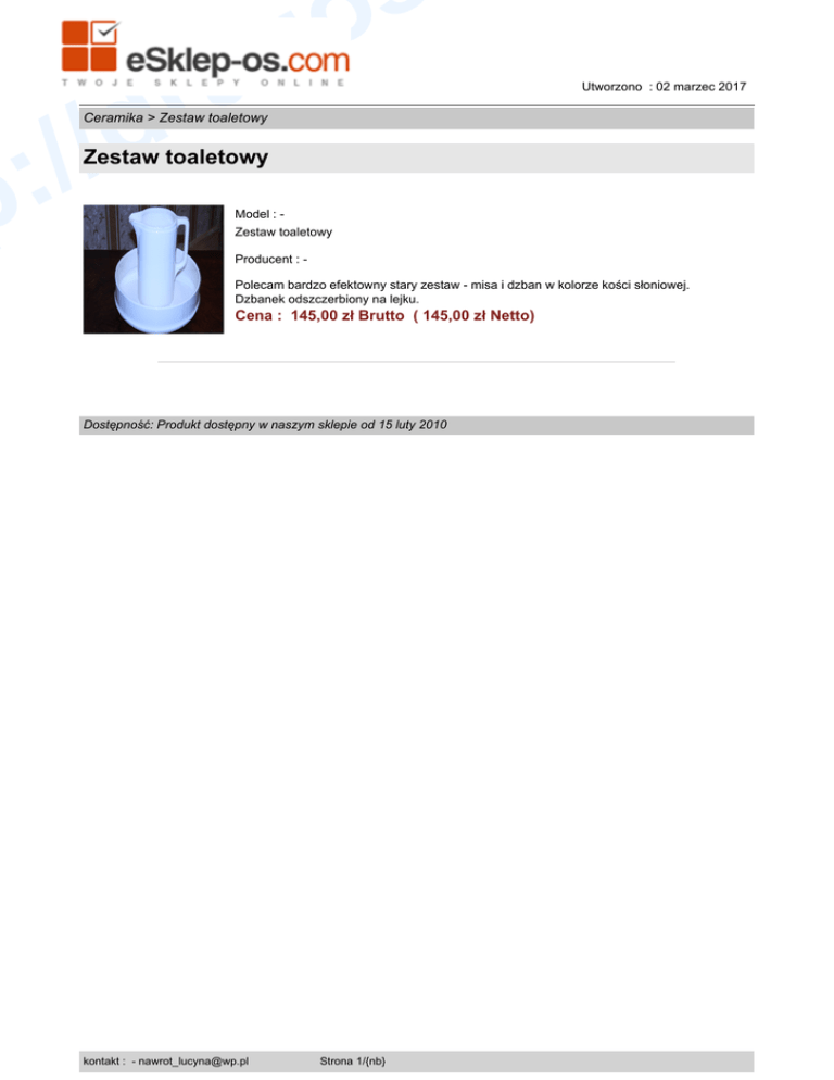 o g a r /d / : p Utworzono : 02 marzec 2017 Ceramika > Zestaw toaletowy Zestaw toaletowy Model : Zestaw toaletowy Producent : Polecam bardzo efektowny stary zestaw - misa i dzban w kolorze kości słoniowej. Dzbanek odszczerbiony na lejku. Cena : 145,00 zł Brutto ( 145,00 zł Netto) Dostępność: Produkt dostępny w naszym sklepie od 15 luty 2010 kontakt : - [email protected] Strona 1/{nb}