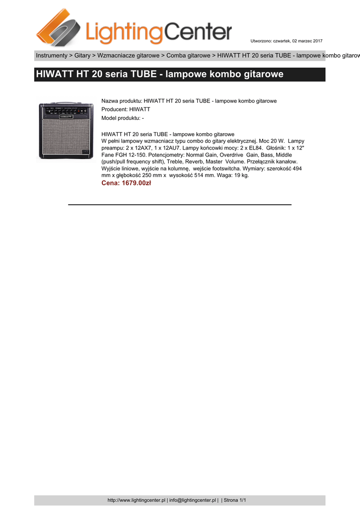 Utworzono: czwartek, 02 marzec 2017 Instrumenty > Gitary > Wzmacniacze gitarowe > Comba gitarowe > HIWATT HT 20 seria TUBE - lampowe kombo gitarow HIWATT HT 20 seria TUBE - lampowe kombo gitarowe Nazwa produktu: HIWATT HT 20 seria TUBE - lampowe kombo gitarowe Producent: HIWATT Model produktu: HIWATT HT 20 seria TUBE - lampowe kombo gitarowe W pełni lampowy wzmacniacz typu combo do gitary elektrycznej. Moc 20 W. Lampy preampu: 2 x 12AX7, 1 x 12AU7. Lampy końcowki mocy: 2 x EL84. Głośnik: 1 x 12" Fane FGH 12-150. Potencjometry: Normal Gain, Overdrive Gain, Bass, Middle (push/pull frequency shift), Treble, Reverb, Master Volume. Przełącznik kanałow. Wyjście liniowe, wyjście na kolumnę, wejście footswitcha. Wymiary: szerokość 494 mm x głębokość 250 mm x wysokość 514 mm. Waga: 19 kg. Cena: 1679.00zł http://www.lightingcenter.pl | [email protected] | | Strona 1/1
