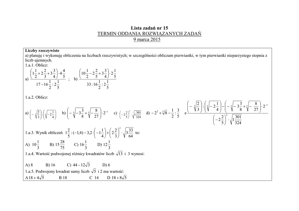 a) planuję i wykonuję obliczenia na liczbach rzeczywistych; w szczególności obliczam pierwiastki, w tym pierwiastki nieparzystego stopnia z