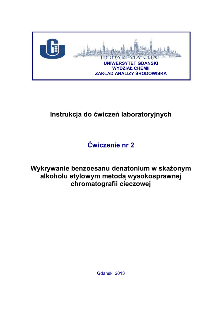 UNIWERSYTET GDAŃSKI WYDZIAŁ CHEMII ZAKŁAD ANALIZY ŚRODOWISKA Instrukcja do ćwiczeń laboratoryjnych Ćwiczenie nr 2 Wykrywanie benzoesanu denatonium w skażonym alkoholu etylowym metodą wysokosprawnej chromatografii cieczowej Gdańsk, 2013 I CEL ĆWICZENIA Celem ćwiczenia jest analiza benzoesanu denatonium w próbkach skażonego alkoholu etylowego oraz w próbkach odkażonych przez dodanie chloranu(I) sodu (podchlorynu sodu, NaOCl). Analiza jakościowa zostanie wykonana poprzez porównanie czasu retencji analitu z czasem retencji wzorca otrzymanych w tych samych warunkach chromatograficznych. II ODKAŻANIE ALKOHOLU Benzoesan denatonium odkryto przypadkowo w Edynburgu w roku 1958. W laboratoriach firmy Macfarlan Smith podczas prac nad lidokainą jeden z naukowców odkrył, że otrzymany biały puder miał bardzo gorzki smak. BENZOESAN DENATONIUM CH3 NH + CH3 N O CH3 H3C O - O o biały krystaliczny proszek lub granulki o bezzapachowy ale ekstremalnie gorzki o temperatura topnienia 163 -170 ºC o rozpuszczalność w wodzie 5% w temp. 20 ºC o może powodować reakcje alergiczne u osób uczulonych na lidokainę lub podobne związki o nie ulega bioakumulacji o działania kancerogennego, teratogennego czy mutagennego u ludzi nie stwierdzono Człowiek może wykryć lekko gorzki smak benzoesanu denatonium już przy stężeniu 50 ppb a bardzo gorzki smak wyczuwa przy stężeniu 1-10 ppm. Do testowania intensywności gorzkiego smaku wykorzystywani są jedynie ludzie (już od 18 miesiąca życia). W 1982 roku benzoesan denatonium został umieszczony w Księdze Rekordów Guinnessa jako „najbardziej gorzka substancja znana człowiekowi”. W 1958 roku produkt został zrejestrowany jako środek denaturujący pod marką Bitrex® w Zjednoczonym Królestwie, a w 1960 roku w Stanach Zjednoczonych. Bitrex i logo Bitrex (i wszystkie tłumaczenia) są zastrzeżone przez firmę Macfarlan Smith i nie mogą być używane ani kopiowane w żadnej formie na etykietkach, w materiałach ilustracyjnych, na opakowaniach, w reklamie czy materiałach promocyjnych bez pisemnej zgody firmy Macfarlan Smith. Warunki uzyskania zgody od firmy Macfarlan Smith to: o przejście testów każdego produktu w laboratoriach Macfarlan Smith; pozwala na upewnienie się, że będzie on stabilny i na poziomie zapewniającym bezpieczeństwo o zastosowanie minimalnego poziomu Bitrex-u zapewniający gorzki smak (10 - 100 ppm) o wszystkie prace graficzne związane z etykietkami, opakowaniami, reklamą itp. z użyciem logo Bitrex muszą być zaaprobowane przez firmę Macfarlan Smith o wszelkie zmiany dotyczące produktów, dla których wcześniej została uzyskana zgoda muszą być ponownie zaakceptowane przez Macfarlan Smith Ze względu na niestwierdzone szkodliwe działanie jest uniwersalnym środkiem do skażania produktów spirytusowych. Niestety pomimo obowiązującego prawa, wciąż pojawiają się problemy związane ze zbyt małą niż wyznaczona ilością benzoesanu denatonium w wyrobach alkoholowych oraz z usuwaniem gorzkiego smaku poprzez dodanie chloranu(I) sodu (podchlorynu sodu). CHLORAN(I) SODU (NaOCl, podchloryn sodu) o rozpuszczony w wodzie jest przeźroczystym żółtozielonym płynem o pH od 12 do 13, który działa silnie utleniająco o procentowość NaOCI odnosi się do ilości czynnego chloru, maksymalnie 12,5%. Po raz pierwszy podchloryn, najprawdopodobniej w postaci podchlorynu potasowego (KOCI), został wytworzony w XVIII wieku przez francuskiego chemika C.L. Berthollet’a. Podchloryny znalazły zastosowanie jako środki do bielenia tekstyliów i innych materiałów organicznych czy w odkażaniu ran (działa odkażająco na wszystkie drobnoustroje, grzyby i wirusy). Odkażające właściwości zadecydowały o wykorzystaniu 5% roztworu NaOCl jako środka płuczącego podczas leczenia kanałowego zębów. Zuba i jego zespół opracowali metodę oznaczania benzoesanu denatonium za pomocą HPLC z detekcją DAD. Opracowaną metodę zastosowali także do badania efektywności usuwania benzoesanu denatonium za pomocą podchlorynu sodu. Dodatkowo wykorzystali także spektormetrię mas (zarówno w trybie pracy jonów dodatnich, jak i ujemnych). Udowodnili, że dodanie NaOCl (o zawartości 12–15% aktywnego chloru) w ilości odpowiadającej stężeniu 50 µL na litr spirytusu skażonego (3 mgL-1 benzoesanu denatonium) powoduje spadek stężenia jonów denatonium w roztworze. Po dodaniu NaOCl w ilości odpowiadającej 200 µL na litr alkoholu usuwa te jony całkowicie powodując zanik gorzkiego smaku przy stosunkowo niezmienionym pH roztworu. Jony benzoesanowe zniknęły dopiero po dodaniu NaOCl w ilości dpowiadającej 80 mL na litr alkoholu. W tak otrzymanym roztworze pH osiągnęło wartość 11-12 co uniemożliwia użycie tego alkoholu dla celów konsumpcyjnych. Dzięki tym badaniom wiemy o tym, że jeśli w produkcie spirytusowym potwierdzona zostanie obecność jonów benzoesanowych to możemy przypuszczać, iż wcześniej w takim produkcie znajdował się benzoesan denatonium. Wśród zidentyfikowanych produktów degradacji benzoesanu denatonium są min. N,N-dibenzylamina czy chlorek sodu. III WYKONANIE ĆWICZENIA 1. Przygotowanie próbek Należy wykonać analizę chromatograficzną (HPLC) próbki alkoholu zawierającego określoną ilość benzoesanu denatonium a także próbki czystego alkoholu. W kolejnym etapie należy pobrać 1 ml otrzymanej próbki alkoholu skażonego i usunąć jony denatonium za pomocą chloranu(I) sodu (o zawartości 10–15% aktywnego chloru). Potrzebną objętość NaOCl należy obliczyć wiedząc, że: dodanie NaOCl (o zawartości 12–15% aktywnego chloru) w ilości odpowiadającej stężeniu 50 µL na litr spirytusu skażonego Bitrexem (3 mgL-1) powoduje spadek stężenia jonów denatonium w roztworze; dodanie NaOCl w ilości odpowiadającej 200 µL na litr alkoholu usuwa te jony całkowicie co wystarczy do zneutralizowania gorzkiego smaku; jony benzoesanowe znikają z roztworu do