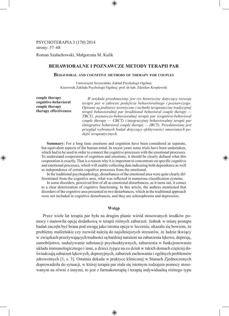 Psychoterapia 3 (170) 2014 strony: 57–68 Roman Szałachowski, Małgorzata M. Kulik Behawioralne i poznawcze metody terapii par Behavioral and cognitive methods of therapy for couples Uniwersytet Szczeciński, Zakład Psychologii Ogólnej Kierownik Zakładu Psychologii Ogólnej: prof. dr hab. Zdzisław Kroplewski couple therapy cognitive-behavioral couple therapy therapy effectiveness W artykule przedstawiony jest rys historyczny dotyczący rozwoju terapii par w zakresie podejścia behawioralnego i poznawczego. Opisane są podstawy teoretyczne i techniki terapeutyczne tradycyjnej terapii behawioralnej par (traditional behavioral couple therapy — TBCT), poznawczo-behawioralnej terapii par (cognitive-behavioral couple therapy — CBCT) i integracyjnej behawioralnej terapii par (integrative behavioral couple therapy — IBCT). Przedstawiony jest przegląd wybranych badań dotyczący efektywności omawianych podejść terapeutycznych. Summary: For a long time emotions and cognition have been considered as separate, but equivalent aspects of the human mind. In recent years some trials have been undertaken, which had to be used in order to connect the cognitive processes with the emotional processes. To understand cooperation of cognition and emotions, it should be clearly defined what this cooperation is exactly. That is a reason why it is important to concentrate on specific cognitive and emotional processes, which will enable collecting data indicating both dependence as well as independence of certain cognitive processes from the emotional. In the traditional psychopathology, disturbances of the emotional area were quite clearly differentiated from the cognitive area, what was reflected in numerous classification systems. In some disorders, perceived first of all as emotional disturbances, as it turns out, it comes to a clear deterioration of cognitive functioning. In this article, the authors mentioned that disorders of the cognitive area presented in two disturbances, which in the traditional approach were not included in cognitive disturbances, and they are schizophrenia and depression. Wstęp Przez wiele lat terapia par była na drugim planie wśród stosowanych środków pomocy i stanowiła opcję dodatkową w terapii różnych zaburzeń. Jednak w miarę postępu badań zaczęła być brana pod uwagę jako istotna opcja w leczeniu, okazało się bowiem, że problemy małżeńskie czy rozwód należą do najsilniejszych stresorów, że ludzie tkwiący w związkach przeżywających trudności są bardziej narażeni na zaburzenia lękowe, depresję, samobójstwo, nadużywanie substancji psychoaktywnych, zaburzenia w funkcjonowaniu układu immunologicznego i inne, a dzieci żyjące na co dzień w takich domach częściej doświadczają zaburzeń lękowych, depresyjnych, zaburzeń zachowania i ogólnych problemów zdrowotnych [1, s. 3]. Ostatnia dekada w praktyce klinicznej w Stanach Zjednoczonych doprowadziła do sytuacji, w której terapia par stała się istotnym rodzajem pomocy stosowanym na równi z innymi, to jest z farmakoterapią i terapią indywidualną różnego typu 58 Roman Szałachowski, Małgorzata M. Kulik [2]. Ocenia się, że problemy rodzin i par są tam powodem blisko połowy wszystkich wizyt w gabinetach psychoterapeutycznych [3, s. 11]. Liczba profesjonalnych ośrodków i specjalistów oferujących pomoc parom w potrzebie jest w Stanach Zjednoczonych imponująca. W ostatnim czasie dużą popularność zyskały również różnego typu programy edukacyjne, mające na celu prewencję poprzez kształtowanie poziomu różnych umiejętności i cech, czego wydźwięk widać w podejmowanych badaniach naukowych nad ich efektywnością [4]. W polskiej rzeczywistości terapia par jest jednak w dalszym ciągu dodatkowym elementem pomocy psychologicznej, choć zdobywającym coraz szersze uznanie, można bowiem zaobserwować duże zainteresowanie nią, zarówno wśród specjalistów, jak i wśród samych par lub osób indywidualnych. Obecnie na świecie, pośród wielu istniejących szkół, sześć podejść teoretycznych można uznać za najbardziej znaczące [1, s. 1–2] i najczęściej badane pod kątem efektywności swoich oddziaływań. Okazuje się jednak, że interwencje tradycyjnej behawioralnej terapii par (traditional behavioral couple therapy — TBCT) należą do najchętniej wybieranych przez terapeutów. Do wspomnianych interwencji należą: (1) trening zmiany behawioralnej oraz (2) trening komunikowania i rozwiązywania problemów. TBCT może też pochwalić się największą liczbą empirycznych badań, a także najwyższą efektywnością w przypadkach różnego rodzaju problemów małżeńskich [2]. Techniki behawioralne w pracy z parami i rodzinami są stosowane przez więcej niż 80% współczesnych terapeutów, a podejście poznawczo-behawioralne (cognitive behavioral couple therapy — CBCT) jest najczęściej proponowanym pierwszym sposobem pomocy parom [5, s. 116]. W niniejszym artykule autorzy skupili się na prezentacji trzech szkół z grupy terapii behawioralnych. Są to: tradycyjna terapia behawioralna par (traditional behavioral couple therapy — TBCT), poznawczo-behawioralna terapia par (cognitive-behavioral couple therapy — CBCT) oraz integracyjna behawioralna terapia par (integrative behavioral couple therapy — IBCT). Źródła problemów małżeńskich Techniki terapeutyczne powstawały i wciąż powstają jako odpowiedź na występujące konkretne problemy par. Dlatego też warto pokrótce spojrzeć na źródła tych problemów i w ich kontekście omówić wybrane przykłady podejść terapeutycznych. Osobowość człowieka kształtują nie tylko czynniki biologiczne i środowiskowe, ale zasadnicze przekonania i schematy poznawcze — rozwijają się one na wczesnym etapie życia i są wynikiem osobistych doznań, wpływu rodziców i otoczenia społecznego [6]. To właśnie one będą w przyszłości determinować sposób kodowania, kate