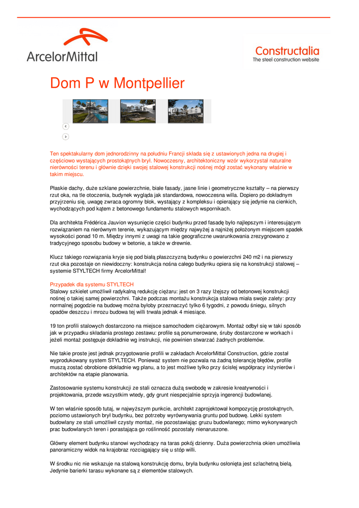 Dom P w Montpellier Ten spektakularny dom jednorodzinny na południu Francji składa się z ustawionych jedna na drugiej i częściowo wystających prostokątnych brył. Nowoczesny, architektoniczny wzór wykorzystał naturalne nierówności terenu i głównie dzięki swojej stalowej konstrukcji nośnej mógł zostać wykonany właśnie w takim miejscu. Płaskie dachy, duże szklane powierzchnie, białe fasady, jasne linie i geometryczne kształty – na pierwszy rzut oka, na tle otoczenia, budynek wygląda jak standardowa, nowoczesna willa. Dopiero po dokładnym przyjrzeniu się, uwagę zwraca ogromny blok, wystający z kompleksu i opierający się jedynie na cienkich, wychodzących pod kątem z betonowego fundamentu stalowych wspornikach. Dla architekta Frédérica Jauvion wysunięcie części budynku przed fasadę było najlepszym i interesującym rozwiązaniem na nierównym terenie, wykazującym między najwyżej a najniżej położonym miejscem spadek wysokości ponad 10 m. Między innymi z uwagi na takie geograficzne uwarunkowania zrezygnowano z tradycyjnego sposobu budowy w betonie, a także w drewnie. Klucz takiego rozwiązania kryje się pod białą płaszczyzną budynku o powierzchni 240 m2 i na pierwszy rzut oka pozostaje on niewidoczny: konstrukcja nośna całego budynku opiera się na konstrukcji stalowej – systemie STYLTECH firmy ArcelorMittal! Przypadek dla systemu STYLTECH Stalowy szkielet umożliwił radykalną redukcję ciężaru: jest on 3 razy lżejszy od betonowej konstrukcji nośnej o takiej samej powierzchni. Także podczas montażu konstrukcja stalowa miała swoje zalety: przy normalnej pogodzie na budowę można byłoby przeznaczyć tylko 6 tygodni, z powodu śniegu, silnych opadów deszczu i mrozu budowa tej willi trwała jednak 4 miesiące. 19 ton profili stalowych dostarczono na miejsce samochodem ciężarowym. Montaż odbył się w taki sposób jak w przypadku składania prostego zestawu: profile są ponumerowane, śruby dostarczone w workach i jeżeli montaż postępuje dokładnie wg instrukcji, nie powinien stwarzać żadnych problemów. Nie takie proste jest jednak przygotowanie profili w zakładach ArcelorMittal Construction, gdzie został wyprodukowany system STYLTECH. Ponieważ system nie pozwala na żadną tolerancję błędów, profile muszą zostać obrobione dokładnie wg planu, a to jest możliwe tylko przy ścisłej współpracy inżynierów i architektów na etapie planowania. Zastosowanie systemu konstrukcji ze stali oznacza dużą swobodę w zakresie kreatywności i projektowania, przede wszystkim wtedy, gdy grunt niespecjalnie sprzyja ingerencji budowlanej. W ten właśnie sposób tutaj, w najwyższym punkcie, architekt zaprojektował kompozycję prostokątnych, poziomo ustawionych brył budynku, bez potrzeby wyrównywania gruntu pod budowę. Lekki system budowlany ze stali umożliwił czysty montaż, nie pozostawiając gruzu budowlanego; mimo wykonywanych prac budowlanych teren i porastająca go roślinność pozostały nienaruszone. Główny element budynku stanowi wychodzący na taras pokój dzienny. Duża powierzchnia okien umożliwia panoramiczny widok na krajobraz rozciągający się u stóp willi. W środku nic nie wskazuje na stalową konstrukcję domu, bryła budynku osłonięta jest szlachetną bielą. Jedynie barierki tarasu wykonane są z elementów stalowych. Zrównoważony i wydajny energetycznie Zleceniodawcy chcieli posiadać nie tylko nowoczesny dom, spełniający wymagania architektoniczne, lecz także wydajny energetycznie budynek, zgodny z najbardziej aktualnymi wymogami i wywierający jak najmniejszy wpływ na środowisko. Rozstrzygający w domu mieszkalnym jest bilans węgla pierwiastkowego w fazie użytkowej, a ten został tutaj maksymalnie zredukowany. Dom X został zbadany w ramach francuskiego certyfikatu energetycznego dla domów mieszkalnych, BBC Effinergie i zaklasyfikowany jako dom pasywny, tzn. dom, który produkuje więcej energii, niż jej zużywa. W celu uzyskania optymalnej izolacji domu zastosowano podwójną izolację o grubości całkowitej 20 cm. Pomiędzy profile stalowe wmontowano panele z włókna szklanego o grubości 120 mm. Zewnętrzna obudowa budynku składa się z paneli izolacyjnych wykonanych z włókna drzewnego. Płaski dach wyposażono w zintegrowane wysokowydajne ogniwa fotowoltaiczne, gwarantujące całkowite zaopatrzenie domu w energię elektryczną. Także gdy chodzi o podział i rozkład pomieszczeń dom spełnia najważniejsze bioklimatyczne wymagania: podczas gdy wszystkie pomieszczenia mieszkalne są otwarte i skierowane na południe, to sypialnie skierowane są na północ i posiadają tylko małe otwory okienne. W tym samym celu okna wystającej bryły budynku, w której mieści się sypialnia i łazienka rodziców, wyposażone są w regulowane rolety przeciwsłoneczne. Tekst: Constructalia by ArcelorMittal Copyright © 2014 Constructalia. All rights reserved