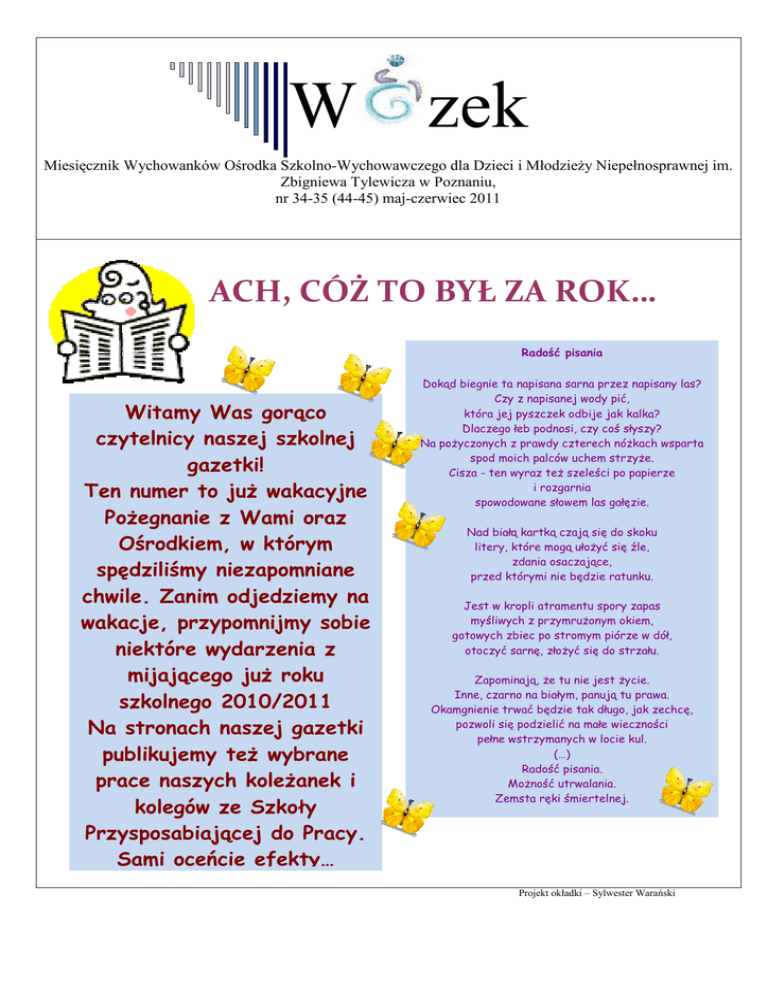 W zek Miesięcznik Wychowanków Ośrodka Szkolno-Wychowawczego dla Dzieci i MłodzieŜy Niepełnosprawnej im. Zbigniewa Tylewicza w Poznaniu, nr 34-35 (44-45) maj-czerwiec 2011 ACH, CÓŻ TO BYŁ ZA ROK… Radość pisania Witamy Was gorąco czytelnicy naszej szkolnej gazetki! Ten numer to juŜ wakacyjne PoŜegnanie z Wami oraz Ośrodkiem, w którym spędziliśmy niezapomniane chwile. Zanim odjedziemy na wakacje, przypomnijmy sobie niektóre wydarzenia z mijającego juŜ roku szkolnego 2010/2011 Na stronach naszej gazetki publikujemy teŜ wybrane prace naszych koleŜanek i kolegów ze Szkoły Przysposabiającej do Pracy. Sami oceńcie efekty… Dokąd biegnie ta napisana sarna przez napisany las? Czy z napisanej wody pić, która jej pyszczek odbije jak kalka? Dlaczego łeb podnosi, czy coś słyszy? Na poŜyczonych z prawdy czterech nóŜkach wsparta spod moich palców uchem strzyŜe. Cisza - ten wyraz teŜ szeleści po papierze i rozgarnia spowodowane słowem las gałęzie. Nad białą kartką czają się do skoku litery, które mogą ułoŜyć się źle, zdania osaczające, przed którymi nie będzie ratunku. Jest w kropli atramentu spory zapas myśliwych z przymruŜonym okiem, gotowych zbiec po stromym piórze w dół, otoczyć sarnę, złoŜyć się do strzału. Zapominają, Ŝe tu nie jest Ŝycie. Inne, czarno na białym, panują tu prawa. Okamgnienie trwać będzie tak długo, jak zechcę, pozwoli się podzielić na małe wieczności pełne wstrzymanych w locie kul. (…) Radość pisania. MoŜność utrwalania. Zemsta ręki śmiertelnej. Projekt okładki – Sylwester Warański ODSŁONIĘCIE GŁAZU Dnia 3. czerwca 2011 roku delegacja naszego Ośrodka, w której skład, oprócz pocztu sztandarowego weszli uczniowie klasy I LO pod opieką pań: Barbary Nowak i Lidii Czabańskiej, miała zaszczyt uczestniczyć w uroczystym odsłonięciu głazu pamiątkowego, poświęconego Wawrzyńcowi Engeströmowi – patronowi jednej z poznańskich ulic dzielnicy Ogrody. Uczczono w ten sposób setną rocznicę śmierci tego wielkiego poznaniaka, patrioty i społecznika Ŝyjącego w czasach, gdy Polski nie było na mapach Europy. Odsłonięcie głazu odbyło się w asyście licznie przybyłych gości, delegacji poznańskich szkół i przedszkoli dzielnicy Ogrody, a takŜe prawnuczki Engeströma, pani Dagmary Pickles, na co dzień mieszkającej w Szwecji. Po występach tanecznych dzieci z przedszkola Mały Olimpijczyk, barwny korowód, złoŜony z wszystkich gości, przeszedł ulicami Przybyszewskiego i Szamarzewskiego, by w Auli naszego Ośrodka podziwiać program artystyczny przygotowany przez Dziecięcy Zespół Folklorystyczny Cepelia – Poznań. Barbara Nowak NA CYTADELĘ CYTADEL – MARSZ! W dniu 10 czerwca Uczniowie i Nauczyciele Szkoły Przysposabiającej do Pracy wyruszyli zwiedzać Cytadelę. Wszyscy uczestnicy wycieczki mogli podziwiać Dzwon Wolności, plenerową rzeźbę Magdaleny Abakanowicz – Nierozpoznani oraz Muzeum Broni i cmentarze poznańskie na Cytadeli. Wyprawa stanie się częścią większego projektu edukacyjnego, o którym napiszemy po wakacjach. W zek WYKŁADY OTWARTE NA UAM Dnia 8 czerwca 2011 roku nasza klasa – 2 L wraz z panią wicedyrektor Ewą Michalak wzięła udział w 7 wykładzie otwartym na wydziale fizyki UAM w Poznaniu. Wykład ten kończy już 10 edycję spotkań młodzieży szkół ponadgimnazjalnych z wykładowcami wyższych uczelni. Treść wykładu prezentowanego przez pana prof. dr. hab. Ryszarda Naskręckiego nawiązywała do powstania nowego, unikatowego w skali kraju, Centrum Nano-Bio-Medycznego. Tematem wykładu była integracja fizyki , biologii i medycyny, która jak się okazuje, stała się koniecznością przy opracowywaniu coraz doskonalszych urządzeń w diagnostyce medycznej. Wielu z Was na pewno spotkało się z takimi badaniami jak np. : EEG, USG, EKG, fizykoterapia czy radioterapia. Dowiedzieliśmy się, że metody te powszechnie stosowane obecnie w medycynie nie byłyby możliwe bez rozwoju i współpracy takich dziedzin jak np. fizyka, chemia czy biologia. Aż trudno uwierzyć, że podział na odrębne dyscypliny naukowe to „wynalazek” przełomu XVIII i XIX wieku. To wtedy zaczęła tworzyć się w nauce wąska specjalizacja, bo „skupienie się na węższym problemie pozwala na osiągnięcie głębszego wglądu w zagadnienie” Największą wadą takiego podejścia jest pojawienie się w nauce różnych metod i terminologii, co powoduje oddalanie się od siebie różnych dziedzin naukowych. Zwrócił na to uwagę fizyk Richard Feymann – laureat nagrody Nobla w 1952 roku, który także dostrzegł potrzebę interdyscyplinarnego rozwiązywania problemów naukowych. Wyraził to w jakże nietypowy wydawałoby się dla fizyka sposób – wierszem : A jakiż dziwny zespół związków chemicznych znajdujemy w winie ! Jak one powstały? Mamy fermentację , enzymy , substraty i produkty. W winie znajdujemy potwierdzenie słynnego uogólnienia : wszelkie życie związane jest z fermentacją. Nie można badać chemii wina , nie odkrywając przy tym , podobnie jak Pasteur, przyczyn wielu chorób. A jak żywy wpływ wywiera wino na świadomość obserwatora ! Nasz mały umysł dla wygody dzieli tę szklankę wina, ten mały wszechświat, na działy: fizykę, biologię, geologię, astronomię, psychologię itd. Pamiętajmy jednak, że przyroda nic o tym nie wie! A więc połączmy wszystko z powrotem, nie zapominając, czemu to ma służyć … W powstającym na terenie kampusu uniwersyteckiego budynku, zatrudnieni tam naukowcy będą mieli do swojej dyspozycji unikalne, warte wiele milionów złotych, urządzenia, takie jak np. : * posturograf (badanie motoryki ciała za pomocą wzroku) * TMS (przyrząd do badania mózgu) * mikroskop AFM (służy do „ oglądania „ struktur na poziomie atomów) Wszystkie te urządzenia zaprezentowano nam na tym wykładzie. Już dzisiaj usłyszeliśmy zaproszenie skierowane do najbardziej wiernych słu
