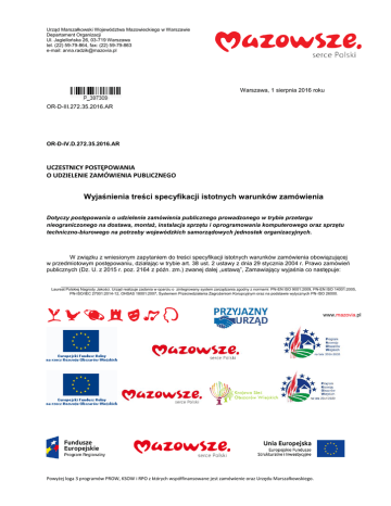 Urząd Marszałkowski Województwa Mazowieckiego w Warszawie Departament Organizacji Ul. Jagiellońska 26, 03-719 Warszawa tel. (22) 59-79-864, fax: (22) 59-79-863 e-mail: [email protected] Warszawa, 1 sierpnia 2016 roku OR-D-III.272.35.2016.AR OR-D-IV.D.272.35.2016.AR UCZESTNICY POSTĘPOWANIA O UDZIELENIE ZAMÓWIENIA PUBLICZNEGO Wyjaśnienia treści specyfikacji istotnych warunków zamówienia Dotyczy postępowania o udzielenie zamówienia publicznego prowadzonego w trybie przetargu nieograniczonego na dostawa, montaż, instalacja sprzętu i oprogramowania komputerowego oraz sprzętu techniczno-biurowego na potrzeby wojewódzkich samorządowych jednostek organizacyjnych. W związku z wniesionym zapytaniem do treści specyfikacji istotnych warunków zamówienia obowiązującej w przedmiotowym postępowaniu, działając w trybie art. 38 ust. 2 ustawy z dnia 29 stycznia 2004 r. Prawo zamówień publicznych (Dz. U. z 2015 r. poz. 2164 z późn. zm.) zwanej dalej „ustawą”, Zamawiający wyjaśnia co następuje: __________________________________________________________________________________________________________________________________ Laureat Polskiej Nagrody Jakości. Urząd realizuje zadania w oparciu o zintegrowany system zarządzania zgodny z normami: PN-EN ISO 9001:2009, PN-EN ISO 14001:2005, PN-ISO/IEC 27001:2014-12, OHSAS 18001:2007, Systemem Przeciwdziałania Zagrożeniom Korupcyjnym oraz na podstawie wytycznych PN-ISO 26000. www.mazovia.pl Powyżej loga 3 programów PROW, KSOW i RPO z których współfinansowane jest zamówienie oraz Urzędu Marszałkowskiego. Pytanie 1 Dotyczy pozycja nr 5 drukarka laserowa kolorowa sieciowa Opis drukarki wskazuje na model wycofany z produkcji przez co nie jest możliwe spełnienie wszystkich opisanych wymagań. W związku z tym, czy Zamawiający zgodzi się na zaproponowanie jego następcy posiadającego następujące parametry: - „Gramatura nośników, obsługiwana”: Podajnik 1: 60 do 176 g/m2 (do 200 g/m2 w przypadku kartek pocztowych i błyszczącego papieru fotograficznego HP Color Laser); Podajnik 2, opcjonalny podajnik 3: 60 do 163 g/m 2 (do 176 g/m2 w przypadku kartek pocztowych); Automatyczny duplekser: 60 do 163 g/m2 - „Wymiary maksymalne”: (szer. x głęb. x wys.)”: 412 x 469 x 295 mm. - „Zużycie energii”: max. 570 W (aktywność), max.17,6 (tryb gotowości), max.4,0 W (tryb uśpienia), max. 0,5 W (ręczne wyłączenie). Odpowiedź na pytanie 1 Zamawiający dopuszcza drukarkę laserową kolorową sieciową o parametrach wskazanych w pytaniu. Pytanie 2 Dotyczy pozycja nr 6 drukarka czarno biała laserowa sieciowa Opis drukarki wskazuje na model wycofany z produkcji przez co nie jest możliwe spełnienie wszystkich opisanych wymagań. W związku z tym, czy Zamawiający zgodzi się na zaproponowanie jego następcy posiadającego następujące parametry: - „Jakość wydruku (czerń, najwyższa jakość) zmianę na: Do 600 x 600 dpi. - „Panel sterowania”: Panel sterowania 2-wierszowy LCD z podświetlaniem; Przyciski (OK, Menu, Anuluj, Wstecz); Wskaźniki LED (Uwaga, Gotowość). Odpowiedź na pytanie 2 Zamawiający dopuszcza drukarkę czarno białą laserową sieciową o parametrach wskazanych w pytaniu. Pytanie 3 Dotyczy pozycja nr 8 drukarka przenośna Opis drukarki wskazuje na model wycofany z produkcji przez co nie jest możliwe spełnienie wszystkich opisanych wymagań. W związku z tym, czy Zamawiający zgodzi się na zaproponowanie jego następcy posiadającego następujące parametry: - „Prędkość (czerń, najniższa jakość, A4): do 20 str/min. - „Prędkość (kolor, najniższa jakość, A4): do 19 str/min. - „Gotowy do pracy w sieci”: Wi-Fi. - „Zewnętrzne porty wejścia/wyjścia”: 1 port USB 2.0. - „Standardowe podłączenia”: 1 port USB 2.0 + Wi-Fi. Odpowiedź na pytanie 3 Zamawiający dopuszcza drukarkę przenośną o parametrach wskazanych w pytaniu. Wyjaśnienia treści specyfikacji istotnych warunków zamówienia zostaną doręczone niezwłocznie Wykonawcom biorącym udział w postępowaniu, zamieszczone na stronie internetowej Zamawiającego www.zamowienia.mazovia.pl oraz dołączone do specyfikacji istotnych warunków zamówienia i będzie stanowić jej integralną część. Z up. Marszałka Województwa /-/ Krzysztof Strachota-Osiński Kierownik Wydziału Zamówień Publicznych Sprawę prowadzi: Anna Radzik tel. (22) 59 79 864