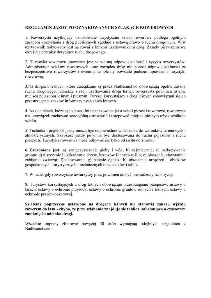 REGULAMIN JAZDY PO OZNAKOWANYCH SZLAKACH ROWEROWYCH 1. Rowerzysta użytkujący oznakowane turystyczne szlaki rowerowe podlega ogólnym zasadom korzystania z dróg publicznych zgodnie z ustawą prawo o ruchu drogowym. W/w użytkownik traktowany jest na równi z innymi użytkownikami dróg. Zasady pierwszeństwa określają przepisy dotyczące ruchu drogowego. 2. Turystyka rowerowa uprawiana jest na własną odpowiedzialność i ryzyko rowerzystów. Administrator szlaków rowerowych oraz zarządca dróg nie ponosi odpowiedzialności za bezpieczeństwo rowerzystów i ewentualne szkody powstałe podczas uprawiania turystyki rowerowej. 3.Na drogach leśnych, które zarządzane są przez Nadleśnictwo obowiązują ogólne zasady ruchu drogowego, jednakże z racji użytkowania drogi leśnej, rowerzysta powinien ustąpić miejsca pojazdom leśnym i pieszym. Turyści korzystający z dróg leśnych zobowiązani się do przestrzegania znaków informacyjnych służb leśnych. 4. Na odcinkach, które są jednocześnie oznakowane jako szlaki piesze i rowerowe, rowerzysta ma obowiązek zachować szczególną ostrożność i ustępować miejsca pieszym użytkownikom szlaku. 5. Technika i prędkość jazdy muszą być odpowiednie w stosunku do warunków terenowych i atmosferycznych. Szybkość jazdy powinna być dostosowana do ruchu pojazdów i ruchu pieszych. Turystyka rowerowa może odbywać się tylko od świtu do zmroku. 6. Zabronione jest: a) zanieczyszczanie gleby i wód; b) zaśmiecanie; c) rozkopywanie gruntu; d) niszczenie i uszkadzanie drzew, krzewów i innych roślin; e) płoszenie, chwytanie i zabijanie zwierząt; f)hałasowanie; g) palenie ognisk; h) niszczenie urządzeń i obiektów gospodarczych, turystycznych i technicznych oraz znaków i tablic. 7. W razie, gdy rowerzyście towarzyszy pies, powinien on być prowadzony na smyczy. 8. Turystów korzystających z dróg leśnych obowiązuje przestrzeganie przepisów: ustawy o lasach, ustawy o ochronie przyrody, ustawy o ochronie gruntów rolnych i leśnych, ustawy o ochronie przeciwpożarowej. Szlabany poprzeczne ustawione na drogach leśnych nie stanowią zakazu wjazdu rowerem do lasu - chyba, że przy szlabanie znajduje się tablica informująca o czasowym zamknięciu odcinka drogi. Wszelkie imprezy zbiorowe powyżej 30 osób wymagają odrębnych uzgodnień z Nadleśnictwem.