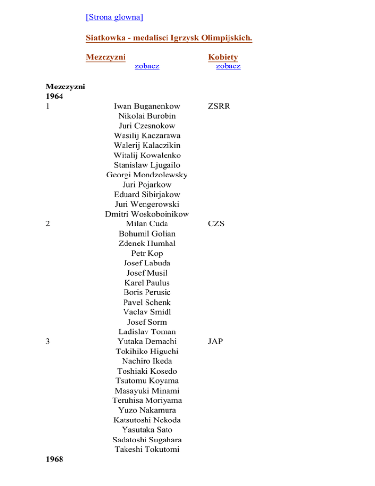 [Strona glowna] Siatkowka - medalisci Igrzysk Olimpijskich. Mezczyzni zobacz Mezczyzni 1964 1 2 3 1968 Iwan Buganenkow Nikolai Burobin Juri Czesnokow Wasilij Kaczarawa Walerij Kalaczikin Witalij Kowalenko Stanislaw Ljugailo Georgi Mondzolewsky Juri Pojarkow Eduard Sibirjakow Juri Wengerowski Dmitri Woskoboinikow Milan Cuda Bohumil Golian Zdenek Humhal Petr Kop Josef Labuda Josef Musil Karel Paulus Boris Perusic Pavel Schenk Vaclav Smidl Josef Sorm Ladislav Toman Yutaka Demachi Tokihiko Higuchi Nachiro Ikeda Toshiaki Kosedo Tsutomu Koyama Masayuki Minami Teruhisa Moriyama Yuzo Nakamura Katsutoshi Nekoda Yasutaka Sato Sadatoshi Sugahara Takeshi Tokutomi Kobiety zobacz ZSRR CZS JAP 1 2 3 1972 1 Oleg Antropow Wladimir Bielaiew Iwan Bugaenkow Wladimir Iwanow Waleri Krawczenko Jewgienj Lapinski Wasilius Matuszewas Wiktor Michalczuk Gieorgij Mondzolewski Juri Pojarkow Eduard Sibirjakow Boris Tereszczuk Nachiro Ikeda Kenji Kimura Isao Koizumi Masayuki Minami Yasuaki Mitsumori Jungo Morita Katsutoshi Nekoda Seiji Oko Tetsuo Sato Kenji Shimaoka Mamoru Shiragami Tadayoshi Yokota Bohumil Golian Zdenek Groessel Petr Kop Drahomir Koudelka Josef Musil Vladimir Petlak Antonin Prochazka Pavel Schenk Josef Smolka Frantisek Sokol Jiri Svoboda Lubomir Zajisek Yoshihide Fukao Kenji Kimura Masayuki Minami Jungo Morita Yuzo Nakamura Katsutoshi Nekoda Tetsuo Nishimoto Yasuhiro Noguchi Seiji Oko ZSRR JAP CZS JAP 2 3 1976 1 2 Tetsuo Sato Kenji Shimaoka Tadayoshi Yokota Horst Hagen Wolfgang Lowe Wolfgang Maibohm Jurgen Maune Horst Peter Eckehard Pietzsch Siegfried Schneider Arnold Schulz Rudi Schumann Rainer Tscharke Wolfgang Webner Wolfgang Weise Wiktor Borszcz Jefim Chulak Wiaczeslaw Domani Wladimir Kondra Walerij Krawczenko Jewgienij Lapinsky Wladimir Patkin Juri Poyarkow Wladimir Putjatow Aleksandr Saprykin Juri Starunski Leonid Zaiko Bronislaw Bebel Zbigniew Zarzycki Tomasz Wojtowicz Wlodzimierz Stefanski Edward Skorek Wlodzimierz Sadalski Miroslaw Rybaczewski Lech Lasko Zbigniew Lubiejewski Marek Karbarz Wieslaw Gawlowski Ryszard Bosek Wladimir Czerniszew Jefim Chulak Wladimir Doroczow Aleksandr Ermilow Wladimir Kondra Oleg Moliboga NRD ZSRR POL ZSRR 3 1980 1 2 3 Anatoli Poliszczuk Aleksandr Sawin Pawel Seliwanow Juri Starunski Wladimir Ulanow Wiaczeslaw Zajcew Alfredo Figueredo Ricardo Victor Garcia Campos Diego Lapera Sotolongo Leonel Marshall Steward Lorenzo Martinez Cordero Ernesto Martinez Hernandez Jorge Perez Vento Machado Antonio Rodriguez Aguirre Carlos Salas Perez Victoriano Sarmientos Bios Jesus Savigne Savigne Raul Vilches More Wladimir Czernyszew Wladimir Doroczow Aleksandr Ermilow Wladimir Kondra Walerij Kriwow Fiodor Laszczenow Viliar Loor Oleg Moliboga Juri Panczenko Aleksandr Sawin Pawel Seliwanow Wiaczeslaw Zajcew Jordan Angelow Dimitr Dimitrow Stefan Dimitrow Stoian Gunczew Christo Iliew Petko Petko2 Kaspar Simeonow Christo Stoianow Mitko Todorow Tsano Tsanow Emil Waltczew Dimitr Zlatanow Marius Cata-Chitiga Valter Corneliu Chifu Laurentiu Dumanoiu KUB ZSRR BUL RUM Günther Enescu Dan Girleanu Sorin Macavei Viorel Manole Florin Mina Corneliu Oros Neculae Vasile Pop Constantin Sterea Nicu Stoian 1984 1 2 3 Aldis Imants Berzins USA Craig Werner Buck Richard Lloyd Duwelius Douglas Scott Dvorak Charles Kiraly Christian Marlowe Patrick Robert Powers Steven Edward Salmons David Patrick Saunders Paul Benedict Sunderland Steven Dennis Timmons Mark Waldie Rui Campos Nascimento BRA William Carvalho Carvalho Da Silva Renan Dal Zotto Fernando De Avila Marcus Freire Domingo Lampariello Neto Jose Montanaro Mario Xando Oliveira Nego Bernard Rajzman Antonio Ribeiro Amauri Ribeiro Bernardo Rocha Rocha Rezende Franco Bertoli WLO Grancesco Dall'Olio Giancarlo Dametto Guido De Luigi Giovanni Errichiello Giovanni Lanfranco Pier Paolo Lucchetta Andrea Lucchetta Marco Negri Piero Rebaudengo Paolo Vecchi Fabio Vullo 1988 1 2 3 1992 1 Craig Werner Buck Robert Jan Ctvrtlik Scott Thomas Fortune Charles Kiraly Ricci Judson Luyties Robert Douglas Partie Jonathan Edward Root Eric Teruo Sato David Patrick Saunders Jeffrey Malcolm Stork Troy R. Tanner Steven Dennis Timmons Jaroslaw Antonow Juri Czerednik Jewgienij Krasilnikow Andriej Kuzniecow Waleri Losew Juri Panczenko Igor Runow Juri Sapega Wladimir Szkurikin Aleksandr Sorokolet Raimundas Vilde Wiaczeslaw Zajcew Daniel Jorge Castellani Daniel M. Colla Hugo Nestor Conte Juan Carlos Cuminetti Esteban De Palma Alejandro Diz Waldo Ariel Kantor Esteban Eduardo Martinez Raul Nicolas Quiroga Jon Emili Uriarte Carlos Weber Claudio F. Zulianello USA Jorge Edson Brito Janelson Carvalho Douglas Chiarotti Andre Felippe Ferreira Giovane Gavio Antonio Carlos Gouveia Mauricio Lima BRA ZSRR ARG 2 3 1996 1 2 Marcelo Negrao Talmo Oliveira Amauri Ribeiro Alexandre Samuel Paulo Andre Silva Edwin Benne Peter Blange Ronald Boudrie Henk-Jan Held Marko Klok Jan Posthuma Avital Selinger Martin Teffer Martin Van Der Horst Olof Van Der Meulen Ronald Zoodsma Ronald Zwerver Nick Adrian Becker Carlos Martin Briceno Robert Jan Ctvrtlik Scott Thomas Fortune Daniel Robert Greenbaum Brent William Hilliard Bryan Eric Ivie Robert Douglas Partie Robert Lewis Samuelson Eric Anthony Sato Jeffrey Malcolm Stork Stephen Dennis Timmons Peter Blange Guido Gortzen Rob Grabert Henk-Jan Held Misha Latuhihin Jan Posthuma Brecht Rodenburg Richard Schuil Bas Van De Goor Mike Van De Goor Olof Van Der Meulen Ronald Zwerver Lorenzo Bernardi Vigor Bovolenta Marco Bracci Luca Cantagalli HOL USA HOL WLO 3 2000 1 2 3 Andrea Gardini Andrea Giani Pasquale Gravina Marco Meoni Samuele Papi Andrea Sartoretti Paolo Tofoli Andrea Zorzi Vladimir Batez Dejan Brdjovic Djordje Djuric Andrija Geric Vladimir Grbic Nikola Grbic Rajko Jokanovic Slobodan Kovac Dula Mester Zarko Petrovic Zeljko Tanaskovic Goran Vujevic Vladimir Batez Slobodan Boskan Andrija Geric Vladimir Grbic Nikola Grbic Slobodan Kovac Djula Mester Vasa Mijic Ivan Miljkovic Veljko Petkovic Goran Vujevic Igor Vusurovic Igor Czoulepow Walerij Gorjuszew Aleksandre Guerassim