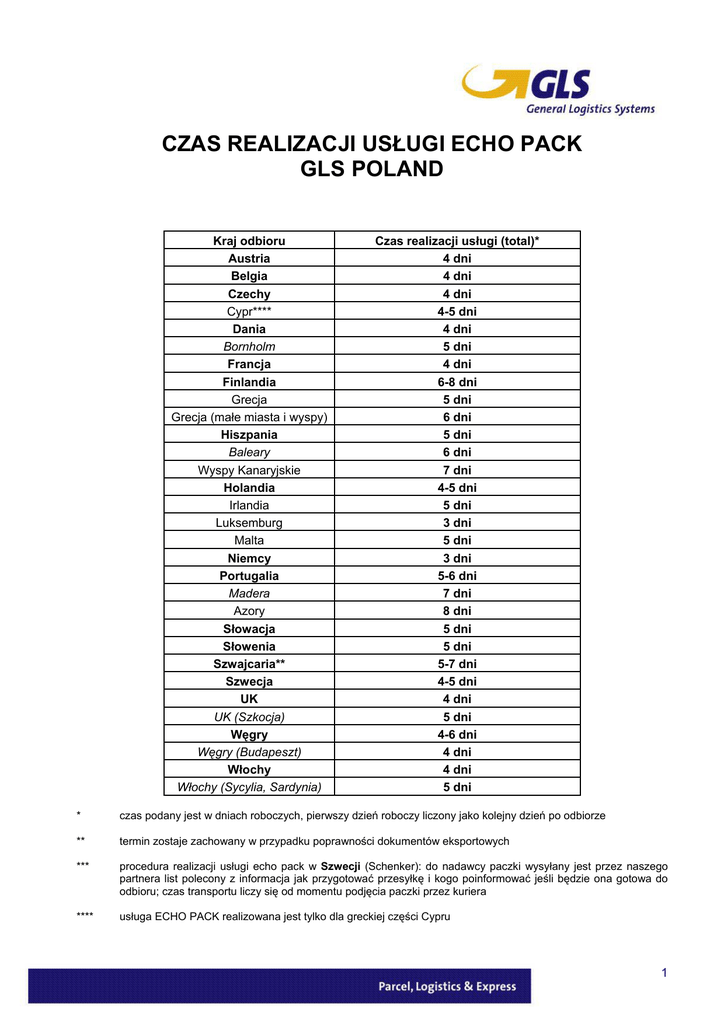 CZAS REALIZACJI USŁUGI ECHO PACK GLS POLAND Kraj odbioru Austria Belgia Czechy Cypr**** Dania Bornholm Francja Finlandia Grecja Grecja (małe miasta i wyspy) Hiszpania Baleary Wyspy Kanaryjskie Holandia Irlandia Luksemburg Malta Niemcy Portugalia Madera Azory Słowacja Słowenia Szwajcaria** Szwecja UK UK (Szkocja) Węgry Węgry (Budapeszt) Włochy Włochy (Sycylia, Sardynia) Czas realizacji usługi (total)* 4 dni 4 dni 4 dni 4-5 dni 4 dni 5 dni 4 dni 6-8 dni 5 dni 6 dni 5 dni 6 dni 7 dni 4-5 dni 5 dni 3 dni 5 dni 3 dni 5-6 dni 7 dni 8 dni 5 dni 5 dni 5-7 dni 4-5 dni 4 dni 5 dni 4-6 dni 4 dni 4 dni 5 dni * czas podany jest w dniach roboczych, pierwszy dzień roboczy liczony jako kolejny dzień po odbiorze ** termin zostaje zachowany w przypadku poprawności dokumentów eksportowych *** procedura realizacji usługi echo pack w Szwecji (Schenker): do nadawcy paczki wysyłany jest przez naszego partnera list polecony z informacja jak przygotować przesyłkę i kogo poinformować jeśli będzie ona gotowa do odbioru; czas transportu liczy się od momentu podjęcia paczki przez kuriera **** usługa ECHO PACK realizowana jest tylko dla greckiej części Cypru 1