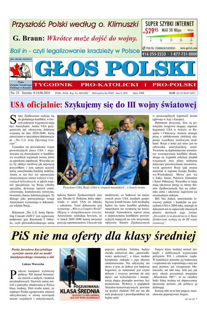 Przysz³oœæ Polski wed³ug o. Klimuszki G. Braun: Wkrótce może dojść do wojny. Bail in - czyli legalizowanie kradzie¿y w Polsce BÓG - HONOR - OJCZYZNA Pismo Zwi¹zku Narodowego Polskiego w Kanadzie TYGODNIK No. 23 Toronto 8-14.06.2016 PRO-KATOLICKI PUBL. MAIL. Reg. No. 40012402 Delivered to the POST: June 8, 2016 since 1908 i PRO-POLSKI $1.50 ($1.43+$0.07 GST) USA oficjalnie: Szykujemy siê do III wojny œwiatowej S tany Zjednoczone szykują się do globalnego konfliktu, w którym jedynymi wygranymi mają być Amerykanie. Armia USA przygotowała już ofensywną doktrynę wojenną na lata 2020-2040, którą streszczono w specjalnym dokumencie pt. „The U.S. Army Operating Concept”. Uzasadnia on prowadzenie wojen prewencyjnych przez USA i angażowanie się Amerykanów w konflikty we wszelkich regionach świata, które są ogniskami zapalnymi. Wszystko po to, by zdobyć możliwie jak najwięcej przyczółków i tym samym uczynić armię amerykańską bardziej mobilną. Armia ta ma być też operacyjnie elastyczniejsza i umieć walczyć w tzw. wojnach hybrydowych, w jakich ostatnio specjalizuje się Rosja (służby specjalne, dywersja tajnych armii, cyberwojny, kontrolowany terroryzm, tworzenie chaosu informacyjnego). To dlatego jako potencjalnego wroga Amerykanie wymieniają w dokumencie właśnie Rosję... Dokument „The U.S. Army Operating Concept (AOC)” jest sygnowany podpisami: gen. Raymonda T. Odierno, czyli głównodowodzącego armią Prezydenci USA, Rosji i Chin w strojach masońskich... o losach świata. lądową Stanów Zjednoczonych oraz gen. Davida G. Perkinsa, który odpowiada w armii USA za taktykę i szkolenia. Tytuł dokumentu jest wymowny: „Win in a Complex World” (Wygraj w skomplikowanym świecie). Amerykanie zakładają bowiem, że w latach 2020–2040 muszą utrzymać pozycję supermocarstwa. Chcą nie tyle moderować, co budować na narzuconych przez USA zasadach geopolityczny kształt świata. Jeśli niezbędny będzie ku temu konflikt globalny, Amerykanie nie wystraszą się konsekwencji. Generałowie wprost piszą o rozpoczynaniu konfliktów prewencyjnych mających na celu utrzymanie wpływów Stanów Zjednoczonych w poszczególnych regionach świata (głównie w Azji i Europie). Dokument precyzuje, kim są potencjalni wrogowie mogący zagrażać hegemonii USA w świecie: to Rosjanie i Chińczycy. Autorzy strategii piszą o zablokowaniu chińskiej ekspansji wszelkimi możliwymi środkami. Rosja z kolei już teraz jest na celowniku amerykańskiej armii. Tworzone są dyplomatyczne scenariusze rozwiązywania konfliktu ukraińskiego na wypadek eskalacji działań wojennych oraz plany militarne dotyczące powstrzymania mocarstwowych apetytów Rosji (jak można mniemać w regionie Europy Środkowo-Wschodniej). Mowa jest też o Iraku, Iranie, Państwie Islamskim i Korei Północnej. Wszystkie te kraje mają odczuwać presję ze strony Stanów Zjednoczonych, być na celowniku armii i odczuwać zagrożenie jej ewentualnym atakiem. Bill Van Auken, amerykański lewicowy polityk i kandydat na prezydenta USA w 2004 roku, ostrzegł, że dokument ten to zapowiedź strasznych planów możnych tego świata. „Stwierdził, że to dowód na to, iż Stany Zjednoczone szykują się do III wojny światowej”. PiS nie ma oferty dla klasy średniej Partia Jarosława Kaczyńskiego wyraźnie stawia dziś na model skandynawskiego równania w dół P Łukasz Warzecha odczas kampanii wyborczej politycy PiS niemal bezustannie mówili o małych i średnich przedsiębiorcach. Niewiele mniej mówili o potrzebie zbudowania w Polsce klasy średniej. Dziś trzeba uznać, że rządzące Polską ugrupowanie zmierza zdecydowanie w stronę rozwiązań mocno socjalnych i etatystycznych, poprzez politykę fiskalną będzie chciało realizować idee „sprawiedliwości społecznej”, a klasa średnia kompletnie zniknęła z jego obszaru zainteresowania. Nie usłyszymy ani słowa o tym, że dobrze jest budować bogactwo, że zamożność jest czymś dobrym i wszyscy powinni do niej dążyć, zaś wykształcenie i kompetencje dające pieniądze powinny być premiowane. Wyborcy o poglądach liberalno-konserwatywnych powinni się pozbyć złudzeń: PiS nie ma dla nich propozycji i prawdopodobnie nie będzie miał. Pojęcie klasy średniej niemal zniknęło z publicznych wypowiedzi polityków PiS i członków rządu. W kontekście potrzeby jej budowania i wspierania nie wspominają o niej ani pani premier, ani wicepremier Morawiecki, ani nikt inny. Jeśli już, jak przy okazji prezentacji programu „Mieszkanie 500+”, to na zasadzie łaski: klasę średnią też dopuszczamy (pozostaje pytanie, jak politycy ją definiują). Karierę robi za to inne pojęcie, nacechowane pejoratywnie: bogaci. cd. na str. 7 STRONA 2 POLSKA - ŚWIAT G£OS POLSKI nr 23 8-14.06.2016 Interesy USA ważniejsze od bezpieczeństwa Polski? MON: Polska stanie na syryjskim froncie Minister obrony narodowej Antoni Macierewicz oficjalnie zadeklarował czynne włączenie się polskich sił w konflikt zbrojny na Bliskim Wschodzie. Do Syrii wysłane zostaną siły specjalne oraz myśliwce F-16. Nasi żołnierze mają rzekomo prowadzić akcje szkoleniowe i rozpoznawcze, a przewidywane miejsce ich stacjonowania to Jordania lub Kuwejt. Na Morze Egejskie ma także trafić polska fregata rakietowa ORP Generał Tadeusz Kościuszko. Taki ruch rządu Prawa i Sprawiedliwości nie może nie spotkać się z krytyką. To polityka prowadząca donikąd, narażająca nasz, przynajmniej na razie - bezpieczny kraj na odwet z Bliskiego Wschodu. Po latach konfliktu syryjska prawica nazywa Amerykanów mordercami. Jeśli włączymy się w działania w tym kraju, taka łatka może przylgnąć i do nas. Internet aż huczy od plotek, że polskie siły miałyby stanąć ramię w ramię z wspierającą dżihadystów armią Stanów Zjednoczonych. Mielibyśmy zatem wspierać Amerykanów w walce o interesy związane m.in. z handlem ropą, zarazem występuj