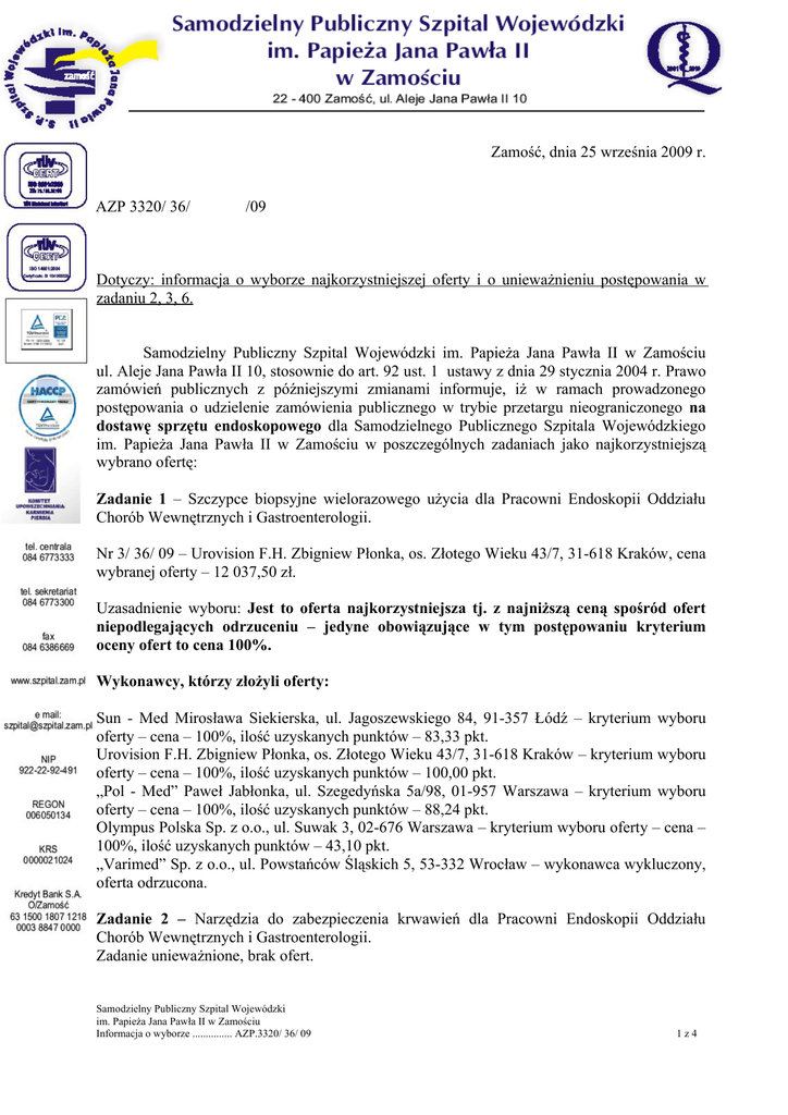 Zamość, dnia 16 kwietnia 2009 r Zamość, dnia 25 września 2009 r. AZP 3320/ 36/ /09 Dotyczy: informacja o wyborze najkorzystniejszej oferty i o unieważnieniu postępowania w zadaniu 2, 3, 6. Samodzielny Publiczny Szpital Wojewódzki im. Papieża Jana Pawła II w Zamościu ul. Aleje Jana Pawła II 10, stosownie do art. 92 ust. 1 ustawy z dnia 29 stycznia 2004 r. Prawo zamówień publicznych z późniejszymi zmianami informuje, iż w ramach prowadzonego postępowania o udzielenie zamówienia publicznego w trybie przetargu nieograniczonego na dostawę sprzętu endoskopowego dla Samodzielnego Publicznego Szpitala Wojewódzkiego im. Papieża Jana Pawła II w Zamościu w poszczególnych zadaniach jako najkorzystniejszą wybrano ofertę: Zadanie 1 – Szczypce biopsyjne wielorazowego użycia dla Pracowni Endoskopii Oddziału Chorób Wewnętrznych i Gastroenterologii. Nr 3/ 36/ 09 – Urovision F.H. Zbigniew Płonka, os. Złotego Wieku 43/7, 31-618 Kraków, cena wybranej oferty – 12 037,50 zł. Uzasadnienie wyboru: Jest to oferta najkorzystniejsza tj. z najniższą ceną spośród ofert niepodlegających odrzuceniu – jedyne obowiązujące w tym postępowaniu kryterium oceny ofert to cena 100%. Wykonawcy, którzy złożyli oferty: Sun - Med Mirosława Siekierska, ul. Jagoszewskiego 84, 91-357 Łódź – kryterium wyboru oferty – cena – 100%, ilość uzyskanych punktów – 83,33 pkt. Urovision F.H. Zbigniew Płonka, os. Złotego Wieku 43/7, 31-618 Kraków – kryterium wyboru oferty – cena – 100%, ilość uzyskanych punktów – 100,00 pkt. „Pol - Med” Paweł Jabłonka, ul. Szegedyńska 5a/98, 01-957 Warszawa – kryterium wyboru oferty – cena – 100%, ilość uzyskanych punktów – 88,24 pkt. Olympus Polska Sp. z o.o., ul. Suwak 3, 02-676 Warszawa – kryterium wyboru oferty – cena – 100%, ilość uzyskanych punktów – 43,10 pkt. „Varimed” Sp. z o.o., ul. Powstańców Śląskich 5, 53-332 Wrocław – wykonawca wykluczony, oferta odrzucona. Zadanie 2 – Narzędzia do zabezpieczenia krwawień dla Pracowni Endoskopii Oddziału Chorób Wewnętrznych i Gastroenterologii. Zadanie unieważnione, brak ofert. Samodzielny Publiczny Szpital Wojewódzki im. Papieża Jana Pawła II w Zamościu Informacja o wyborze ............... AZP.3320/ 36/ 09 1z4 Zadanie 3 – Polipektomia dla Pracowni Endoskopii Oddziału Chorób Wewnętrznych i Gastroenterologii. Zadanie unieważnione, brak ofert. Zadanie 4 – Osprzęt dla Pracowni Endoskopii Oddziału Chorób Wewnętrznych i Gastroenterologii. Nr 4/ 36/ 09 – „Pol - Med „ Paweł Jabłonka, ul. Szegedyńska 5a/98, 01-957 Warszawa, cena wybranej oferty – 5 350,50 zł. Uzasadnienie wyboru: Jest to oferta najkorzystniejsza tj. z najniższą ceną – jedyne obowiązujące w tym postępowaniu kryterium oceny ofert to cena 100%. Wykonawcy, którzy złożyli oferty: „Pol - Med „ Paweł Jabłonka, ul. Szegedyńska 5a/98, 01-957 Warszawa – kryterium wyboru oferty – cena – 100%, ilość uzyskanych punktów – 100,00 pkt. Hammermed Sp. z o.o., Sp. k., ul. Kopcińskiego 73/75, 90-033 Łódź – kryterium wyboru oferty – cena – 100%, ilość uzyskanych punktów – 47,25 pkt. Olympus Polska Sp. z o.o., ul. Suwak 3, 02-676 Warszawa – kryterium wyboru oferty – cena – 100%, ilość uzyskanych punktów – 54,01 pkt. Zadanie 5 – Filtry do posiadanego przez Zamawiającego ssaka firmy Olympus KV4 - 8 opakowań (80 szt.) dla Pracowni Endoskopii Oddziału Chorób Wewnętrznych i Gastroenterologii. Nr 6/ 36/ 09 – Olympus Polska Sp. z o.o., ul. Suwak 3, 02-676 Warszawa, cena wybranej oferty – 5 660,80 zł. Uzasadnienie wyboru: Jest to oferta najkorzystniejsza tj. z najniższą ceną – jedyne obowiązujące w tym postępowaniu kryterium oceny ofert to cena 100%. Wykonawcy, którzy złożyli oferty: Olympus Polska Sp. z o.o., ul. Suwak 3, 02-676 Warszawa – kryterium wyboru oferty – cena – 100%, ilość uzyskanych punktów – 100,00 pkt. Zadanie 6 – Filtry Endo-jet do posiadanego przez Zamawiającego urządzenia do płukania firmy Pauldrach Medical nr ser. 470694 dla Pracowni Endoskopii Oddziału Chorób Wewnętrznych i Gastroenterologii. Zadanie unieważnione, brak ofert. Zadanie 7 – Lampy do źródła kompatybilne że źródłem światła firmy Fujinon dla Pracowni Endoskopii Oddziału Chorób Wewnętrznych i Gastroenterologii - 15 szt. Nr 2/ 36/ 09 – Wojnarowscy Sp. z o.o., ul. Gospodarcza 16, 40-432 Katowice, cena wybranej oferty – 823,50 zł. Uzasadnienie wyboru: Jest to oferta najkorzystniejsza tj. z najniższą ceną – jedyne Samodzielny Publiczny Szpital Wojewódzki im. Papieża Jana Pawła II w Zamościu Informacja o wyborze ............... AZP.3320/ 36/ 09 2z4 obowiązujące w tym postępowaniu kryterium oceny ofert to cena 100%. Wykonawcy, którzy złożyli oferty: Wojnarowscy Sp. z o.o., ul. Gospodarcza 16, 40-432 Katowice – kryterium wyboru oferty – cena – 100%, ilość uzyskanych punktów – 100,00 pkt. Zadanie 8 – Sprzęt endoskopowy zabiegowy dla Pracowni Endoskopii Oddziału Chirurgii. Nr 5/ 36/ 09 – Hammermed Sp. z o.o., Sp. k., ul. Kopcińskiego 73/75, 90-033 Łódź, cena wybranej oferty – 176 083,96 zł. Uzasadnienie wyboru: Jest to oferta najkorzystniejsza tj. z najniższą ceną – jedyne obowiązujące w tym postępowaniu kryterium oceny ofert to cena 100%. Wykonawcy, którzy złożyli oferty: Hammermed Sp. z o.o., Sp. k., ul. Kopcińskiego 73/75, 90-033 Łódź – kryterium wyboru oferty – cena – 100%, ilość uzyskanych punktów – 100,00 pkt. Zadanie 9 - Sprzęt endoskopowy do badań dla Pracowni Endoskopii Oddziału Chirurgii. Nr 6/ 36/ 09 – Olympus Polska Sp. z o.o., ul. Suwak 3, 02-676 Warszawa, cena wybranej oferty – 131 439,87 zł. Uzasadnienie wyboru: Jest to oferta najkorzystniejsza tj. z najniższą ceną – jedyne obowiązujące w tym postępowaniu kryterium oceny ofert to cena 100%. Wykonawcy, którzy złożyli oferty: Olympus Polska Sp. z o
