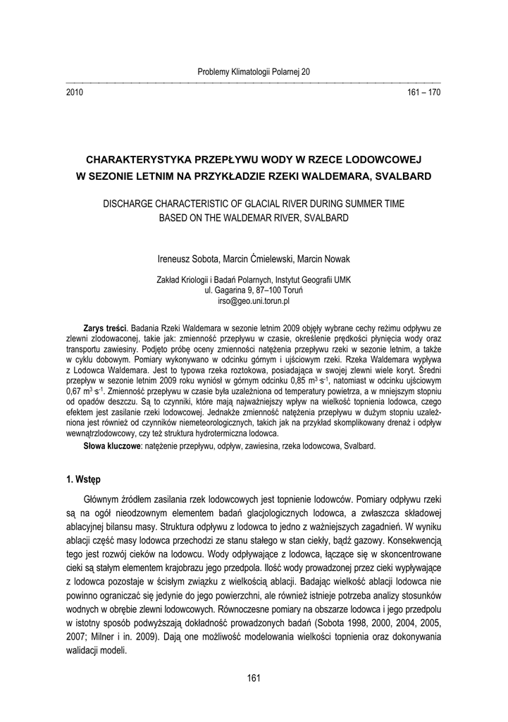 Problemy Klimatologii Polarnej 20 ⎯⎯⎯⎯⎯⎯⎯⎯⎯⎯⎯⎯⎯⎯⎯⎯⎯⎯⎯⎯⎯⎯⎯⎯⎯⎯⎯⎯⎯⎯⎯⎯⎯⎯⎯⎯⎯⎯⎯⎯⎯⎯⎯⎯⎯⎯ 2010 161 – 170 CHARAKTERYSTYKA PRZEPŁYWU WODY W RZECE LODOWCOWEJ W SEZONIE LETNIM NA PRZYKŁADZIE RZEKI WALDEMARA, SVALBARD DISCHARGE CHARACTERISTIC OF GLACIAL RIVER DURING SUMMER TIME BASED ON THE WALDEMAR RIVER, SVALBARD Ireneusz Sobota, Marcin Ćmielewski, Marcin Nowak Zakład Kriologii i Badań Polarnych, Instytut Geografii UMK ul. Gagarina 9, 87–100 Toruń [email protected] Zarys treści. Badania Rzeki Waldemara w sezonie letnim 2009 objęły wybrane cechy reżimu odpływu ze zlewni zlodowaconej, takie jak: zmienność przepływu w czasie, określenie prędkości płynięcia wody oraz transportu zawiesiny. Podjęto próbę oceny zmienności natężenia przepływu rzeki w sezonie letnim, a także w cyklu dobowym. Pomiary wykonywano w odcinku górnym i ujściowym rzeki. Rzeka Waldemara wypływa z Lodowca Waldemara. Jest to typowa rzeka roztokowa, posiadająca w swojej zlewni wiele koryt. Średni przepływ w sezonie letnim 2009 roku wyniósł w górnym odcinku 0,85 m3·s-1, natomiast w odcinku ujściowym 0,67 m3·s-1. Zmienność przepływu w czasie była uzależniona od temperatury powietrza, a w mniejszym stopniu od opadów deszczu. Są to czynniki, które mają najważniejszy wpływ na wielkość topnienia lodowca, czego efektem jest zasilanie rzeki lodowcowej. Jednakże zmienność natężenia przepływu w dużym stopniu uzależniona jest również od czynników niemeteorologicznych, takich jak na przykład skomplikowany drenaż i odpływ wewnątrzlodowcowy, czy też struktura hydrotermiczna lodowca. Słowa kluczowe: natężenie przepływu, odpływ, zawiesina, rzeka lodowcowa, Svalbard. 1. Wstęp Głównym źródłem zasilania rzek lodowcowych jest topnienie lodowców. Pomiary odpływu rzeki są na ogół nieodzownym elementem badań glacjologicznych lodowca, a zwłaszcza składowej ablacyjnej bilansu masy. Struktura odpływu z lodowca to jedno z ważniejszych zagadnień. W wyniku ablacji część masy lodowca przechodzi ze stanu stałego w stan ciekły, bądź gazowy. Konsekwencją tego jest rozwój cieków na lodowcu. Wody odpływające z lodowca, łączące się w skoncentrowane cieki są stałym elementem krajobrazu jego przedpola. Ilość wody prowadzonej przez cieki wypływające z lodowca pozostaje w ścisłym związku z wielkością ablacji. Badając wielkość ablacji lodowca nie powinno ograniczać się jedynie do jego powierzchni, ale również istnieje potrzeba analizy stosunków wodnych w obrębie zlewni lodowcowych. Równoczesne pomiary na obszarze lodowca i jego przedpolu w istotny sposób podwyższają dokładność prowadzonych badań (Sobota 1998, 2000, 2004, 2005, 2007; Milner i in. 2009). Dają one możliwość modelowania wielkości topnienia oraz dokonywania walidacji modeli. 161 161 Reżim rzeki lodowcowej jest wynikiem aktywnego drenażu powierzchniowego, wewnątrz- i podlodowcowego. Niezależnie jak szybko przebiega proces drenażu i jak silnie oddziałuje czynnik termiczno-radiacyjny, wielkość odpływu ze zlewni lodowcowej w sezonie letnim jest funkcją ablacji lodowca, a dopiero w drugiej kolejności lokalnych źródeł zasilania cieku (takich jak m.in. wody opadowe, wody z tajania wieloletniej zmarzliny) – ryc. 1. Zdecydowana większość, bo aż 85-90% objętości wody odpływa ze zlewni polarnych w okresie wiosny i lata (Bartoszewski 1998, 2002; Leszkiewicz 1982, Rachlewicz 2007). Niewielki odpływ zachodzi także w porze zimowej, czego dowodem są spotykane często pokrywy nalodziowe (Grześ i Sobota 2000, Sobota 2009). Odpływ rzeki lodowcowej jest ściśle uzależniony od warunków topnienia lodowca, stanowiąc sumę odpływu szybkiego i opóźnionego (Collins 1978, 1979). Ryc. 1. Uproszczony schemat odpływu wody w rzece lodowcowej Fig. 1.The simple scheme of glacier river outflow Badania Rzeki Waldemara we wcześniejszych latach były prowadzone przez uczestników wypraw polarnych UMK (m.in. Szczepanik 1977, Szczepanik i Marciniak 1989, Pietrucień i in. 1989, Pietrucień i Szczepanik 1982, Sobota 1997, 1998, 2000, 2005, 2007). Dotyczyły one reżimu odpływu rzeki, transportu materiału unoszonego, termiki jej wód, a także struktury odpływu. Celem badań Rzeki Waldemara było określenie wybranych cech reżimu odpływu ze zlewni zlodowaconej, takich jak: zmienność natężenia przepływu w czasie, określenie prędkości płynięcia wody oraz transportu zawiesiny w sezonie letnim 2009, również w cyklu dobowym. 2. Obszar i metody badań Rzeka Waldemara wypływa z Lodowca Waldemara. Jest to typowa rzeka roztokowa, posiadająca w swojej zlewni wiele koryt. Należy ona do najdłuższych rzek Kaffiøyry. W sezonie letnim 2009 roku 162 162 główne koryto rzeki miało długość około 7 km. Kaffiøyra należy do Ziemi Oscara II. Jest to nizina nadmorska położona nad brzegami cieśniny Forland, zlokalizowana na NW Spitsbergenie. Cieki odprowadzające wodę z Lodowca Waldemara łączą się na jego bezpośrednim przedpolu, formując zwarte koryto. Rzeka licznymi kaskadami spływa przełomem wyciętym w wale morenowym nałożonym na podwyższonym progu skalnym. Od przełomu rzeka płynie na krótkim odcinku zwartym korytem, po czym zaczyna się dzielić na więcej strug (ryc. 2). Daje się jednak wśród nich wyróżnić koryto główne (Pietrucień i Szczepanik 1982, Sobota 1998, 2000, 2005). W środkowym odcinku rzeka płynie po sandrze, rozcinając go często na niewielkie płaty wyspowe. Rzeka Waldemara uchodzi do cieśniny Forland. W strefie ujściowej obserwowane jest często wlewanie się wód morskich. Ryc. 2. Mapa lokalizacji punktów pomiarowych w zlewni Rzeki Waldemara. 1 – lodowiec, 2 – strefa marginalna, 3 – sandr, 4 – grzbiety górskie, 5 – podniesione terasy morskie, 6 – rzeki, 7 – poziomice, 8 – dział wodny Fig. 2. Location map of meas