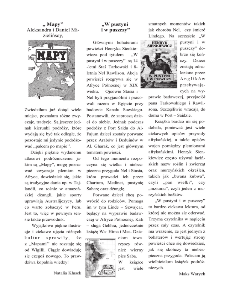 ,, Mapy’’ Aleksandra i Daniel Mizielińscy, Zwiedziłam już dotąd wiele miejsc, poznałam różne zwyczaje, tradycje. Są jeszcze jednak kierunki podróży, które wydają się być tak odległe, że pozostaje mi jedynie podróżować ,,palcem po mapie’’. Dzięki pięknie wydanemu atlasowi podróżniczemu jakim są „Mapy”, mogę poznawać zwyczaje plemion w Afryce, dowiedzieć się, jakie są tradycyjne dania np. w Tajlandii, co rośnie w amazońskiej dżungli, jakie sporty uprawiają Australijczycy, lub co warto zobaczyć w Peru. Jest to, więc w pewnym sensie także przewodnik. Wyjątkowo piękne ilustracje i ciekawe ujęcia różnych kult ur sprawiły, że z ,,Mapami’’ nie rozstaję się od Wigilii. Ciągle dowiaduję się czegoś nowego. To prawdziwa kopalnia wiedzy! Natalia Kłusek „W pustyni i w puszczy” Głównymi bohaterami powieści Henryka Sienkiewicza pod tytułem „W pustyni i w puszczy” są 14 -letni Staś Tarkowski i 8letnia Nel Rawlison. Akcja powieści rozgrywa się w Afryce Północnej w XIX wieku. Ojcowie Stasia i Nel byli przyjaciółmi i pracowali razem w Egipcie przy budowie Kanału Sueskiego. Postanowili, że zaproszą dzieci do siebie. Jednak podczas podróży z Port Saidu do AlFajum dzieci zostały porwane przez Arabów i Beduinów w Al. Gharak, co jest głównym tematem powieści. Od tego momentu rozpoczyna się wielka i niebezpieczna przygoda Nel i Stasia, która prowadzi ich przez Chartum, Medinet, pustynię Saharę oraz dżunglę. Porwane dzieci chcą powrócić do rodziców. Pomaga im w tym Linde – Szwajcar, będący na wyprawie badawczej w Afryce Północnej, Kali – sługa Gebhra, jednocześnie książę Wa- Hima i Mea. Dzieciom towarzyszy również wierny pies Saba. W książce jest wiele smutnych momentów takich jak choroba Nel, czy śmierć Lindego. Na szczęście „W pustyni i w puszczy” dobrze się kończy. Dzieci zostają odnalezione przez Anglików przebywających na wyprawie badawczej, przyjaciół pana Tarkowskiego i Rawlisona. Szczęśliwie wracają do domu w Port – Saidzie. Książka bardzo mi się podobała, ponieważ jest wiele ciekawych opisów przyrody afrykańskiej, a także opisów wojen pomiędzy plemionami afrykańskimi. Henryk Sienkiewicz często używał łacińskich nazw roślin i zwierząt oraz murzyńskich określeń, takich jak „bwana kubwa”, czyli „pan wielki”, czy „mziumu”, czyli jeden z murzyńskich bożków. „W pustyni i w puszczy” to bardzo ciekawa lektura, od której nie można się oderwać. Trzyma czytelnika w napięciu przez cały czas. A czytelnik ma wrażenie, że jest jednym z bohaterów i wertując strony powieści chce się dowiedzieć, jak się skończy ta niebezpieczna przygoda. Polecam ją wielbicielom książek podróżniczych. Maks Warych