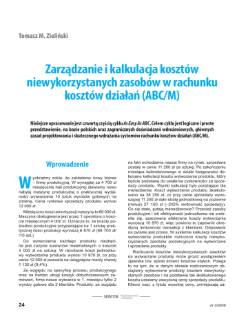 Tomasz M. Zieliński Zarządzanie i kalkulacja kosztów niewykorzystanych zasobów w rachunku kosztów działań (ABC/M) Niniejsze opracowanie jest czwartą częścią cyklu As Easy As ABC. Celem cyklu jest logiczne i proste przedstawienie, na bazie polskich oraz zagranicznych doświadczeń wdrożeniowych, głównych zasad projektowania i skutecznego wdrażania systemów rachunku kosztów działań (ABC/M). Wprowadzenie W yobraźmy sobie, że zakładamy nowy biznes – firmę produkcyjną. W wynajętej za 4 700 zł miesięcznie hali produkcyjnej stawiamy nowo nabytą maszynę produkcyjną o praktycznej wydajności wytwarzania 10 sztuk wyrobów gotowych na zmianę. Cena rynkowa sprzedaży produktu wynosi 12 000 zł. Miesięczny koszt amortyzacji maszyny to 60 000 zł. Maszyna obsługiwana jest przez 1 operatora o koszcie miesięcznym 4 000 zł. Oznacza to, że koszty pośrednio produkcyjne przypadające na 1 sztukę praktycznej ilości produkcji wynoszą 6 870 zł (68 700 zł/ /10 szt.) Do wytworzenia każdego produktu niezbędne jest zużycie surowców materiałowych o koszcie 4 000 zł na sztukę. W rezultacie koszt jednostkowy wytworzenia produktu wynosi 10 870 zł, co przy cenie 12 000 zł pozwala na osiągnięcie marży równej 1 130 zł (9,4%). Ze względu na specyfikę procesu produkcyjnego oraz na bardzo ubogi koszyk dotychczasowych zamówień, firma nasza wytwarza w 1. miesiącu tylko 2 wyroby gotowe dla 2 klientów. Produkty, ze względu 24 na fakt wchodzenia naszej firmy na rynek, sprzedane zostały w cenie 11 200 zł za sztukę. Po zakończeniu miesiąca kalendarzowego w dziale księgowości dokonano kalkulacji kosztu wytworzenia produktu, który będzie podstawą do ustalenia zyskowności ze sprzedaży produktu. Wyniki kalkulacji były porażające dla menedżerów. Koszt wytworzenia produktu skalkulowano na 38 250 zł, co przy cenie sprzedaży wynoszącej 11 200 zł dało stratę jednostkową na poziomie (minus) 27 150 zł (–242% rentowność sprzedaży). Co się stało, pytają menedżerowie? Przecież zasoby produkcyjne i ich efektywność jednostkowa nie zmieniła się, szacowane efektywne koszty wytworzenia wynoszą 10 870 zł, więc powinno to zapewnić określoną rentowność transakcji z klientami. Odpowiedź na pytanie jest prosta. W systemie kalkulacji kosztów wytworzenia produktów rozliczono koszty niewykorzystanych zasobów produkcyjnych na wytworzone i sprzedane produkty. Rozliczanie kosztów niewykorzystanych zasobów na wytwarzane produkty może grozić wystąpieniem zjawiska tzw. spirali śmierci kosztów stałych. Polega to na tym, że w danym okresie rozliczeniowym obciążamy wytworzone produkty kosztem niewykorzystanych zasobów i na podstawie tak skalkulowanego kosztu ustalamy zawyżoną cenę sprzedaży produktu. Klienci nasi, z tytułu wysokiej ceny, zmniejszają za- nr 3/2009 As Easy As ABC kupy danego produktu, co skutkuje zmniejszeniem produkcji tego wyrobu. W kolejnym okresie, na mniejszą wielkość produkcji ponownie rozliczamy coraz to większe koszty niewykorzystanych zasobów, co jeszcze bardziej podnosi koszt wytworzenia produktu. Jeżeli dalej będziemy podnosić ceny, to łatwo wyobrazić sobie koniec. zdolności produkcyjnej zasobów, np. w przedsiębiorstwach o bardzo dużej sezonowości produkcji, wówczas koszty niewykorzystanej zdolności produkcyjnej pojawiające się po sezonie powinny znajdować się w cenach sprzedawanych produktów w całym roku. W takich przypadkach koszty niewykorzystanych zasobów powinny być traktowane jako nakład inwestycyjny i amortyzowane w danym roku proporcjonalnie do wielkości produkcji, tak aby każda sztuka wytworzonego wyrobu gotowego w danym roku zawierała w sobie taki sam koszt nadmiernej zdolności produkcyjnej zasobów. Alokować czy nie alokować O tym, czy koszty niewykorzystanych zasobów powinny być alokowane na produkty i klientów, decyduje: Zagadnienie kosztów niewykorzystanych zasobów jest istotne we wszystkich systemach i technikach kalkulacji kosztów produktów i klientów przedsiębiorstwa, w tym również w koncepcji rachunku kosztów działań (ABC/M). W rozliczeniach kosztów, jakie wykonywane są w systemach ABC/M, koszty niewykorzystanych zasobów nie powinny być rozliczane na działania, a dalej na obiekty kosztowe. Koszty te stanowią odrębny problem menedżerski, którego celem jest optymalne dopasowywanie potencjału posiadanych zasobów do rozmiarów działalności. Miejsce kosztów niewykorzystanych zasobów w strukturze rachunku kosztów działań prezentuje rysunek 1. W klasycznym podejściu do rachunku kosztów działań koszty niewykorzystanych zasobów próbowano kalkulować (zatrzymywać) na poziomie obiektów ● polityka zarządu przedsiębiorstwa, np. decyzja o produkowaniu wyłącznie na 1 zmianę produkcyjną. Wówczas koszty niewykorzystanych zasobów, ale tylko te dotyczące 2. i 3. zmiany produkcyjnej, muszą znaleźć się w cenach sprzedawanych produktów, ponieważ firma nie zamierza w żaden rynkowy sposób wykorzystać czy odsprzedać niewykorzystanej mocy produkcyjnej zasobów. Natomiast jeżeli zasoby nie będą efektywnie wykorzystywane na pierwszej zmianie produkcyjnej, to koszt niewykorzystanego zasobu 1 zmiany nie powinien być alokowany na wytwarzane produkty (ponieważ firma zamierza efektywnie wykorzystywać zasoby na pierwszej zmianie produkcyjnej), ● możliwość rynkowej sprzedaży nadmiernych zdolności produkcyjnych zasobów. Jeżeli przedsiębiorstwo nie ma możliwości sprzedaży nadmiernej Brygada Przyjêæ Rega³y Magazynowe System Informatyczny Energia i Woda Wózki do Sk³adowania Kontrolowanie Dostaw Przyjmowanie Produktów Produkt A Planiœci Produkcji Hala Produkcyjna Planowanie Produkcji Sk³adowanie Wyrobów Gotowych Produkt B Produkt C Produkt N Linie Produkcyjne Wózki Kompletacyjne Powierzchnia Biurowa Materia³y Biurowe Brygada Kompletacji Planowanie Dystrybucji Kompletowanie Zamówieñ Pracownicy BOK Œrodki Tra