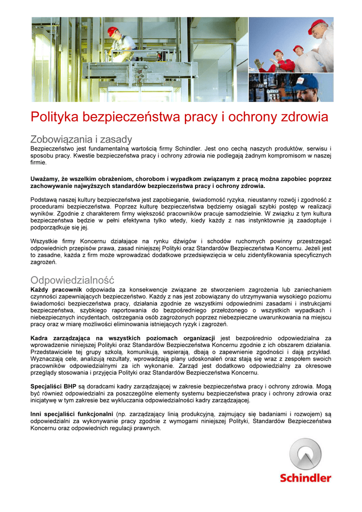 Polityka bezpieczeństwa pracy i ochrony zdrowia Zobowiązania i zasady Bezpieczeństwo jest fundamentalną wartością firmy Schindler. Jest ono cechą naszych produktów, serwisu i sposobu pracy. Kwestie bezpieczeństwa pracy i ochrony zdrowia nie podlegają żadnym kompromisom w naszej firmie. Uważamy, że wszelkim obrażeniom, chorobom i wypadkom związanym z pracą można zapobiec poprzez zachowywanie najwyższych standardów bezpieczeństwa pracy i ochrony zdrowia. Podstawą naszej kultury bezpieczeństwa jest zapobieganie, świadomość ryzyka, nieustanny rozwój i zgodność z procedurami bezpieczeństwa. Poprzez kulturę bezpieczeństwa będziemy osiągali szybki postęp w realizacji wyników. Zgodnie z charakterem firmy większość pracowników pracuje samodzielnie. W związku z tym kultura bezpieczeństwa będzie w pełni efektywna tylko wtedy, kiedy każdy z nas instynktownie ją zaadoptuje i podporządkuje się jej. Wszystkie firmy Koncernu działające na rynku dźwigów i schodów ruchomych powinny przestrzegać odpowiednich przepisów prawa, zasad niniejszej Polityki oraz Standardów Bezpieczeństwa Koncernu. Jeżeli jest to zasadne, każda z firm może wprowadzać dodatkowe przedsięwzięcia w celu zidentyfikowania specyficznych zagrożeń. Odpowiedzialność Każdy pracownik odpowiada za konsekwencje związane ze stworzeniem zagrożenia lub zaniechaniem czynności zapewniających bezpieczeństwo. Każdy z nas jest zobowiązany do utrzymywania wysokiego poziomu świadomości bezpieczeństwa pracy, działania zgodnie ze wszystkimi odpowiednimi zasadami i instrukcjami bezpieczeństwa, szybkiego raportowania do bezpośredniego przełożonego o wszystkich wypadkach i niebezpiecznych incydentach, ostrzegania osób zagrożonych poprzez niebezpieczne uwarunkowania na miejscu pracy oraz w miarę możliwości eliminowania istniejących ryzyk i zagrożeń. Kadra zarządzająca na wszystkich poziomach organizacji jest bezpośrednio odpowiedzialna za wprowadzenie niniejszej Polityki oraz Standardów Bezpieczeństwa Koncernu zgodnie z ich obszarem działania. Przedstawiciele tej grupy szkolą, komunikują, wspierają, dbają o zapewnienie zgodności i dają przykład. Wyznaczają cele, analizują rezultaty, wprowadzają plany udoskonaleń oraz stają się wraz z zespołem swoich pracowników odpowiedzialnymi za ich wykonanie. Zarząd jest dodatkowo odpowiedzialny za okresowe przeglądy stosowania i przyjęcia Polityki oraz Standardów Bezpieczeństwa Koncernu. Specjaliści BHP są doradcami kadry zarządzającej w zakresie bezpieczeństwa pracy i ochrony zdrowia. Mogą być również odpowiedzialni za poszczególne elementy systemu bezpieczeństwa pracy i ochrony zdrowia oraz inicjatywę w tym zakresie bez wykluczania odpowiedzialności kadry zarządzającej. Inni specjaliści funkcjonalni (np. zarządzający linią produkcyjną, zajmujący się badaniami i rozwojem) są odpowiedzialni za wykonywanie pracy zgodnie z wymogami niniejszej Polityki, Standardów Bezpieczeństwa Koncernu oraz odpowiednich regulacji prawnych.