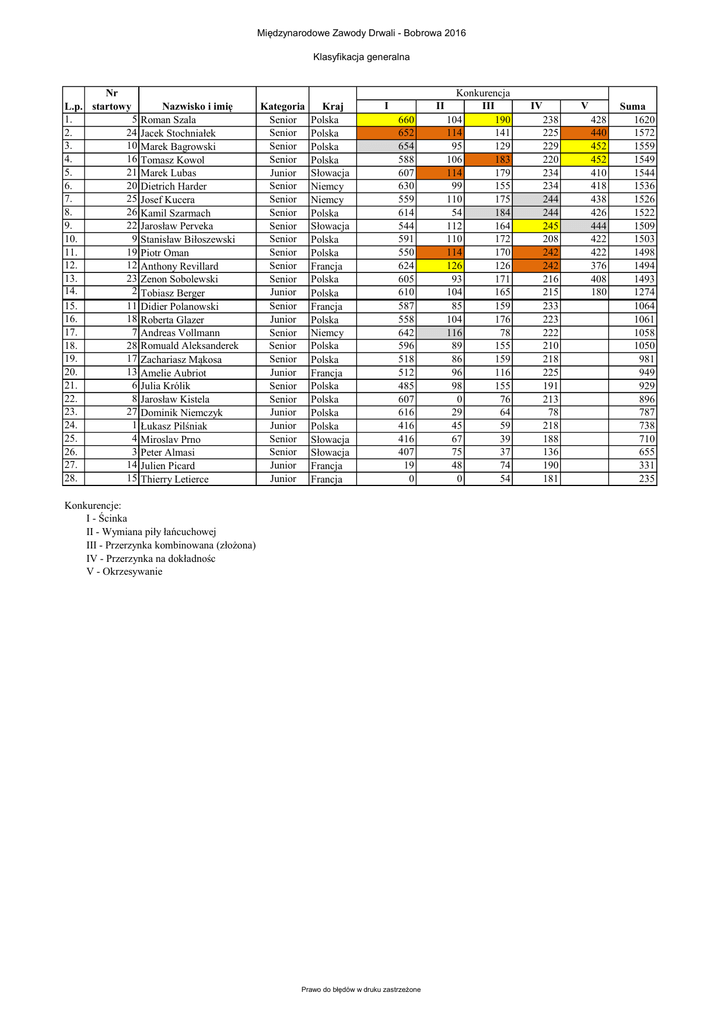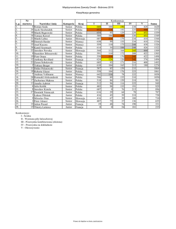 Międzynarodowe Zawody Drwali - Bobrowa 2016 Klasyfikacja generalna Nr L.p. startowy Nazwisko i imię 1. 5 Roman Szala 2. 24 Jacek Stochniałek 3. 10 Marek Bagrowski 4. 16 Tomasz Kowol 5. 21 Marek Lubas 6. 20 Dietrich Harder 7. 25 Josef Kucera 8. 26 Kamil Szarmach 9. 22 Jarosław Perveka 10. 9 Stanisław Biłoszewski 11. 19 Piotr Oman 12. 12 Anthony Revillard 13. 23 Zenon Sobolewski 14. 2 Tobiasz Berger 15. 11 Didier Polanowski 16. 18 Roberta Glazer 17. 7 Andreas Vollmann 18. 28 Romuald Aleksanderek 19. 17 Zachariasz Mąkosa 20. 13 Amelie Aubriot 21. 6 Julia Królik 22. 8 Jarosław Kistela 23. 27 Dominik Niemczyk 24. 1 Łukasz Pilśniak 25. 4 Miroslav Prno 26. 3 Peter Almasi 27. 14 Julien Picard 28. 15 Thierry Letierce Kategoria Senior Senior Senior Senior Junior Senior Senior Senior Senior Senior Senior Senior Senior Junior Senior Junior Senior Senior Senior Junior Senior Senior Junior Junior Senior Senior Junior Junior Kraj Polska Polska Polska Polska Słowacja Niemcy Niemcy Polska Słowacja Polska Polska Francja Polska Polska Francja Polska Niemcy Polska Polska Francja Polska Polska Polska Polska Słowacja Słowacja Francja Francja I 660 652 654 588 607 630 559 614 544 591 550 624 605 610 587 558 642 596 518 512 485 607 616 416 416 407 19 0 Konkurencje: I - Ścinka II - Wymiana piły łańcuchowej III - Przerzynka kombinowana (złożona) IV - Przerzynka na dokładnośc V - Okrzesywanie Prawo do błędów w druku zastrzeżone II Konkurencja III 104 190 114 141 95 129 106 183 114 179 99 155 110 175 54 184 112 164 110 172 114 170 126 126 93 171 104 165 85 159 104 176 116 78 89 155 86 159 96 116 98 155 0 76 29 64 45 59 67 39 75 37 48 74 0 54 IV 238 225 229 220 234 234 244 244 245 208 242 242 216 215 233 223 222 210 218 225 191 213 78 218 188 136 190 181 V 428 440 452 452 410 418 438 426 444 422 422 376 408 180 Suma 1620 1572 1559 1549 1544 1536 1526 1522 1509 1503 1498 1494 1493 1274 1064 1061 1058 1050 981 949 929 896 787 738 710 655 331 235