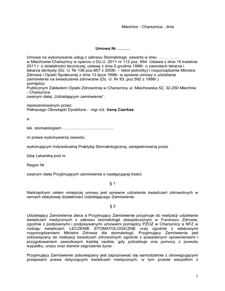 Miechów - Charsznica , dnia Umowa Nr ……… Umowa na wykonywanie usług z zakresu Stomatologii, zawarta w dniu … … … … w Miechowie-Charsznicy w oparciu o Dz.U. 2011 nr 112 poz. 654 Ustawa z dnia 15 kwietnia 2011 r. o działalności leczniczej, ustawę z dnia 5 grudnia 1996r. o zawodach lekarza i lekarza dentysty (Dz. U. Nr 136 poz.857 z 2008r. – tekst jednolity) i rozporządzenie Ministra Zdrowia i Opieki Społecznej z dnia 13 lipca 1998r. w sprawie umowy o udzielanie zamówienia na świadczenia zdrowotne (Dz. U. Nr 93, poz.592 z 1998r.) pomiędzy: Publicznym Zakładem Opieki Zdrowotnej w Charsznicy ul. Miechowska 52, 32-250 Miechów - Charsznica zwanym dalej „Udzielającym zamówienie”, reprezentowanym przez: Pełnacego Obowiązki Dyrektora - mgr inż. Irenę Czerkas a lek. stomatologiem ………………………………. nr prawa wykonywania zawodu: wykonującym Indywidualną Praktykę Stomatologiczną, zarejestrowaną przez Izbę Lekarską pod nr Regon Nr zwanym dalej Przyjmującym zamówienie o następującej treści: §1 Nadrzędnym celem niniejszej umowy jest sprawne udzielanie świadczeń zdrowotnych w ramach statutowej działalności Udzielającego Zamówienie. §2 Udzielający Zamówienia zleca a Przyjmujący Zamówienie przyjmuje do realizacji udzielanie świadczeń medycznych z zakresu stomatologii ubezpieczonym w Funduszu Zdrowia, zgodnie z podpisanymi i podpisywanymi umowami pomiędzy PZOZ w Charsznicy a NFZ w rodzaju świadczeń: LECZENIE STOMATOLOGICZNE oraz zgodnie z właściwymi rozporządzeniami Ministra Zdrowia dla stomatologii. Przyjmujący Zamówienie jest zobowiązany do realizacji świadczeń zdrowotnych zgodnie z posiadanymi uprawnieniami i przygotowaniem zawodowym każdej osobie, gdy potrzebuje ona pomocy z powodu wypadku, urazu oraz stanów zagrożenia życia . Przyjmujący Zamówienie zobowiązany jest zapoznawać się samodzielnie z obowiązującymi przepisami prawa dotyczącymi świadczeń medycznych, w tym przede wszystkim z 1 Ustawami, Rozporządzeniami Ministra Zdrowia, Zarządzeniami prezesa obwieszczeniami oraz innymi, a także do aktualizacji i podnoszenia swojej wiedzy. NFZ, Przyjmujący Zamówienie jest zobowiązany do realizacji świadczeń przy wykorzystaniu także rejestracji telefonicznej. W przypadku braku dokumentu potwierdzającego uprawnienia do bezpłatnych świadczeń zdrowotnych Przyjmujący Zamówienie udzieli świadczenia zdrowotnego zgodnie z zasadami obowiązującymi u Udzielającego Zamówienie. -cennikiem usług ponadstandardowych dostępnym dla pacjentów. §3 Świadczenia zdrowotne udzielane będą przez Przyjmującego Zamówienie zgodnie z harmonogramem tygodniowym określonym w załączniku Nr 1, który zobowiązany jest ściśle przestrzegać. §4 Świadczenia zdrowotne udzielane będą osobiście przez Przyjmującego Zamówienie. W razie niemożności udzielenia świadczenia przez Przyjmującego Zamówienie, dopuszcza się ich wykonanie przez inny podmiot, spełniający wymogi formalne, wskazany przez Przyjmującego Zamówienie, po uprzednim powiadomieniu i uzyskaniu zgody Udzielającego Zamówienie. Świadczenia realizowane przez inny podmiot finansowane są przez Przyjmującego Zamówienie. §5 Umowę zawiera się na czas określony od dnia ………………. do ………………… z możliwością przedłużenia za zgodą obu stron w formie aneksu. §6 Przyjmujący zamówienie zobowiązuje się do poddawania kontroli prowadzonej przez Narodowy Fundusz Zdrowia oraz Udzielającego Zamówienia na zasadach obowiązujących w publicznych zakładach opieki zdrowotnej. §7 Przyjmujący Zamówienie za wykonane świadczenia medyczne, o których mowa w § 2 ust.1 umowy otrzyma należność obliczoną jako iloczyn wartości procentowej P=……., określonej w załączniku Nr 2 do umowy ceny jednostkowej punktu oraz ilości wykonanych punktów z uwzględnieniem limitu punktów określonych w załączniku Nr 1 z zastrzeżeniem wykonywania usług protetycznych §7a.Wskazany w Załączniku Nr 1 miesięczny limit finansowania nie oznacza wymogu realizowania miesięcznie ilości wynegocjowanych w NFZ punktów. W przypadku nadwykonania wobec ustalonej ilości punktów, środki finansowe będą za ten miesiąc wypłacone tylko do kwoty limitu z możliwością przeniesienia na kolejny miesiąc w okresie rozliczeniowym do końca każdego półrocza ( 30 czerwca i 31 grudnia). W przypadku udzielania świadczeń osobom nieuprawnionym do bezpłatnych świadczeń Przyjmującemu Zamówienie przysługuje ustalona wartość procentowa ………. kwoty pobranej od nieuprawnionego za udzieloną usługę zgodnie z obowiązującym Cennikiem za 2 Usługi Medyczne obowiązującym u Udzielającego Zamówienie z zastrzeżeniem wykonywania usług protetycznych §7a. Realizacja płatności odbywać się będzie na podstawie imiennego wykazu osób nieuprawnionych. §7a Należność dla przyjmującego zamówienie za wykonanie protez oblicza się według wzoru: Należność = P(tu ……) x (zapłacona kwota przez NFZ – koszt za protezę zapłacony protetykowi) W przypadku nadwykonania protez, niezapłaconego przez NFZ, Przyjmujący Zamówienie jest zobowiązany do zwrotu Udzielającego Zamówienie poniesionego przez zamawiającego kosztu wykonania protezy. W przypadku nie zwrócenia, kwota ta może zostać potrącona z następnej należności dla Przyjmującego Zamówienie. §7b Ustala się dla Przyjmującego Zamówienie limit nadwykonań w okresie półrocznym na 15% półrocznej wartości kontraktu z NFZ, po przekroczeniu którego Przyjmujący Zamówienie zostanie obciążony karą umowną w wysokości 45% wartości usług liczonych według cennika NFZ, jako ryczałt za poniesione przez Udzielającego Zamówienie koszty (w tym zużyte materiały, energię, sprzątanie itd.). §8 Przyjmujący Zamówienie do 10 dnia roboczego danego miesiąca za miesiąc miniony, dostarczy Udzielającemu Zamówienia rachunek za udzielone świadczenia zdro