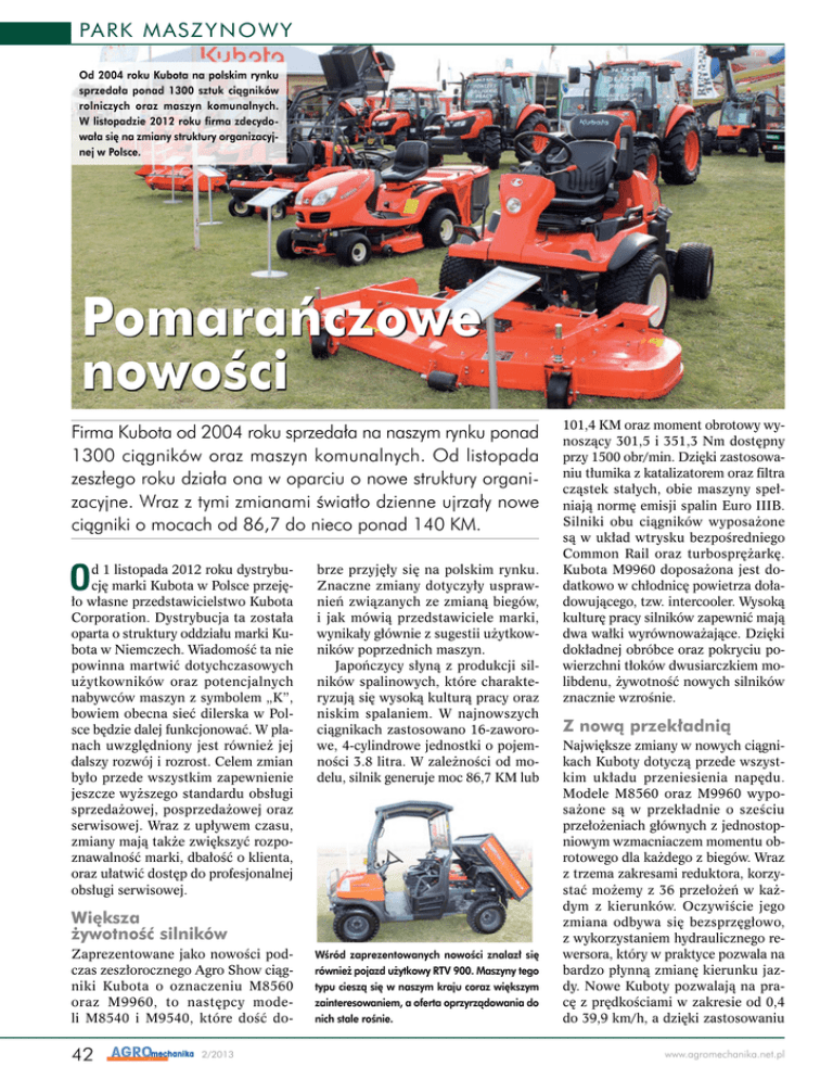 Park Mas z y n o w y Od 2004 roku Kubota na polskim rynku sprzedała ponad 1300 sztuk ciągników rolniczych oraz maszyn komunalnych. W listopadzie 2012 roku firma zdecydowała się na zmiany struktury organizacyjnej w Polsce. Pomarańczowe nowości Firma Kubota od 2004 roku sprzedała na naszym rynku ponad 1300 ciągników oraz maszyn komunalnych. Od listopada zeszłego roku działa ona w oparciu o nowe struktury organizacyjne. Wraz z tymi zmianami światło dzienne ujrzały nowe ciągniki o mocach od 86,7 do nieco ponad 140 KM. O d 1 listopada 2012 roku dystrybucję marki Kubota w Polsce przejęło własne przedstawicielstwo Kubota Corporation. Dystrybucja ta została oparta o struktury oddziału marki Kubota w Niemczech. Wiadomość ta nie powinna martwić dotychczasowych użytkowników oraz potencjalnych nabywców maszyn z symbolem „K”, bowiem obecna sieć dilerska w Polsce będzie dalej funkcjonować. W planach uwzględniony jest również jej dalszy rozwój i rozrost. Celem zmian było przede wszystkim zapewnienie jeszcze wyższego standardu obsługi sprzedażowej, posprzedażowej oraz serwisowej. Wraz z upływem czasu, zmiany mają także zwiększyć rozpoznawalność marki, dbałość o klienta, oraz ułatwić dostęp do profesjonalnej obsługi serwisowej. brze przyjęły się na polskim rynku. Znaczne zmiany dotyczyły usprawnień związanych ze zmianą biegów, i jak mówią przedstawiciele marki, wynikały głównie z sugestii użytkowników poprzednich maszyn. Japończycy słyną z produkcji silników spalinowych, które charakteryzują się wysoką kulturą pracy oraz niskim spalaniem. W najnowszych ciągnikach zastosowano 16-zaworowe, 4-cylindrowe jednostki o pojemności 3.8 litra. W zależności od modelu, silnik generuje moc 86,7 KM lub Większa żywotność silników Zaprezentowane jako nowości podczas zeszłorocznego Agro Show ciągniki Kubota o oznaczeniu M8560 oraz M9960, to następcy modeli M8540 i M9540, które dość do- 42 2/2013 Wśród zaprezentowanych nowości znalazł się również pojazd użytkowy RTV 900. Maszyny tego typu cieszą się w naszym kraju coraz większym zainteresowaniem, a oferta oprzyrządowania do nich stale rośnie. 101,4 KM oraz moment obrotowy wynoszący 301,5 i 351,3 Nm dostępny przy 1500 obr/min. Dzięki zastosowaniu tłumika z katalizatorem oraz filtra cząstek stałych, obie maszyny spełniają normę emisji spalin Euro IIIB. Silniki obu ciągników wyposażone są w układ wtrysku bezpośredniego Common Rail oraz turbosprężarkę. Kubota M9960 doposażona jest dodatkowo w chłodnicę powietrza doładowującego, tzw. intercooler. Wysoką kulturę pracy silników zapewnić mają dwa wałki wyrównoważające. Dzięki dokładnej obróbce oraz pokryciu powierzchni tłoków dwusiarczkiem molibdenu, żywotność nowych silników znacznie wzrośnie. Z nową przekładnią Największe zmiany w nowych ciągnikach Kuboty dotyczą przede wszystkim układu przeniesienia napędu. Modele M8560 oraz M9960 wyposażone są w przekładnie o sześciu przełożeniach głównych z jednostopniowym wzmacniaczem momentu obrotowego dla każdego z biegów. Wraz z trzema zakresami reduktora, korzystać możemy z 36 przełożeń w każdym z kierunków. Oczywiście jego zmiana odbywa się bezsprzęgłowo, z wykorzystaniem hydraulicznego rewersora, który w praktyce pozwala na bardzo płynną zmianę kierunku jazdy. Nowe Kuboty pozwalają na pracę z prędkościami w zakresie od 0,4 do 39,9 km/h, a dzięki zastosowaniu www.agromechanika.net.pl Park M as zy n owy Nowością jest zastosowanie podłokietnika pozwalającego na korzystanie z większości funkcji ciągnika bez odrywania ręki przez operatora. nadbiegu, prędkość maksymalna uzyskiwana jest przy 2100 obr/min. Niezwykle istotną kwestią dotyczącą przeniesienia napędu jest również przedni most z przekładniami stożkowymi zatopionymi w kąpieli olejowej. Jest to znak rozpoznawczy Kuboty, który pozwala na większe wychylenie przednich kół przy jednoczesnym bezpieczeństwie podczas przekazywania mocy. Przednia oś wyposażona jest również w mechanizm różnicowy z ograniczonym poślizgiem (LSD), którego załączanie odbywa się z wykorzystaniem przycisku na konsoli w kabinie operatora. Wysoki standard Oba modele ciągników charakteryzują się masą własną 3880 kg (w standardowym wyposażeniu). Ciągniki mogą współpracować z maszynami napędzanymi WOM z wykorzystaniem dwóch prędkości obrotowych: 540/ 540E. Układ hydrauliczny obejmuje m.in. pompę o wydatku 64 l/min oraz 2 (w opcji 3) pary wyjść hydraulicznych. Udźwig tylnego TUZ kat. II to 4100 kg. Systemem wspomagającym pracę operatora w przypadku modeli M8560 i M9560 jest Work Cruise, pozwalający na automatyczną regulację obrotów silnika w zależności od aktualnego obciążenia maszyny. Przytulna i funkcjonalna kabina zapewnia dobrą widoczność, a dzięki zastosowaniu przedniej szyby zachodzącej na krawędź dachu, praca z wykorzystaniem ładowacza czołowego może przebiegać w jeszcze bardziej komfortowych warunkach. Standardowa konfiguracja ciągników obejmuje również: klimatyzację, przednie obciążniki o masie 470 kg, układ pneumatycznego hamowania przyczep oraz kompletny zaczep tylny z belką rolniczą i zaczepem transportowym. www.agromechanika.net.pl Niezwykle istotną kwestią dotyczącą przeniesienia napędu jest przedni most z przekładniami stożkowymi zatopionymi w kąpieli olejowej, zapewniającymi duży kąt skrętu kół. Mocny samuraj Kolejnymi nowościami japońskiego producenta są modele o oznaczeniu M110GX oraz M135GX, przy czym model mniejszy traktowany jest jako następca dobrze znanego modelu M108S. Kubota M110GX to traktor zdecydowanie większy i cięższy niż ów poprzednik. Jego masa w standardowym wyposażeniu wynosi 4644 kg. O równe 10 cm wzrosła również długość ciągnika. Traktor jest także o 15 cm szerszy, co bezpośrednio przekłada się na zwiększoną jego stabilno