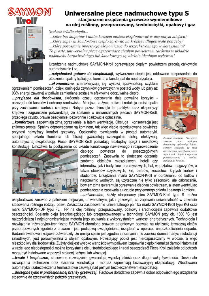 Uniwersalne piece nadmuchowe typu S stacjonarne urządzenia grzewcze wymiennikowe na olej roślinny, przepracowany, średniociężki, opałowy i gaz Szukasz źródła ciepła... ...które bez kłopotów i tanim kosztem możesz eksploatować w dowolnym miejscu? ...które zapewni komfortowe ciepło zarówno na krótkie i długotrwałe potrzeby? ...które pozostanie inwestycją ekonomiczną do wszechstronnego wykorzystania? To proste, uniwersalne piece ogrzewające ciepłym powietrzem zarówno w układzie nadmuchu bezpośredniego lub kanałowego są właśnie idealnym wyborem! Urządzenia nadmuchowe SAYMON-Kroll ogrzewające ciepłym powietrzem pracują całkowicie automatycznie i są... ...natychmiast gotowe do eksploatacji, wytworzone ciepło jest oddawane bezpośrednio do otoczenia, spaliny trafiają do komina, a kondensat do neutralizatora. ...ekonomiczne, charakteryzują się wysoką sprawnością, szybkim ogrzewaniem pomieszczeń, dzięki ominięciu czynników grzewczych w postaci wody lub pary aż 93% energii zawartej w paliwie zamieniane zostaje w efektywne odczuwalne ciepło. …przyjazne dla środowiska, skrócenie czasu ogrzewania daje poważne korzyści oszczędność kosztów i ochronę środowiska. Mniejsze zużycie paliwa i redukcja emisji spalin przy zachowaniu wartości cieplnych. Nabyta przez dziesiątki lat praktyka oraz ekspertyzy krajowe i zagraniczne potwierdzają, że spalanie w uniwersalnych piecach SAYMON-Kroll, przebiega czysto, prawie bezdymnie, bezwonnie i całkowicie opłacalnie. ...komfortowe, zapewniają zimą ogrzewanie, a latem wentylację. Obsługa i konserwacja jest znikomo prosta. Spaliny odprowadzane są kominem, tak więc ciepłe recyrkulowane powietrze przynosi najwyższy komfort grzewczy. Opcjonalne rozwiązania w postaci automatyki, specjalnego układu tłumienia lub filtracji, gwarantują szczególnie cichą, efektywną, Zasada działania: Powietrze automatyczną eksploatację. Piece SAYMON-Kroll posiadają niezbędny spręż i unikatową zassane przez wydajną dmuchawę opływając ściany konstrukcję. Umożliwia to podłączenie do układu kanałowego nawiewnego i rozprowadzenie komory spalania ze stali ciepłego powietrza do poszczególnych nierdzewnej przechodzi przez wymiennik ciepła i ogrzewa pomieszczeń. Zapewnia to skuteczne ogrzanie pomieszczenie, a spaliny zarówno obiektów mieszkalnych, hoteli czy trafiają do komina. internatów, jak i budynków przemysłowych, hal, warsztatów, magazynów, a także obiektów użytkowych, kin, teatrów, kościołów, krytych kortów i stadionów. Urządzenia marki SAYMON-Kroll w odróżnieniu od kotłów i nagrzewnic wodnych, są użyteczne nie tylko sezonowo, ale całorocznie, bowiem zimą gwarantują ogrzewanie ciepłym powietrzem, a latem wentylując pomieszczenia zapewniają uczucie przyjemnego chłodu i pełnego komfortu. ...uniwersalne, każdy stacjonarny piec SAYMON-Kroll typu S można eksploatować zarówno z palnikiem olejowym, uniwersalnym, jak i gazowym, co zapewnia uniwersalność w zakresie stosowania różnego rodzaju paliw. Zwłaszcza zastosowanie uniwersalnego palnika marki SAYMON-Kroll typu KG oraz marki SAYMON-FDP typu FL i FP na olej roślinny, przepracowany, opałowy i średniociężki zapewnia dodatkowe oszczędności. Spalanie oleju średniociężkiego lub przepracowanego w technologii SAYMON przy ok. 1300 ºC jest najczyściejszą i najekonomiczniejszą metodą jego usuwania z wykorzystaniem wartości energetycznych. Technologia i rozwiązania inżynieryjno-techniczne SAYMON chronione prawem patentowym pozwala na utylizację termiczną olejów przepracowanych zgodnie z prawem i jest podstawą uwzględnienia urządzeń w operacie unieszkodliwienia odpadu. Badania światowe i krajowe potwierdziły, że emisja spalin jest zgodna z normami i nie zawiera domniemanych substancji szkodliwych, jest porównywalna z olejem opałowym. Powstający popiół jest nierozpuszczalny w wodzie, a więc nieszkodliwy dla środowiska. Zużyty olej jest wysoko wartościowym paliwem i zapewnia ciepło niemal za darmo! Natomiast w razie jego niedostępności można korzystać z oleju średniociężkiego i nadal oszczędzać! Piece Kroll zależnie od potrzeb mogą być instalowane w pozycji stojącej, leżącej lub wiszącej. ...trwałe i bezpieczne, stosowane rozwiązania gwarantują wysoką jakość oraz długotrwałą żywotność. Doskonałe rozwiązania techniczne oraz staranna konstrukcja i montaż zapewniają bezawaryjną eksploatację. Wbudowana automatyka i zabezpieczenia termostatowe czuwają nad pełnym bezpieczeństwem eksploatacji. ...dostępne tylko w profesjonalnej branży grzewczej. Fachowe doradztwo zapewnia dobór odpowiedniego urządzenia stosownie do rzeczywistych potrzeb grzewczych. Parametry techniczne i zestawienie urządzeń Dane techniczne \ Typ j.m. Kroll S 25 Kroll S 40 Kroll S 55 Kroll S 70 Kroll S 95 Kroll S 110 Kroll S 140 Kroll S 170 Kroll S 195 Znamionowa moc cieplna kW kcal/h 28 24100 40 34400 55 47300 70 60200 95 81700 110 94600 129 118700 163 148000 194 167700 Efektywna moc cieplna kW kcal/h 25,5 21900 37,5 32300 50,5 43500 64 55040 88 75700 100 86000 120 107500 150 129000 180 150500 Wydajność wentylacji Różnica temperatur (Δt) Zużycie oleju Zużycie gazu płynnego Zużycie gazu ziemnego Pobór mocy elektrycznej Poziom dB poniżej Spręż nadmuchu Zasilanie elektryczne Masa bez palnika m3/h Kelvin kg/h kg/h m3/h kW dB Pa V/A kg 1650 43 2,33 2,18 2,70 0,41 68 80 230/2,10 93 2900 42 3,44 3,11 3,86 0,76 71 100 230/3,65 124 3700 45 4,64 4,28 5,30 1,5 71 100 230/6,84 157 5000 44 5,84 5,45 6,75 0,88 68 100 400/2,70 191 6750 44 8,01 7,39 9,16 1,83 69 100 400/3,6 245 7650 44 9,19 8,56 10,61 1,83 69 100 400/3,6 265 9200 44 10,88 10,04 12,44 1,1 73 90 400/2,6 399 11800 43 13,74 12,68 15,72 2,2 73 100 400/4,7 405 13800 44 16,36 15,10 18,71 1,5 75 90 400/3,3 495 Dane techniczne \ Typ j.m. Kroll S 260 Kroll S 290 Kroll S 360 Kroll S 430 Kroll S 490 Kroll S 580 Kroll S 650 Kro