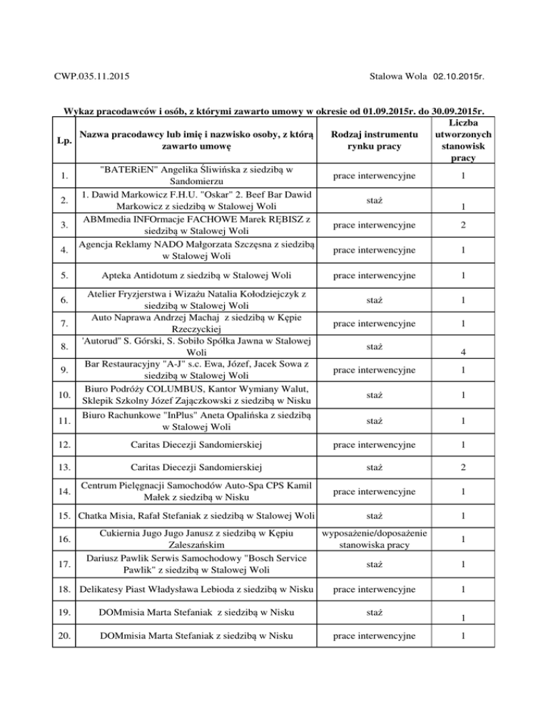 CWP.035.11.2015 Stalowa Wola 02.10.2015r. Wykaz pracodawców i osób, z którymi zawarto umowy w okresie od 01.09.2015r. do 30.09.2015r. Liczba Nazwa pracodawcy lub imię i nazwisko osoby, z którą Rodzaj instrumentu utworzonych Lp. zawarto umowę rynku pracy stanowisk pracy "BATERiEN" Angelika Śliwińska z siedzibą w 1. prace interwencyjne 1 Sandomierzu 1. Dawid Markowicz F.H.U. "Oskar" 2. Beef Bar Dawid 2. staż Markowicz z siedzibą w Stalowej Woli 1 ABMmedia INFOrmacje FACHOWE Marek RĘBISZ z 3. prace interwencyjne 2 siedzibą w Stalowej Woli Agencja Reklamy NADO Małgorzata Szczęsna z siedzibą 4. prace interwencyjne 1 w Stalowej Woli 5. 6. 7. 8. 9. 10. Apteka Antidotum z siedzibą w Stalowej Woli Atelier Fryzjerstwa i Wizażu Natalia Kołodziejczyk z siedzibą w Stalowej Woli Auto Naprawa Andrzej Machaj z siedzibą w Kępie Rzeczyckiej 'Autorud'' S. Górski, S. Sobiło Spółka Jawna w Stalowej Woli Bar Restauracyjny "A-J" s.c. Ewa, Józef, Jacek Sowa z siedzibą w Stalowej Woli Biuro Podróży COLUMBUS, Kantor Wymiany Walut, Sklepik Szkolny Józef Zajączkowski z siedzibą w Nisku prace interwencyjne 1 staż 1 prace interwencyjne 1 staż 4 prace interwencyjne 1 staż 1 11. Biuro Rachunkowe "InPlus" Aneta Opalińska z siedzibą w Stalowej Woli staż 1 12. Caritas Diecezji Sandomierskiej prace interwencyjne 1 13. Caritas Diecezji Sandomierskiej staż 2 14. Centrum Pielęgnacji Samochodów Auto-Spa CPS Kamil Małek z siedzibą w Nisku prace interwencyjne 1 staż 1 wyposażenie/doposażenie stanowiska pracy 1 staż 1 prace interwencyjne 1 15. Chatka Misia, Rafał Stefaniak z siedzibą w Stalowej Woli 16. 17. Cukiernia Jugo Jugo Janusz z siedzibą w Kępiu Zaleszańskim Dariusz Pawlik Serwis Samochodowy "Bosch Service Pawlik" z siedzibą w Stalowej Woli 18. Delikatesy Piast Władysława Lebioda z siedzibą w Nisku 19. DOMmisia Marta Stefaniak z siedzibą w Nisku staż 20. DOMmisia Marta Stefaniak z siedzibą w Nisku prace interwencyjne 1 1 21. EKO - RAM Sp. z o. o. z siedzibą w Stalowej Woli staż 1 22. 'Eurocash'' S.A. z siedzibą w Komornikach staż 3 23. Ewa Czaja "Madame" Salon Fryzjerski w Stalowej Woli staż 1 F.H.U. "Kazo" Kazimierz Cholewiński z siedzibą w wyposażenie/doposażenie Agatówce stanowiska pracy F.H.U. EMKA Hurt - Detal Krawicz Agnieszka z siedzibą 25. staż w Lipie 24. 26. 27. 28. 29. 30. FHU "Duet" Gabriela Pruchnicka z siedzibą w Turbii Fin- Serwis s.c. M. Pierścionek, J. Pierścionek, I. Stefaniak z siedzibą w Radomyślu nad Sanem Firma Budowlana ''MIX'' Grzegorz Kaplita z siedzibą w Agatówce Firma Handlowa RIA Sp. z o. o. spółka komandytowa z siedzibą w Jamnicy Firma Handlowo Usługowa Polang Dawid Kuziora z siedzibą w Pysznicy Firma Produkcyjno-Handlowa "DABI" S.C. Sojecka J., Zając W. z siedzibą w Zbydniowie Firma Produkcyjno-Handlowo-Usługowa "Mario" Marek 32. Trela z siedzibą w Stalowej Woli 31. 1 1 staż 1 staż 1 staż 1 staż staż 1 1 prace interwencyjne 1 prace interwencyjne 1 33. Fryturnia Michał Ćwik z siedzibą w Stalowej Woli staż 34. Gminne Centrum Kultury w Radomyślu nad Sanem staż 1 1 36. Gminny Ośrodek Pomocy Społecznej w Radomyślu nad Sanem Grzegorz Glanc z siedzibą w Dzierdziówce 37. Handel-Gastronomia Alicja Madej z siedzibą w Nisku prace interwencyjne 1 38. HSW - Fabryka Elementów Złącznych FASTEC Sp. z o.o. z siedzibą w Zaklikowie staż 1 39. IMPULS Grażyna Szepelak z siedzibą w Nisku staż 1 35. 40. 41. 42. Kancelaria Adwokacka Adwokat Krzysztof Bednarz z siedzibą w Stalowej Woli Kantor - Lombard Małgorzata Koluch z siedzibą w Stalowej Woli staż 1 staż 1 staż prace interwencyjne KARO Usługi Transportowe Handel Kazimierz Bródka i wyposażenie/doposażenie Robert Bródka Sp. j. z siedzibą w Zbydniowie stanowiska pracy 43. Karolina Krępa Firma Handlowa w Gorzycach staż 44. Komornik Sądowy przy Sądzie Rejonowym w Tarnobrzegu Janusz Stącel Kancelaria Komornicza w Tarnobrzegu staż 1 1 1 1 1 Korepetycje pl. Justyna Błażejowska z siedzibą w staż Pysznicy KOSSTA - Kopia Dokument Kolasa Stanisław z siedzibą wyposażenie/doposażenie 46. w Stalowej Woli stanowiska pracy 45. 47. La Passione - Dariusz Dzik z siedzibą w Stalowej Woli 1 1 staż 1 prace interwencyjne 1 Masarnia - Orzechów Kułaga Marek z siedzibą w Orzechowie Masarnia - Orzechów Kułaga Marek z siedzibą w Orzechowie MCS-METAL Cleaning Service Sp z o.o. z siedzibą w Stalowej Woli staż 2 wyposażenie/doposażenie stanowiska pracy 12 51. Miejski Dom Kultury w Stalowej Woli staż 1 52. Miejski Ośrodek Pomocy Społecznej w Stalowej Woli staż 2 53. Miejski Zakład Budynków Sp. z o.o. w Stalowej Woli staż 1 54. Miejski Zakład Komunalny Sp. z o. o. w Stalowej Woli staż 2 55. Muzeum Regionalne w Stalowej Woli staż 2 prace interwencyjne 1 48. 49. 50. 56. 57. 58. 59. Niepubliczne Przedszkole "Bąbelkowo" Joanna Piorun z siedzibą w Stalowej Woli P.P.H. "Tanis" K.Pyzara, T.Pyzara, M.Pyzara, A.Pyzara Sp. j. z siedzibą w Stalowej Woli P.P.H.U. SOLO Marcin Sobota z siedzibą w Stalowej Woli 'Patwik'' Barbara i Roman Oskroba Sp. j. z siedzibą w Radomyślu nad Sanem 60. PHU "Joanna" Bucoń Joanna z siedzibą w Stalowej Woli staż prace interwencyjne staż 1 1 1 wyposażenie/doposażenie stanowiska pracy 1 61. Piekarnia "ZASANIE" Jan Zawół z siedzibą w Stalowej Woli staż 2 62. Piekarnia ''Złoty Kłos'' Agnieszka Pąk z siedzibą w Lipie staż 1 63. Piekarnia ''Złoty Kłos'' Agnieszka Pąk z siedzibą w Lipie prace interwencyjne 1 prace interwencyjne 1 staż 1 Pizzeria "Rustica 2" Mariusz Piekarz z siedzibą w Przędzelu Pizzeria "VERONA" - Przemysław Banasiak z siedzibą w 65. Stalowej Woli Pizzeria ''Rustica 2" Mariusz Piekarz z siedzibą w 66. Przędzelu Poradnia Psychologiczno - Pedagogiczna w Stalowej 67. Woli 64. staż staż 1 2 68. PPH Bella Kamil Smętek z siedzibą w Kraśniku prace interwencyjne 1 69. Prokuratura Okręgowa w Tarnobrzegu staż 1 70. 'Pro-Soft'' s.c. H. Daczyński A. Kwiatkowski z siedzibą w Stalowe