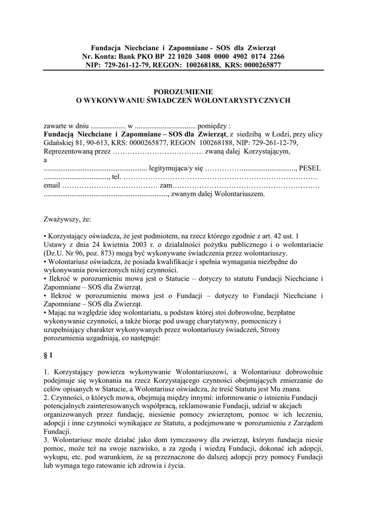Fundacja Niechciane i Zapomniane - SOS dla Zwierząt Nr. Konta: Bank PKO BP 22 1020 3408 0000 4902 0174 2266 NIP: 729-261-12-79, REGON: 100268188, KRS: 0000265877 POROZUMIENIE O WYKONYWANIU ŚWIADCZEŃ WOLONTARYSTYCZNYCH zawarte w dniu ................... w ................................. pomiędzy : Fundacją Niechciane i Zapomniane – SOS dla Zwierząt, z siedzibą w Łodzi, przy ulicy Gdańskiej 81, 90-613, KRS: 0000265877, REGON 100268188, NIP: 729-261-12-79, Reprezentowaną przez ………………………………. zwaną dalej Korzystającym, a ........................................................ legitymująca/y się ……………............................., PESEL ..................................., tel. ……………………………………………………………………. email ………………………………… zam…………………………………………………… ..................................................................., zwanym dalej Wolontariuszem. Zważywszy, że: • Korzystający oświadcza, że jest podmiotem, na rzecz którego zgodnie z art. 42 ust. 1 Ustawy z dnia 24 kwietnia 2003 r. o działalności pożytku publicznego i o wolontariacie (Dz.U. Nr 96, poz. 873) mogą być wykonywane świadczenia przez wolontariuszy. • Wolontariusz oświadcza, że posiada kwalifikacje i spełnia wymagania niezbędne do wykonywania powierzonych niżej czynności. • Ilekroć w porozumieniu mowa jest o Statucie – dotyczy to statutu Fundacji Niechciane i Zapomniane – SOS dla Zwierząt. • Ilekroć w porozumieniu mowa jest o Fundacji – dotyczy to Fundacji Niechciane i Zapomniane – SOS dla Zwierząt. • Mając na względzie ideę wolontariatu, u podstaw której stoi dobrowolne, bezpłatne wykonywanie czynności, a także biorąc pod uwagę charytatywny, pomocniczy i uzupełniający charakter wykonywanych przez wolontariuszy świadczeń, Strony porozumienia uzgadniają, co następuje: §1 1. Korzystający powierza wykonywanie Wolontariuszowi, a Wolontariusz dobrowolnie podejmuje się wykonania na rzecz Korzystającego czynności obejmujących zmierzanie do celów opisanych w Statucie, a Wolontariusz oświadcza, że treść Statutu jest Mu znana. 2. Czynności, o których mowa, obejmują między innymi: informowanie o istnieniu Fundacji potencjalnych zainteresowanych współpracą, reklamowanie Fundacji, udział w akcjach organizowanych przez fundację, niesienie pomocy zwierzętom, pomoc w ich leczeniu, adopcji i inne czynności wynikające ze Statutu, a podejmowane w porozumieniu z Zarządem Fundacji. 3. Wolontariusz może działać jako dom tymczasowy dla zwierząt, którym fundacja niesie pomoc, może też na swoje nazwisko, a za zgodą i wiedzą Fundacji, dokonać ich adopcji, wykupu, etc. pod warunkiem, że są przeznaczone do dalszej adopcji przy pomocy Fundacji lub wymaga tego ratowanie ich zdrowia i życia. §2 1. Strony Umowy uzgadniają, że czynności określone w § 1 będą wykonywane od dnia podpisania umowy na czas nieokreślony. 2. Miejscem wykonywania czynności będzie zwłaszcza region zamieszkania Wolontariusza, a w razie Jego przemieszczania się teren całego kraju. §3 Z uwagi na charakter i ideę wolontariatu: • Wolontariusz jest obowiązany wykonywać uzgodnione czynności osobiście. • Wolontariusz za swoje czynności nie otrzyma wynagrodzenia. §4 Korzystający zobowiązuje się pokrywać niezbędne koszty ponoszone przez Wolontariusza, związane z wykonywaniem świadczeń na rzecz Korzystającego, tylko za wcześniejszym porozumieniem z Korzystającym, po udokumentowaniu poniesionych kosztów, w szczególności: • W przypadku pomocy zwierzętom i ponoszonym z tego tytułu kosztów leczenia, wyżywienia, wykupu, itp. • W przypadku umieszczenia ratowanych zwierząt w hotelu, domu zastępczym, tymczasowym itp. • Inne, indywidualnie uzgodnione, a zmierzające do realizacji celów statutowych. §5 1. Wolontariusz zobowiązuje się zachowania w tajemnicy i poufności informacji, które uzyskał w związku w wykonywaniem świadczeń na rzecz Korzystającego. 2. W przypadku udostępnienia przez Korzystającego adresów email, haseł, loginów, legitymacji, dostępów, kodów, itp. Wolontariusz zobowiązuje się nie przekazywać ich osobom trzecim oraz wykorzystywać tylko w celu wykonywania świadczeń na rzecz Korzystającego przez okres obowiązywania niniejszej umowy. W/w udostępnione przez Fundację pozostają jej wyłączną własnością. 3. Wolontariusz zobowiązuje się do postępowania w sposób, który nie narazi na szwank dobrego imienia Fundacji. 4. Po 3 miesięcznym okresie bezczynności wolontariusza i barku kontaktu z Fundacją porozumienie automatycznie wygasa. §6 1. Porozumienie może być rozwiązane przez każdą ze Stron za 7 dniowym wypowiedzeniem. 2. Porozumienie może być rozwiązane przez każdą ze Stron pisemnie bez wypowiedzenia z ważnych przyczyn lub nie wykonywania przez którąkolwiek ze stron zapisów umownych w sposób właściwy. §7 Wolontariusz nie może zaciągać zobowiązań, w tym finansowych i innych na rzecz oraz w imieniu Korzystającego, w tym składać w jego imieniu oświadczeń, podpisywać umów, chyba, że posiada odrębne pisemne upoważnienie lub pełnomocnictwo. §8 Za wyrządzone szkody strony odpowiadają na zasadach określonych w Kodeksie Cywilnym. W sprawach nieuregulowanych przepisami Ustawy o działalności pożytku publicznego i o wolontariacie lub niniejszym Porozumieniem zastosowanie będą miały odpowiednie przepisy Kodeksu Cywilnego. §9 1. Wszelkie zmiany Porozumienia będą dokonywane w formie pisemnej pod rygorem nieważności. 2. Spory wynikłe ze stosowania umowy rozstrzyga Sąd właściwy dla siedziby Korzystającego. § 10 Wolontariusz może w każdym czasie domagać się wydania przez Korzystającego pisemnego zaświadczenia o wykonaniu świadczeń przez Wolontariusza. Zaświadczenie to powinno zawierać informację o zakresie wy