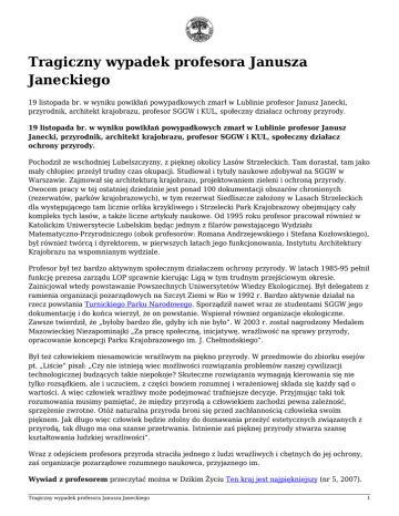 Tragiczny wypadek profesora Janusza Janeckiego 19 listopada br. w wyniku powikłań powypadkowych zmarł w Lublinie profesor Janusz Janecki, przyrodnik, architekt krajobrazu, profesor SGGW i KUL, społeczny działacz ochrony przyrody. 19 listopada br. w wyniku powikłań powypadkowych zmarł w Lublinie profesor Janusz Janecki, przyrodnik, architekt krajobrazu, profesor SGGW i KUL, społeczny działacz ochrony przyrody. Pochodził ze wschodniej Lubelszczyzny, z pięknej okolicy Lasów Strzeleckich. Tam dorastał, tam jako mały chłopiec przeżył trudny czas okupacji. Studiował i tytuły naukowe zdobywał na SGGW w Warszawie. Zajmował się architekturą krajobrazu, projektowaniem zieleni i ochroną przyrody. Owocem pracy w tej ostatniej dziedzinie jest ponad 100 dokumentacji obszarów chronionych (rezerwatów, parków krajobrazowych), w tym rezerwat Siedliszcze założony w Lasach Strzeleckich dla występującego tam licznie orlika krzykliwego i Strzelecki Park Krajobrazowy obejmujący cały kompleks tych lasów, a także liczne artykuły naukowe. Od 1995 roku profesor pracował również w Katolickim Uniwersytecie Lubelskim będąc jednym z filarów powstającego Wydziału Matematyczno-Przyrodniczego (obok profesorów: Romana Andrzejewskiego i Stefana Kozłowskiego), był również twórcą i dyrektorem, w pierwszych latach jego funkcjonowania, Instytutu Architektury Krajobrazu na wspomnianym wydziale. Profesor był też bardzo aktywnym społecznym działaczem ochrony przyrody. W latach 1985-95 pełnił funkcję prezesa zarządu LOP sprawnie kierując Ligą w tym trudnym przejściowym okresie. Zainicjował wtedy powstawanie Powszechnych Uniwersytetów Wiedzy Ekologicznej. Był delegatem z ramienia organizacji pozarządowych na Szczyt Ziemi w Rio w 1992 r. Bardzo aktywnie działał na rzecz powstania Turnickiego Parku Narodowego. Sporządził nawet wraz ze studentami SGGW jego dokumentację i do końca wierzył, że on powstanie. Wspierał również organizacje ekologiczne. Zawsze twierdził, że „byłoby bardzo źle, gdyby ich nie było”. W 2003 r. został nagrodzony Medalem Mazowieckiej Niezapominajki „Za pracę społeczną, inicjatywę, wrażliwość na sprawy przyrody, opracowanie koncepcji Parku Krajobrazowego im. J. Chełmońskiego”. Był też człowiekiem niesamowicie wrażliwym na piękno przyrody. W przedmowie do zbiorku esejów pt. „Liście” pisał: „Czy nie istnieją wiec możliwości rozwiązania problemów naszej cywilizacji technologicznej budzących takie niepokoje? Skuteczne rozwiązania wymagają kierowania się nie tylko rozsądkiem, ale i uczuciem, z części bowiem rozumnej i wrażeniowej składa się każdy sąd o wartości. A więc człowiek wrażliwy może podejmować trafniejsze decyzje. Przyjmując taki tok rozumowania musimy pamiętać, że między przyrodą a człowiekiem zachodzi pewna zależność, sprzężenie zwrotne. Otóż naturalna przyroda broni się przed zachłannością człowieka swoim pięknem. Jak długo więc człowiek będzie zdolny do doznawania przeżyć estetycznych związanych z przyrodą, tak długo ma ona szanse przetrwania. Istnienie zaś pięknej przyrody stwarza szansę kształtowania ludzkiej wrażliwości”. Wraz z odejściem profesora przyroda straciła jednego z ludzi wrażliwych i chętnych do jej ochrony, zaś organizacje pozarządowe rozumnego naukowca, przyjaznego im. Wywiad z profesorem przeczytać można w Dzikim Życiu Ten kraj jest najpiękniejszy (nr 5, 2007). Tragiczny wypadek profesora Janusza Janeckiego 1