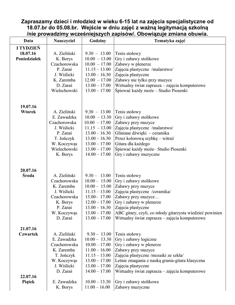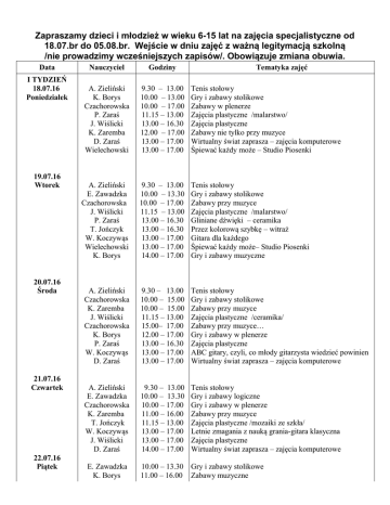 Zapraszamy dzieci i młodzież w wieku 6-15 lat na zajęcia specjalistyczne od 18.07.br do 05.08.br. Wejście w dniu zajęć z ważną legitymacją szkolną /nie prowadzimy wcześniejszych zapisów/. Obowiązuje zmiana obuwia. Data I TYDZIEŃ 18.07.16 Poniedziałek 19.07.16 Wtorek 20.07.16 Środa 21.07.16 Czwartek 22.07.16 Piątek Nauczyciel Godziny A. Zieliński K. Borys Czachorowska P. Zaraś J. Wiślicki K. Zaremba D. Zaraś Wielechowski 9.30 – 13.00 10.00 – 13.00 10.00 – 17.00 11.15 – 13.00 13.00 – 16.30 12.00 – 17.00 13.00 – 17.00 13.00 – 17.00 Tenis stołowy Gry i zabawy stolikowe Zabawy w plenerze Zajęcia plastyczne /malarstwo/ Zajęcia plastyczne Zabawy nie tylko przy muzyce Wirtualny świat zaprasza – zajęcia komputerowe Śpiewać każdy może – Studio Piosenki A. Zieliński E. Zawadzka Czachorowska J. Wiślicki P. Zaraś T. Jończyk W. Koczywąs Wielechowski K. Borys 9.30 – 13.00 10.00 – 13.30 10.00 – 17.00 11.15 – 13.00 13.00 – 16.30 13.00 – 16.30 13.00 – 17.00 13.00 – 17.00 14.00 – 17.00 Tenis stołowy Gry i zabawy stolikowe Zabawy przy muzyce Zajęcia plastyczne /malarstwo/ Gliniane dźwięki – ceramika Przez kolorową szybkę – witraż Gitara dla każdego Śpiewać każdy może– Studio Piosenki Gry i zabawy muzyczne A. Zieliński Czachorowska K. Zaremba J. Wiślicki Czachorowska K. Borys P. Zaraś W. Koczywąs D. Zaraś 9.30 – 13.00 10.00 – 15.00 10.00 – 15.00 11.15 – 13.00 15.00– 17.00 12.00 – 17.00 13.00 – 16.30 13.00 – 17.00 13.00 – 17.00 Tenis stołowy Gry i zabawy stolikowe Zabawy przy muzyce Zajęcia plastyczne /ceramika/ Zabawy przy muzyce… Gry i zabawy w plenerze Zajęcia plastyczne ABC gitary, czyli, co młody gitarzysta wiedzieć powinien Wirtualny świat zaprasza – zajęcia komputerowe A. Zieliński E. Zawadzka Czachorowska K. Zaremba T. Jończyk W. Koczywąs J. Wiślicki D. Zaraś 9.30 – 13.00 10.00 – 13.30 10.00 – 17.00 11.00 – 16.00 11.15 – 13.00 13.00 – 17.00 13.00 – 17.00 14.00 – 17.00 Tenis stołowy Gry i zabawy logiczne Gry i zabawy w plenerze Zabawy przy muzyce Zajęcia plastyczne /mozaiki ze szkła/ Letnie zmagania z nauką grania-gitara klasyczna Zajęcia plastyczne Wirtualny świat zaprasza – zajęcia komputerowe E. Zawadzka K. Borys Tematyka zajęć 10.00 – 13.30 Gry i zabawy stolikowe 11.00 – 16.00 Zabawy muzyczne Zapraszamy dzieci i młodzież w wieku 6-15 lat na zajęcia specjalistyczne od 18.07.br do 05.08.br. Wejście w dniu zajęć z ważną legitymacją szkolną /nie prowadzimy wcześniejszych zapisów/. Obowiązuje zmiana obuwia. Czachorowska W. Koczywąs P. Zaraś D. Zaraś 12.45 – 17.00 14.00 – 17.00 12.00 – 16.30 14.00 – 17.00 Gry i zabawy stolikowe Gdybym miał gitarę... – zajęcia dla początkujących Zajęcia plastyczne Wirtualny świat zaprasza – zajęcia komputerowe A. Zieliński K. Borys P. Zaraś A. Ramos J. Wiślicki Wielechowski D. Zaraś 9.30 – 13.00 10.00 – 15.00 11.15 – 13.00 12.00 – 17.00 13.00 – 16.30 13.00 – 17.00 13.00 – 17.00 Tenis stołowy Konkursy, gry i zabawy stolikowe Zajęcia plastyczne /malarstwo/ Zabawy nie tylko przy muzyce… Zajęcia plastyczne Śpiewać każdy może – Studio Piosenki Wirtualny świat zaprasza A. Zieliński K. Borys J. Wiślicki K. Zaremba T. Jończyk P. Zaraś W. Koczywąs Wielechowski 9.30 – 13.00 10.00 –15.00 11.15 – 13.00 12.00 - 17.00 13.00 – 16.30 13.00 - 16.30 13.00 – 17.00 13.00 – 17.00 Tenis stołowy Gry i zabawy stolikowe Zajęcia plastyczne /malarstwo/ Zabawy przy muzyce Zostanę artystą – witraż Zajęcia plastyczne Jak grać na gitarze nie znając nut? Mikrofon dla każdego – Studio Piosenki A. Zieliński K. Borys D. Murawska D. MurawskaJ. Wiślicki J. Tryzno A. Ramos W. Koczywąs P. Zaraś D. Zaraś 9.30 – 13.00 10.00 – 15.00 10.00 – 13.00 13.00 – 17.00 11.15 – 13.00 10.00 – 14.00 10.00 – 17.00 13.00 – 17.00 13.00 – 16.30 13.00 – 17.00 Tenis stołowy Gry i zabawy stolikowe Zabawy muzyczne Gry i zabawy w plenerze Zajęcia indywidualne /ceramika/ Język niemiecki Z muzyka za „pan brat” Zagrajmy to razem – otwarte zaj. muzyczne Zajęcia plastyczne Wirtualny świat zaprasza II TYDZIEŃ 25.07.16 Poniedziałek 26.07.16 Wtorek 27.07.16 Środa 28.07.16 Czwartek A. Zieliński K. Borys T. Jończyk 9.30 - 13.00 Tenis stołowy 10.00 – 15.00 Gry i zabawy stolikowe 11.15 - 13.00 Zajęcia plastyczne /mozaiki ze szkła/ Zapraszamy dzieci i młodzież w wieku 6-15 lat na zajęcia specjalistyczne od 18.07.br do 05.08.br. Wejście w dniu zajęć z ważną legitymacją szkolną /nie prowadzimy wcześniejszych zapisów/. Obowiązuje zmiana obuwia. K. Zaremba J. Tryzno W. Koczywąs J. Wiślicki D. Zaraś 12.00 – 17.00 10.00 – 15.00 13.00 – 17.00 13.00 – 17.00 14.00 – 17.00 Zabawy nie tylko przy muzyce Język niemiecki Gitara – krok po kroku Zajęcia plastyczne Wirtualny świat zaprasza K. Borys J. Tryzno K. Zaremba W. Koczywąs P. Zaraś D. Zaraś 10.00 – 15.00 10.00 – 14.00 12.45 – 16.00 14.00 – 17.00 12.30 – 17.00 14.00 – 17.00 Gry i zabawy stolikowe Język niemiecki Zabawy przy muzyce Palcami lub kostką – gitara klasyczna Zajęcia plastyczne Wirtualny świat zaprasza A. Ramos P. Zaraś J. Wiślicki A.Gronkiewicz D. Murawska D. Zaraś Wielechowski 10.00 - 15.00 11.15 – 13.00 13.00 – 16.30 10.00 – 17.00 13.00 – 17.00 13.00 – 17.00 13.00 – 17.00 Gry i zabawy stolikowe Zajęcia plastyczne /malarstwo/ Pastelowe barwy- zaj. w pracowni malarskiej Zabawy przy muzyce Zabawy w plenerze Wirtualny świat zaprasza – zaj. w pracowni komputerowej Śpiewać każdy może- zaj. otwarte Studia Piosenki D. Murawska A.Gronkiewicz J. Wiślicki P. Zaraś T. Jończyk W. Koczywąs Wielechowski J.Tryzno 10.00 - 17.00 10.00 - 16.00 11.15 - 13.00 13.00 – 16.30 13.00 – 16.30 13.00 – 17.00 13.00 – 17.00 12.00 – 17.00 Gry i zabawy stolikowe Zabawy przy muzyce Zajęcia plastyczne /malarstwo/ Gliniane dźwięki - ceramika 
