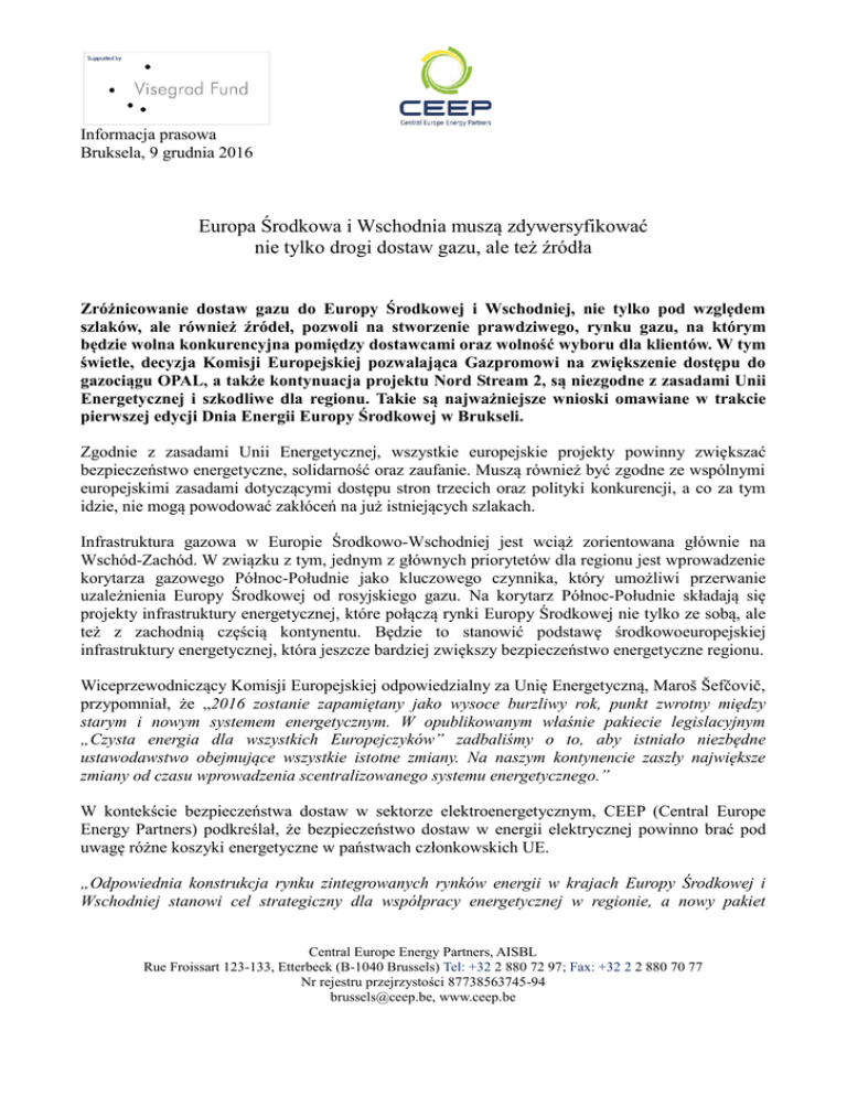 Informacja prasowa Bruksela, 9 grudnia 2016 Europa Środkowa i Wschodnia muszą zdywersyfikować nie tylko drogi dostaw gazu, ale też źródła Zróżnicowanie dostaw gazu do Europy Środkowej i Wschodniej, nie tylko pod względem szlaków, ale również źródeł, pozwoli na stworzenie prawdziwego, rynku gazu, na którym będzie wolna konkurencyjna pomiędzy dostawcami oraz wolność wyboru dla klientów. W tym świetle, decyzja Komisji Europejskiej pozwalająca Gazpromowi na zwiększenie dostępu do gazociągu OPAL, a także kontynuacja projektu Nord Stream 2, są niezgodne z zasadami Unii Energetycznej i szkodliwe dla regionu. Takie są najważniejsze wnioski omawiane w trakcie pierwszej edycji Dnia Energii Europy Środkowej w Brukseli. Zgodnie z zasadami Unii Energetycznej, wszystkie europejskie projekty powinny zwiększać bezpieczeństwo energetyczne, solidarność oraz zaufanie. Muszą również być zgodne ze wspólnymi europejskimi zasadami dotyczącymi dostępu stron trzecich oraz polityki konkurencji, a co za tym idzie, nie mogą powodować zakłóceń na już istniejących szlakach. Infrastruktura gazowa w Europie Środkowo-Wschodniej jest wciąż zorientowana głównie na Wschód-Zachód. W związku z tym, jednym z głównych priorytetów dla regionu jest wprowadzenie korytarza gazowego Północ-Południe jako kluczowego czynnika, który umożliwi przerwanie uzależnienia Europy Środkowej od rosyjskiego gazu. Na korytarz Północ-Południe składają się projekty infrastruktury energetycznej, które połączą rynki Europy Środkowej nie tylko ze sobą, ale też z zachodnią częścią kontynentu. Będzie to stanowić podstawę środkowoeuropejskiej infrastruktury energetycznej, która jeszcze bardziej zwiększy bezpieczeństwo energetyczne regionu. Wiceprzewodniczący Komisji Europejskiej odpowiedzialny za Unię Energetyczną, Maroš Šefčovič, przypomniał, że „2016 zostanie zapamiętany jako wysoce burzliwy rok, punkt zwrotny między starym i nowym systemem energetycznym. W opublikowanym właśnie pakiecie legislacyjnym „Czysta energia dla wszystkich Europejczyków” zadbaliśmy o to, aby istniało niezbędne ustawodawstwo obejmujące wszystkie istotne zmiany. Na naszym kontynencie zaszły największe zmiany od czasu wprowadzenia scentralizowanego systemu energetycznego.” W kontekście bezpieczeństwa dostaw w sektorze elektroenergetycznym, CEEP (Central Europe Energy Partners) podkreślał, że bezpieczeństwo dostaw w energii elektrycznej powinno brać pod uwagę różne koszyki energetyczne w państwach członkowskich UE. „Odpowiednia konstrukcja rynku zintegrowanych rynków energii w krajach Europy Środkowej i Wschodniej stanowi cel strategiczny dla współpracy energetycznej w regionie, a nowy pakiet Central Europe Energy Partners, AISBL Rue Froissart 123-133, Etterbeek (B-1040 Brussels) Tel: +32 2 880 72 97; Fax: +32 2 2 880 70 77 Nr rejestru przejrzystości 87738563745-94 [email protected], www.ceep.be Informacja prasowa Bruksela, 9 grudnia 2016 legislacyjny znacznie zmieni sposób, w jaki energia jest generowana, sprzedawana i transportowana. Jednakże, ambicje powinny wychodzić poza rozwój fizycznej infrastruktury oraz wzajemnych połączeń, i powinny także obejmować odpowiednie ramy prawne,” oświadczył Rafał Miland, wiceprzewodniczący Rady Dyrektorów CEEP. Wydarzenie zostało zorganizowane przez CEEP 9 grudnia w Brukseli, we współpracy z Komisją Europejską, DG Energy, oraz przy wsparciu Międzynarodowego Funduszu Wyszehradzkiego. Pierwsza edycja została przygotowana we współpracy z ośrodkami analitycznymi z Grupy Wyszehradzkiej oraz Ukrainy: Centrum Analiz Społeczno-Ekonomicznych (CASE), Polska; Centrum Badań Słowackiego Stowarzyszenia Polityki Zagranicznej (RC SFPA), Słowacja; Instytut Spraw Zagranicznych i Handlu (IFAT), Węgry; Instytut Polityki i Społeczeństwa (IPS), Czechy; Centrum im. Razumkowa, Ukraina. CEEP powstał w celu reprezentowania interesów przedsiębiorstw energetycznych i energochłonnych z Europy Środkowej, aby wzmocnić bezpieczeństwo energetyczne regionu w ramach polityki energetycznej i bezpieczeństwa energetycznego UE. Jest to pierwsze poważne stowarzyszenie reprezentujące region na poziomie UE. CEEP posiada status non-profit, co gwarantuje zarówno jego niezależność, jak i przejrzystość. Kontakt dla mediów Cristina Dascalu 0032 2 880 72 97 [email protected] Więcej informacji @CEEP_energy www.ceep.be/cede2016 Central Europe Energy Partners, AISBL Rue Froissart 123-133, Etterbeek (B-1040 Brussels) Tel: +32 2 880 72 97; Fax: +32 2 2 880 70 77 Nr rejestru przejrzystości 87738563745-94 [email protected], www.ceep.be