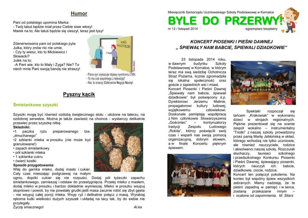 Humor Pani od polskiego upomina Marka: - Twój tatuś będzie miał przez Ciebie siwe włosy! Marek na to; Ale tatuś będzie się cieszył, teraz jest łysy! Zdenerwowana pani od polskiego pyta Julka, który znów nic nie umie. - Czy ty wiesz, kto to Mickiewicz i Słowacki? Julek na to; -A Pani wie, kto to Mały i Zyga? Nie? To niech mnie Pani swoją bandą nie straszy! Pyszny kącik Śmietankowe szyszki Szyszki mogą być również ozdobą świątecznego stołu - ułożone na talerzu, na ozdobnej serwetce. Można je także zawiesić na choince - wystarczy delikatnie przewlec przez szyszkę nitkę. Składniki: •1 paczka ryżu preparowanego tzw. „dmuchanego” •2 szklanki mleka w proszku (nie może być granulowane!) • zapach śmietankowy • pół szklanki mleka • 1 szklanka cukru • ćwierć kostki Sposób przygotowania: Wlej do garnka mleko, dodaj masło i cukier. Cały czas mieszając podgrzewaj na małym ogniu, dopóki cukier się nie rozpuści. Dodaj pół łyżeczki zapachu śmietankowego, zamieszaj i odstaw do przestygnięcia. Przelej mleko z masłem, dodaj mleko w proszku i bardzo dokładnie wymieszaj. Mleko w proszku wsypuj stopniowo i powoli, by nie powstały grudki.jeśli masa zacznie robić się zbyt gęsta - nie wsypuj całej porcji mleka. Wsyp ryż i delikatnie połącz z masą. Wyrabiaj rękoma kulki wielkości dużych szyszek i układaj na tacy tak, by do siebie nie przylegały. Życzę smacznego! Al.ka Miesięcznik Samorządu Uczniowskiego Szkoły Podstawowej w Kornatce BYLE DO PRZERWY! nr 12 / listopad 2014 egzemplarz bezpłatny KONCERT PIOSENKI I PIEŚNI DAWNEJ „ ŚPIEWAŁY NAM BABCIE, ŚPIEWALI DZIADKOWIE” 23 listopada 2014 roku, w dawnym budynku Szkoły Podstawowej w Kornatce, w którym teraz ma swą siedzibę Ochotnicza Straż Pożarna, licznie zgromadziła się lokalna społeczność oraz goście z sąsiednich wsi i miast. Koncert Piosenki i Pieśni Dawnej „Śpiewały nam babcie, śpiewali dziadkowie” był poświęcony ś.p. Dyrektorowi Jerzemu Malinie, propagatorowi kultury ludowej, wyjątkowemu człowiekowi. Doskonale pamiętają współpracę z Nim członkowie Stowarzyszenia „Gościniec” – kontynuatorzy tradycji Zespołu Ludowego „Rokita”, którzy poświęcili swój czas i wsparli nas swoją pomocą organizacyjną, dobrym słowem, a w finale Koncertu pięknym śpiewem. Spektakl rozpoczął się tańcem „Krakowiak” w wykonaniu dzieci w strojach regionalnych. Pięknie prezentował się na scenie zespół wokalno – instrumentalny ”Triolki” z naszej szkoły prowadzony przez panią Martę Jabłońską w skład, którego wchodzą nie tylko uczniowie, ale również nauczyciele, rodzice i absolwenci naszej szkoły. Rozczulali słuchaczy, laureaci szkolnego i przedszkolnego Konkursu Piosenki i Pieśni Dawnej, śpiewający piosenki, których nauczyli ich: babcie, dziadkowie, ciocie, rodzice. Koncert ten połączył pokolenia. Na koniec był wspólny śpiew wszystkich zebranych. Mamy nadzieję, że te pieśni zapadną w pamięć i w serca, zostaną przekazane innym – i ocalone od zapomnienia. M. Sitarz „Wyginam śmiało ciało, a wcześniej się nie dało” Pod takim hasłem przez 4 miesiące uczniowie z terenu Gminy Dobczyce trenowali gimnastykę sportową pod okiem pana Piotra Skóry w RCOS- ie. Z naszej szkoły brało w nich udział 3 uczniów: Aleksandra Doskocz z klasy II, Alicja Kołdras i Franek Karcz z klasy V. Finał projektu miał miejsce 26 listopada w trakcie pokazu, na którym oprócz uczestników projektu wystąpili reprezentanci Towarzystwa Sportowego „Sokół” z Krakowa we wszystkich dyscyplinach gimnastycznych oraz reprezentant Polski Jakub Piwowarski mieszkaniec Dobczyc. Reportaż z pokazu można obejrzeć w iTV Myślenice. M.P. Agnieszka Idzik laureatką konkursu „Bezpieczna droga do szkoły” 5 listopada w Białce Tatrzańskiej odbyło się uroczyste podsumowanie i wręczenie nagród laureatom konkursu plastycznego „Bezpieczna droga do szkoły” organizowanego po raz kolejny przez Gazetę Krakowską. Z dumą informujemy, że Agnieszka Idzik - zajęła w tym konkursie pierwsze miejsce w kategorii klas II. Konkurs obejmował swym zasięgiem województwo małopolskie i był adresowany do uczniów klas I – IV. Oprócz pamiątkowego dyplomu i nagród rzeczowych wszyscy laureaci mieli przyjemność skorzystania z atrakcji parku wodnego Terma Białka. M.P. Świąteczna zbiórka żywności Jak co roku zapraszamy do udziału w świątecznej zbiórce żywności długoterminowej, słodyczy oraz chemii gospodarczej. Produkty prosimy przynosić w dniach od 8 do 12 grudnia. Więcej informacji na plakatach. Samorząd Uczniowski Sławni sportowcy ARJEN ROBEBEN Arjen Robben ur. 23.01. 1984 w Bedum – holenderski piłkarz grający na pozycji ofensywnego pomocnika lub napastnika w Bayern Monachium. Srebrny medalista mistrzostw świata 2010 i brązowy medalista mistrzostw świata 2014. Początkowo występował w FC Groningen, 3 grudnia 2000 roku zadebiutował w Eredivisie w meczu z RKC Waalwijk. W sezonie 2002/2003 w rozgrywkach holenderskiej ekstraklasy zdobył 12 bramek, przyczyniając się do zdobycia mistrzostwa kraju. Poza tym w 2003 roku wraz z PSV wywalczył Superpuchar Holandii (w meczu z Utrechtem strzelił jednego z trzech goli dla swojego zespołu). Latem 2004 roku, za 12 milionów funtów przeszedł do Chelsea. W Premier League zadebiutował 23 października w wygranym 4:0 meczu z Blackbum. Pierwszego gola dla Chelsea strzelił w spotkaniu Ligi Mistrzów z CSKA Moskwa, zapewniając swojemu zespołowi zwycięstwo 1:0. W latach 2004–2007 regularnie występował w londyńskiej drużynie, wraz z nią wywalczył m.in. dwukrotnie mistrzostwo Anglii (2005, 2006), zdobył nagrodę Bravo Award. W sierpniu 2007 roku został zawodnikiem Realu Madryt. Przez następne dwa lata regularnie występował w jego barwach w rozgrywkach Primera Divison. Wraz z madryckim klubem zdobył mistrzostwo kraju (2008) oraz Superpuc