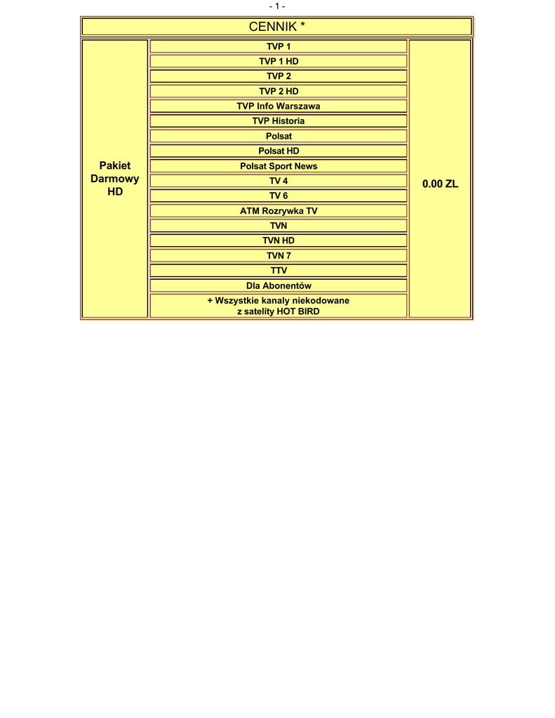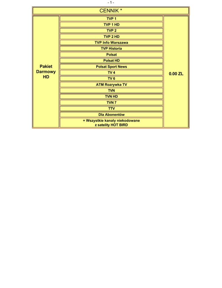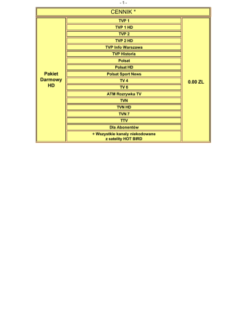 -1- CENNIK * TVP 1 TVP 1 HD TVP 2 TVP 2 HD TVP Info Warszawa TVP Historia Polsat Polsat HD Pakiet Darmowy HD Polsat Sport News TV 4 TV 6 ATM Rozrywka TV TVN TVN HD TVN 7 TTV Dla Abonentów + Wszystkie kanaly niekodowane z satelity HOT BIRD 0.00 ZL -2TVP 1 TVP 1 HD TVP 2 TVP 2 HD TVP HD Polsat Polsat HD Polsat 2 International TV 4 TV 6 ATM Rozrywka TV TVN TVN HD TVN 7 TVN 7 HD TTV Pakiet Mini HD: Religia TV (1) (3) 16.90 ZL TVP Info Warszawa TVP Historia (3) Polsat News Polsat Sport Polsat Sport News Polsat Film Polsat Crime & Investigation Network Polsat Play Polsat Cafe Polsat Jim Jam VIVA Polska Dla Abonentów (4) ® PR 1 ® PR 3 ® RMF FM + Wszystkie kanaly niekodowane z satelity HOT BIRD -3TVP 1 TVP 1 HD TVP 2 TVP 2 HD TVP HD Polsat Polsat HD Polsat 2 International TV 4 TV 6 ATM Rozrywka TV TVN TVN HD TVN 7 TVN 7 HD TTV TVP Info Warszawa Polsat News SuperStacja TVN 24 TVN CNBC (3) TVN Meteo CNN International Polsat Sport Polsat Sport Extra EuroSport TVP Historia (3) Discovery Channel Discovery World Discovery Science ID Pakiet Familijny: Animal Planet National Geographic Channel Nat Geo Wild Polsat Crime & Investigation Network History Channel Travel Channel Zone Reality Polsat Film TCM Kino Polska AXN FOX Comedy Central Cartoon Network Disney Channel Disney XD 39.90 ZL -4Zone Europa AXN Crime Pakiet Film: AXN Sci-Fi 16.90 ZL FOX Life TVP Seriale Comedy Central Family Zone Romantica Pakiet FilmBox: FilmBox FilmBox Extra FilmBox Family TVP Sport EuroSport 2 Pakiet Sport: Orange Sport (3) FightBox 14.90 ZL Extreme Sport Channel ESPN Classic Sport Pakiet Muzyka: MTV Polska VH-1 Polska 5.90 ZL Nickelodeon Pakiet Bajeczka: Nickelodeon HD Nick Jr. 6.90 ZL Boomerang HBO HBO HD Pakiet HBO HD: HBO 2 28.00 ZL HBO 2 HD HBO Comedy HBO Comedy HD Cinemax Pakiet Cinemax HD: Cinemax HD Cinemax 2 16.00 ZL Cinemax 2 HD Pakiet Rozrywka: (2) Blue Hustler 21.00 ZL Daring! TV Blue Hustler Daring! TV (2) (2) 11.00 ZL 21.00 ZL -5BBC HD Polsat Sport HD Polsat Sport Extra HD EuroSport HD EuroSport 2 HD FilmBox HD AXN HD Pakiet HD: (2) AXN Spin HD 25.00 ZL FOX HD FOX Life HD Discovery HD Showcase Animal Planet HD National Geographic HD History HD Nat Geo Wild HD MTV Live HD Polsat Sport HD EuroSport HD 6.00 ZL (2) EuroSport 2 HD 6.00 ZL (2) Discovery HD Showcase (2) 6.00 ZL National Geographic HD (2) 6.00 ZL Nat Geo Wild HD MTV Live HD AXN HD 6.00 ZL (2) 6.00 ZL (2) 6.00 ZL (2) FilmBox HD Opcja Dodatkowa 6.00 ZL (2) Zawartosc 6.00 ZL (2) Cena Film Sport Relax Mix Muzyka 21.90 ZL Bajeczka FilmBox Opcja Dodatkowa Zawartosc Cena Film Sport Relax Mix+Cinemax Muzyka Bajeczka 37.90 ZL FilmBox Cinemax Opcja Dodatkowa Zawartosc Cena -6Film Sport Muzyka Relax Mix+HBO Bajeczka 42.00 ZL FilmBox HBO Opcja Dodatkowa Zawartosc Cena Film Sport Muzyka Super Film Bajeczka 52.00 ZL FilmBox Cinemax HBO (1) - Do pakietów "Mini" i "Mini Max" nie mozna dokupic zadnych opcji dodatkowych. (2) - Kanaly mozna takze dokupic do pakietu "Familijnego" "Relax Mix","Relax Mix+HBO" i "Super Film". (3) - Kanal dostepny w pakiecie, ale nie nalezacy do oferty. (4) - Po rozwiazaniu umowy kanal w dalszym ciagu pozostanie aktywny. CENNIK "NOWY CYFROWY POLSAT" TVP 1 TVP 1 HD TVP 2 TVP 2 HD TVP Info Warszawa TVP Historia Polsat Polsat HD Pakiet Darmowy HD Polsat Sport News TV 4 TV 6 ATM Rozrywka TV TVN TVN HD TVN 7 TTV Dla Abonentów + Wszystkie kanaly niekodowane z satelity HOT BIRD 0.00 ZL -7TVP 1 TVP 1 HD TVP 2 TVP 2 HD TVP HD Polsat Polsat HD Polsat 2 International TV 4 TV 6 ATM Rozrywka TV TVN TVN HD TVN 7 TVN 7 HD Pakiet Mini HD: (1) TTV Religia TV (3) 19.90 ZL TVP Info Warszawa TVP Historia (3) Polsat News Polsat Sport Polsat Sport News Polsat Film Polsat Crime & Investigation Network Polsat Play Polsat Cafe Polsat Jim Jam VIVA Polska Dla Abonentów (2) ® PR 1 ® PR 3 ® RMF FM + Wszystkie kanaly niekodowane z satelity HOT BIRD -8TVP 1 TVP 1 HD TVP 2 TVP 2 HD TVP HD Polsat Polsat 2 International TV 4 TV 6 ATM Rozrywka TV TVN TVN HD TVN 7 TVN 7 HD TTV TVP Info Warszawa Polsat News SuperStacja TVN 24 TVN CNBC (3) TVN Meteo CNN International Polsat Sport Polsat Sport Extra Polsat Sport News EuroSport TVP Historia (3) Discovery Channel Discovery World Discovery Science Animal Planet ID Pakiet Familijny HD: National Geographic Channel Nat Geo Wild Nat Geo Wild HD Polsat Crime & Investigation Network History Travel Channel Zone Reality Polsat Film TCM Kino Polska AXN AXN HD FOX FOX HD Comedy Central 49.90 ZL -9BBC HD FilmBox FilmBox Extra FilmBox Family FilmBox HD Zone Europa AXN Crime AXN Sci-Fi AXN Spin HD FOX Life FOX Life HD Pakiet Extra HD: TVP Seriale 20.00 ZL Comedy Central Family Zone Romantica Discovery HD Showcase Animal Planet HD National Geographic HD History HD MTV Polska VH-1 Polska MTV Live HD Nickelodeon Boomerang Polsat Sport HD Polsat Sport Extra HD EuroSport HD EuroSport 2 Pakiet Sport HD: EuroSport 2 HD 20.00 ZL TVP Sport Polsat Futbol Orange Sport (3) FightBox Extreme Sport Channel ESPN Classic Sport HBO HBO HD Pakiet HBO HD: HBO 2 HBO 2 HD 25.00 ZL HBO Comedy HBO Comedy HD Cinemax Pakiet Cinemax HD: Cinemax HD Cinemax 2 Cinemax 2 HD 16.00 ZL - 10 - Pakiet Rozrywka: Blue Hustler Daring! TV Blue Hustler 11.00 ZL Daring! TV 21.00 ZL (1) - Do pakietu "Mini HD" nie mozna dokupic zadnych opcji dodatkowych. (2) - Po rozwiazaniu umowy kanal w dalszym ciagu pozostanie aktywny. (3) - Kanal dostepny w pakiecie, ale nie nalezacy do oferty. *w cenniku podane sa ceny z umowa na czas nieokreslony. 21.00 ZL