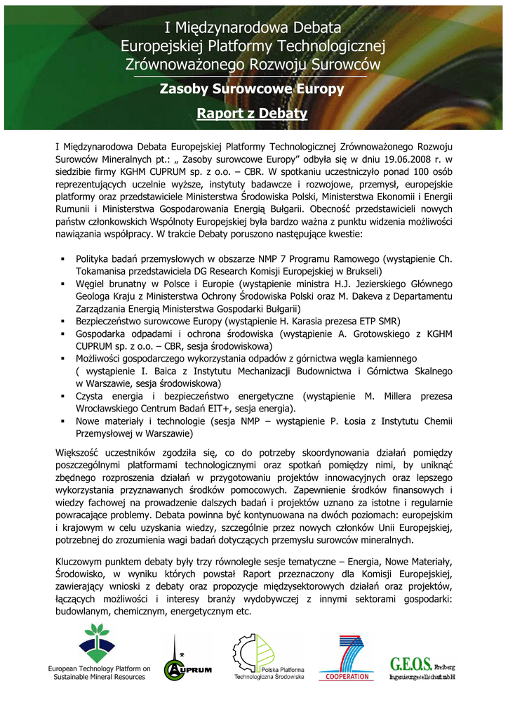 I Międzynarodowa Debata Europejskiej Platformy Technologicznej ZrównowaŜonego Rozwoju Surowców Zasoby Surowcowe Europy Raport z Debaty I Międzynarodowa Debata Europejskiej Platformy Technologicznej ZrównowaŜonego Rozwoju Surowców Mineralnych pt.: „ Zasoby surowcowe Europy” odbyła się w dniu 19.06.2008 r. w siedzibie firmy KGHM CUPRUM sp. z o.o. – CBR. W spotkaniu uczestniczyło ponad 100 osób reprezentujących uczelnie wyŜsze, instytuty badawcze i rozwojowe, przemysł, europejskie platformy oraz przedstawiciele Ministerstwa Środowiska Polski, Ministerstwa Ekonomii i Energii Rumunii i Ministerstwa Gospodarowania Energią Bułgarii. Obecność przedstawicieli nowych państw członkowskich Wspólnoty Europejskiej była bardzo waŜna z punktu widzenia moŜliwości nawiązania współpracy. W trakcie Debaty poruszono następujące kwestie: Polityka badań przemysłowych w obszarze NMP 7 Programu Ramowego (wystąpienie Ch. Tokamanisa przedstawiciela DG Research Komisji Europejskiej w Brukseli) Węgiel brunatny w Polsce i Europie (wystąpienie ministra H.J. Jezierskiego Głównego Geologa Kraju z Ministerstwa Ochrony Środowiska Polski oraz M. Dakeva z Departamentu Zarządzania Energią Ministerstwa Gospodarki Bułgarii) Bezpieczeństwo surowcowe Europy (wystąpienie H. Karasia prezesa ETP SMR) Gospodarka odpadami i ochrona środowiska (wystąpienie A. Grotowskiego z KGHM CUPRUM sp. z o.o. – CBR, sesja środowiskowa) MoŜliwości gospodarczego wykorzystania odpadów z górnictwa węgla kamiennego ( wystąpienie I. Baica z Instytutu Mechanizacji Budownictwa i Górnictwa Skalnego w Warszawie, sesja środowiskowa) Czysta energia i bezpieczeństwo energetyczne (wystąpienie M. Millera prezesa Wrocławskiego Centrum Badań EIT+, sesja energia). Nowe materiały i technologie (sesja NMP – wystąpienie P. Łosia z Instytutu Chemii Przemysłowej w Warszawie) Większość uczestników zgodziła się, co do potrzeby skoordynowania działań pomiędzy poszczególnymi platformami technologicznymi oraz spotkań pomiędzy nimi, by uniknąć zbędnego rozproszenia działań w przygotowaniu projektów innowacyjnych oraz lepszego wykorzystania przyznawanych środków pomocowych. Zapewnienie środków finansowych i wiedzy fachowej na prowadzenie dalszych badań i projektów uznano za istotne i regularnie powracające problemy. Debata powinna być kontynuowana na dwóch poziomach: europejskim i krajowym w celu uzyskania wiedzy, szczególnie przez nowych członków Unii Europejskiej, potrzebnej do zrozumienia wagi badań dotyczących przemysłu surowców mineralnych. Kluczowym punktem debaty były trzy równoległe sesje tematyczne – Energia, Nowe Materiały, Środowisko, w wyniku których powstał Raport przeznaczony dla Komisji Europejskiej, zawierający wnioski z debaty oraz propozycje międzysektorowych działań oraz projektów, łączących moŜliwości i interesy branŜy wydobywczej z innymi sektorami gospodarki: budowlanym, chemicznym, energetycznym etc. European Technology Platform on Sustainable Mineral Resources Sesja Energia Podczas sesji energetycznej przedstawiono moŜliwości finansowania projektów w ramach 7 Programu Ramowego. Po prezentacji wskazano jednak na trudność w aplikowaniu o te środki oraz długotrwałość procesu wnioskowania, oceny i potrzebę budowania olbrzymich konsorcjów, które miałyby realizować te projekty. Po prezentacjach odbyła się dyskusja, podczas której poruszono następujące kwestie: Podziemnego zgazowania – gdzie problemem nie jest juŜ technologia procesu, tylko jak go przeprowadzić na duŜą skalę w róŜnych warunkach geologicznych i górniczych na róŜnej głębokości bez szkody dla środowiska, Limitów emisji CO2 przy jednoczesnym wzroście zapotrzebowania na energią elektryczną (szacowany dwukrotny wzrost zapotrzebowania do roku 2020); W celu spełnienia wymagań emisji limitów CO2 nieuniknione jest pójście w kierunku energii atomowej. Problemem jest lokalizacja takiej elektrowni oraz brak kierunków na uczelniach wyŜszych, na których moŜna by wyszkolić młodą kadrę w zakresie energetyki atomowej i jądrowej, Sekwestracji CO2 – zdeponowanie CO2 w podziemnych wyrobiskach moŜe okazać się nieskuteczne; istnieje potrzeba badań w tym obszarze, Efektu cieplarnianego – zgłoszono zapotrzebowanie na weryfikację rangi tego problemu, który stał się sztandarowym hasłem Komisji Europejskiej i tak znacząco wpływa na rozwój energetyki, Przestarzałej infrastruktury polskiej energetyki i mocy szczytowych. Wnioski z sesji: 1. Z punktu widzenia bezpieczeństwa energetycznego Unii Europejskiej istotnym jest, aby zintensyfikować wykorzystanie własnych surowców energetycznych, w szczególności – węgla kamiennego i węgla brunatnego, 2. Procesy wydobywcze i przeróbcze węgla winny być tak zaprojektowane i realizowane, aby zapewnić „czysty węgiel” dla energetyki, 3. NaleŜy zintensyfikować prace nad składowaniem CO2 w podziemnych strukturach geologicznych. NiezaleŜnie od tych prac naleŜy kontynuować prace badawcze nad oceną wpływu CO2 na zmianę warunków klimatycznych, 4. W związku z występowaniem w Europie złóŜ w trudnych i róŜnorodnych warunkach geologicznych, niezbędne jest kontynuowanie prac nad nowymi technologiami pozyskiwania z uwzględnieniem podziemnej gazyfikacji węgla. Koncepcje projektów badawczych: 1. Nowe technologie pozyskiwania surowców energetycznych i produktów spalania – odpady i gazy cieplarniane, zagospodarowania 2. Koncepcja podziemnego georeaktora, 3. Biologiczne metody konwersji węgla na paliwa płynne i/ lub inne cenne produkty, 4. Autonomiczny region energetyczny w strefie bezpośredniego oddziaływania przemysłu wydobywczego, 5. Sposoby poprawienia efektywności wykorzystania i obniŜenie zuŜycia energii w wysoce energochłonnych przemysłach. Dla punktu 4 waŜne byłoby: − Wskazanie na moŜliwości krzyŜowania procesów energetycznych w celu osiągn