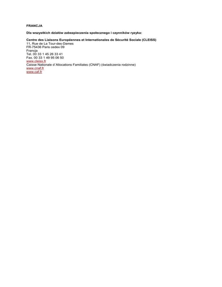 FRANCJA Dla wszystkich działów zabezpieczenia społecznego i czynników ryzyka: Centre des Liaisons Européennes et Internationales de Sécurité Sociale (CLEISS) 11, Rue de La Tour-des-Dames FR-75436 Paris cedex 09 Francja Tel. 00 33 1 45 26 33 41 Fax. 00 33 1 49 95 06 50 www.cleiss.fr Caisse Nationale d´Allocations Familiales (CNAF) (świadczenia rodzinne) www.cnaf.fr www.caf.fr