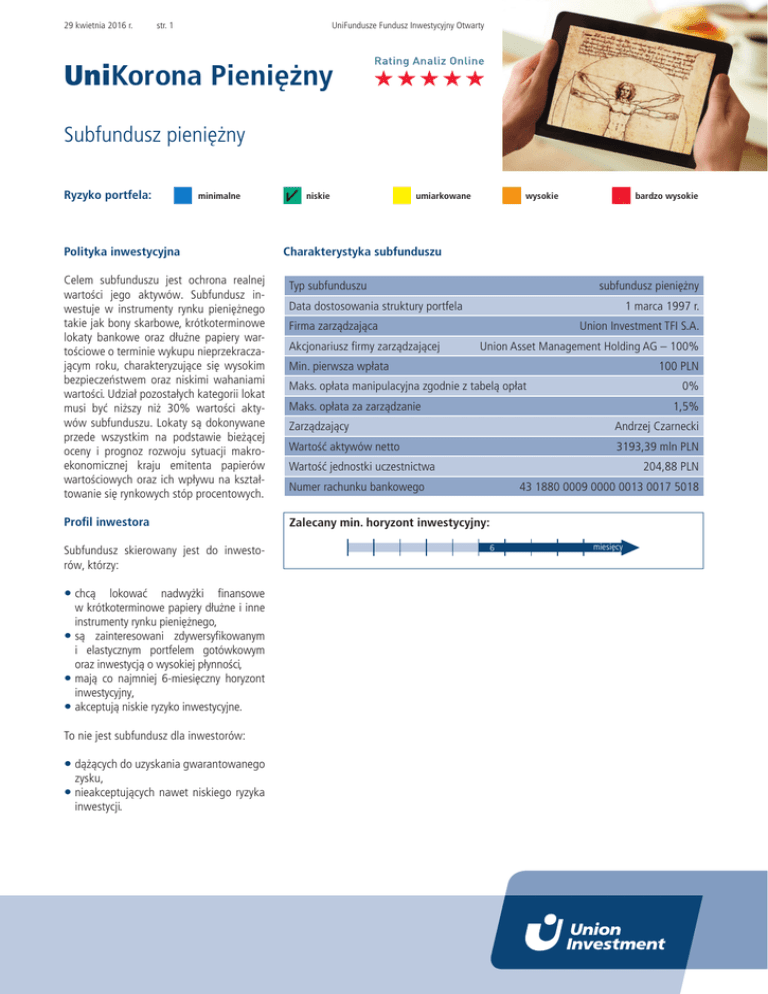 29 kwietnia 2016 r. str. 1 UniFundusze Fundusz Inwestycyjny Otwarty UniKorona Pieniężny Subfundusz pieniężny Ryzyko portfela: minimalne Polityka inwestycyjna niskie umiarkowane wysokie Charakterystyka subfunduszu Celem subfunduszu jest ochrona realnej wartości jego aktywów. Subfundusz inwestuje w instrumenty rynku pieniężnego takie jak bony skarbowe, krótkoterminowe lokaty bankowe oraz dłużne papiery wartościowe o terminie wykupu nieprzekraczającym roku, charakteryzujące się wysokim bezpieczeństwem oraz niskimi wahaniami wartości. Udział pozostałych kategorii lokat musi być niższy niż 30% wartości aktywów subfunduszu. Lokaty są dokonywane przede wszystkim na podstawie bieżącej oceny i prognoz rozwoju sytuacji makroekonomicznej kraju emitenta papierów wartościowych oraz ich wpływu na kształtowanie się rynkowych stóp procentowych. Typ subfunduszu Profil inwestora Zalecany min. horyzont inwestycyjny: Subfundusz skierowany jest do inwestorów, którzy: •chcą lokować nadwyżki finansowe w krótkoterminowe papiery dłużne i inne instrumenty rynku pieniężnego, •są zainteresowani zdywersyfikowanym i elastycznym portfelem gotówkowym oraz inwestycją o wysokiej płynności, •mają co najmniej 6-miesięczny horyzont inwestycyjny, •akceptują niskie ryzyko inwestycyjne. To nie jest subfundusz dla inwestorów: •dążących do uzyskania gwarantowanego zysku, •nieakceptujących nawet niskiego ryzyka inwestycji. bardzo wysokie subfundusz pieniężny Data dostosowania struktury portfela 1 marca 1997 r. Firma zarządzająca Akcjonariusz firmy zarządzającej Union Investment TFI S.A. Union Asset Management Holding AG – 100% Min. pierwsza wpłata 100 PLN Maks. opłata manipulacyjna zgodnie z tabelą opłat 0% Maks. opłata za zarządzanie 1,5% Zarządzający Andrzej Czarnecki Wartość aktywów netto 3193,39 mln PLN Wartość jednostki uczestnictwa 204,88 PLN Numer rachunku bankowego 43 1880 0009 0000 0013 0017 5018 6 miesięcy 29 kwietnia 2016 r. str. 2 UniFundusze Fundusz Inwestycyjny Otwarty UniKorona Pieniężny Subfundusz pieniężny Ryzyko portfela: minimalne niskie umiarkowane wysokie bardzo wysokie Wyniki inwestycyjne subfunduszu i stopy odniesienia* 1m 3m 6m 1 rok 2 lata 5 lat 10 lat UniKorona Pieniężny (%) 0,36 1,07 0,91 1,19 5,21 21,04 57,89 Stopa odniesienia (%) 0,15 0,47 0,96 2,03 4,86 19,07 48,18 Różnica 0,21 0,60 -0,05 -0,85 0,35 1,98 9,71 Sie ’14 Lut ’15 Wrz ’15 * Stopy zwrotu subfunduszu i stopy odniesienia obliczane są na podstawie ostatnich dni roboczych miesiąca. Zmiana wartości jednostki w porównaniu ze stopą odniesienia UniKorona Pieniężny Stopa odniesienia UniKorona Pieniężny 119 114 109 104 99 Kwi ’11 Lis ’11 Cze ’12 Gru ’12 Lip ’13 Sty ’14 Alokacja aktywów Kwi ’16 Stopa odniesienia1 Instrumenty dłużne korporacyjne Bony i obligacje rządowe Pozostałe instrumenty dłużne Instrumenty pochodne 53,96% 44,86% 1,89% -0,71% 0 20 40 60 80 100 Średnie oprocentowanie od 1- do 3-miesięcznych depozytów złotowych oferowanych przez banki komercyjne gospodarstwom domowym w Polsce (źródło: NBP) ¹ Wzorcowy portfel, który stanowi punkt odniesienia do dokonywania oceny wyników zarządzania aktywami funduszu. 29 kwietnia 2016 r. str. 3 UniFundusze Fundusz Inwestycyjny Otwarty UniKorona Pieniężny Subfundusz pieniężny Ryzyko portfela: minimalne niskie umiarkowane Struktura ryzyka walutowego bardzo wysokie Słowniczek PLN EUR USD CHF 70,12% 24,63% 4,25% 1,00% 0 20 40 60 80 100 Współczynniki ryzyka 12 m Beta do WIG 0,04 Information ratio -0,94 Tracking error 0,01 Współczynnik Sharpe’a -0,30 Odchylenie standardowe 0,88% Duration* wysokie Beta do WIG – współczynnik ten pokazuje zależność pomiędzy zmianami wartości jednostki funduszu a zmianami indeksu WIG. Wskaźnik beta wynoszący 1 oznacza, że zmiany wartości jednostki funduszu są takie same jak indeksu WIG. Beta o wartości mniejszej niż 1 oznacza, że wzrost (spadek) stopy odniesienia o 1% jest zazwyczaj powiązany ze wzrostem (spadkiem) wartości indeksu WIG o mniej niż 1%. Wartość beta większa niż 1 oznacza, że wzrost (spadek) indeksu WIG o 1% jest zazwyczaj powiązany ze wzrostem (spadkiem) wartości jednostki funduszu o więcej niż 1%. Information ratio – współczynnik ten pokazuje, jak opłacalne jest ryzyko, jakie ponosi fundusz w stosunku do swojej stopy odniesienia. Im wyższy poziom wskaźnika information ratio, tym przy niższym nakładzie ryzyka w stosunku do stopy odniesienia został osiągnięty wynik funduszu. Fundusz, który osiąga information ratio powyżej 0,3, uważany jest za efektywnie zarządzany. 1,25 10 największych pozycji** WZ0124 WZ0121 WZ0120 PGNiG Finance AB Enea S.A. PZU Finance AB WZ0119 ISIN: PL0000107454 ISIN: PL0000106068 ISIN: PL0000108601 ISIN: XS0746259323 ISIN: PLENEA000088 ISIN: XS1082661551 ISIN: PL0000107603 9,98% 9,67% 5,92% 3,76% 2,95% 2,75% 2,65% Bank Zachodni WBK S.A. ISIN: PLBZ00000176 2,28% PS0418 ISIN: PL0000107314 2,27% ORLEN Capital AB ISIN: XS1082660744 2,26% * Modified duration subfunduszu na dzień 29.01.2016 r. **Dane na podstawie sprawozdania finansowego na dzień 31.12.2015 r. Tracking error – współczynnik ten pokazuje, jak ryzykowny jest dany fundusz w stosunku do swojej stopy odniesienia. Im wyższy wskaźnik, tym bardziej agresywnie zarządzany jest fundusz w stosunku do swojej stopy odniesienia. Wskaźnik stosuje się do porównywania ryzyka funduszy o podobnym profilu (np. funduszy akcyjnych). Współczynnik Sharpe’a – współczynnik ten pokazuje, jak opłacalne jest ryzyko, jakie ponosi fundusz w stosunku do bezpiecznych inwestycji (np. obligacji rządowych). Im wyższy poziom współczynnika Sharpe’a, tym przy niższym nakładzie ryzyka w stosunku do bezpiecznych inwestycji został osiągnięty wynik funduszu. 29 kwietnia 2016 r. str. 4 UniFundusze Fundusz Inwestycyjny Otwarty UniKorona Pieniężny Subfundusz pieniężny Ryzyko portfela: minimalne n