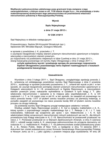 Wadliwości pełnomocnictwa udzielonego poza granicami kraju związane z jego uwierzytelnieniem, o którym mowa w art. 1138 zdanie drugie k.p.c., nie przesądzają o braku materialnoprawnej skuteczności tego pełnomocnictwa do przeniesienia własności nieruchomości położonej w Rzeczypospolitej Polskiej. Wyrok Sądu Najwyższego z dnia 31 maja 2012 r. IV CSK 419/11 Sąd Najwyższy w składzie następującym: Przewodniczący: Sędzia SN Krzysztof Strzelczyk (spr.). Sędziowie SN: Mirosław Bączyk, Grzegorz Misiurek. w sprawie z powództwa J. K. przeciwko J. T. o usunięcie niezgodności między stanem prawnym nieruchomości ujawnionym w księdze wieczystej a rzeczywistym stanem prawnym, po rozpoznaniu na posiedzeniu niejawnym w Izbie Cywilnej w dniu 31 maja 2012 r., skargi kasacyjnej pozwanego od wyroku Sądu Okręgowego z dnia 3 lutego 2011 r.: uchyla zaskarżony wyrok i przekazuje sprawę do ponownego rozpoznania Sądowi Okręgowemu pozostawiając temu Sądowi rozstrzygnięcie o kosztach postępowania kasacyjnego. Uzasadnienie Wyrokiem z dnia 3 lutego 2011 r., Sąd Okręgowy, uwzględniając apelację powoda J. K., wniesioną od oddalającego powództwo wyroku Sąd Rejonowego z dnia 2 września 2010 r., wydanego w sprawie przeciwko pozwanemu J. T., zmienił ten wyrok w pkt I. w ten sposób, że usunął niezgodność pomiędzy stanem prawnym nieruchomości ujawnionym w Księgach wieczystych nr A i B, prowadzonych w Sądzie Rejonowym, a rzeczywistym stanem prawnym przez nakazanie wykreślenia w Działach II tych ksiąg J. T. jako właściciela nieruchomości i wpisanie w to miejsce jako współwłaścicieli J. K. w 3/4 częściach i J. T. w 1/4 części oraz w pkt III. w ten sposób, że zasądził od pozwanego na rzecz powoda kwotę 1.817 zł tytułem zwrotu kosztów procesu za pierwszą instancję, a ponadto zasądził od pozwanego na rzecz powoda kwotę 900 zł tytułem zwrotu kosztów procesu za drugą instancję. Za podstawę wyroku Sąd Okręgowy przyjął następujące ustalenia i wnioski. Według ustaleń Sądu Rejonowego powód J. K. był w związku małżeńskim z A. K., której synem z poprzedniego związku małżeńskiego był J. T. Relacje J. K. i J. T. były rodzicielskie, traktowali się wzajemnie jak ojciec i syn. Małżonkowie J. i A. K. byli właścicielami bliżej oznaczonych nieruchomości rolnych położonych we wsi S., dla których prowadzone były Księgi wieczyste nr A, C i B. Nieruchomości te postanowili przekazać na rzecz J. T. Ponieważ przebywał on w Stanach Zjednoczonych Ameryki, w dniu 5 czerwca 2001 r. udzielił swojej matce A. K. pisemnego pełnomocnictwa do przyjęcia darowizny od rodziców A. i J. małżonków K. Podpis J. T. na pełnomocnictwie został poświadczony przez B. J. B., Notary Public, State of New York, a następnie w dniu 13 sierpnia 2001 r. dokument ten został poświadczony przez Konsula Generalnego Rzeczypospolitej Polskiej w Nowym Jorku za nr (...) jako zgodny z prawem miejsca jego wystawienia. W dniu 26 1 października 2001 r. J. K. oraz A. K., działająca w imieniu własnym a także na podstawie pełnomocnictwa w imieniu syna J. T., zawarli umowę darowizny. W umowie tej małżonkowie J. i A. K. oświadczyli, że darują swojemu synowi J. T. nieruchomości położone w S., a A. K., działając w imieniu J. T., oświadczyła, iż darowiznę tę przyjmuje na jego rzecz. Na podstawie tej umowy w dniu 5 listopada 2001 r. J. T. wpisany został w Księgach wieczystych nr A, C i B jako właściciel 3 nieruchomości. A. K. zmarła w dniu 6 lutego 2008 r., a spadek po niej nabyli mąż J. K. oraz syn J. T. po 1/2 części każdy z nich. W dniu 24 listopada 2009 r. J. T. jako właściciel nieruchomości zawarł z M. K. umowę sprzedaży warunkowej i przeniesienia własności nieruchomości, na podstawie której M. K. wpisany został w Księdze wieczystej nr C jako właściciel nieruchomości i do księgi tej przyłączono część nieruchomości objętej dotychczas Księgą wieczystą nr A. Sąd Rejonowy uznał za niezasadne powództwo oparte na art. 10 ust. 1 ustawy z dnia 6 lipca 1982 r. o księgach wieczystych i hipotece (tekst jedn.: Dz. U. z 2001 r. Nr 124, poz. 1361 z późn. zm.). Nie podzielił stanowiska powoda, który niezgodność stanu prawnego nieruchomości ujawnionego w księgach wieczystych ze stanem rzeczywistym wywodził z nieważności umowy darowizny ze względu na wadliwą formę, niewłaściwej interpretację oraz sfałszowanie pełnomocnictwa do przyjęcia darowizny udzielonego A. K. przez J. T. Sąd Rejonowy, wskazując na art. 12 ustawy z dnia 12 listopada 1965 r. - Prawo prywatne międzynarodowe (Dz. U. Nr 46, poz. 290 z późn. zm.; dalej - "p.p.m.") oraz art. 1138 zd. 2 k.p.c., przyjął, że pełnomocnictwo udzielone A. K. sporządzone zostało we właściwej formie, zgodnej z prawem miejsca jego wystawienia. Sąd Rejonowy podniósł, że wątpliwości co do formy pełnomocnictwa nie miała świadek E. N.-S., która jako notariusz sporządzała sporną umowę darowizny. Odwołując się do art. 65 k.c. Sąd Rejonowy uznał, że strony zarówno umowy darowizny, jak i pełnomocnictwa identycznie pojmowały zwrot "rodzice" i nie budziło wątpliwości, że chodzi o pełnomocnictwo do nabycia w formie darowizny nieruchomości stanowiących własność J. i A. małżonków K. Powód nie kwestionował, że traktował pozwanego jak syna, a ten z kolei traktował powoda jak ojca. Ponadto w pełnomocnictwie, które przedłożone zostało do aktu notarialnego, zaznaczono, że chodzi o darowiznę od rodziców z wymienieniem ich z imienia i nazwiska, stąd okoliczność, że powód jest ojczymem pozwanego nie stanowiła przeszkody do zawarcia umowy darowizny. W ocenie Sądu Rejonowego nie potwierdziły się twierdzenia powoda o sfałszowaniu pełnomocnictwa. Z zeznań świadka E. N.-S. wynikało, że pełnomocnictwo nie zawierało żadnych przeróbek ani podróbek, więc nie było potrzeby przeprowadzenia dowodu z opin
