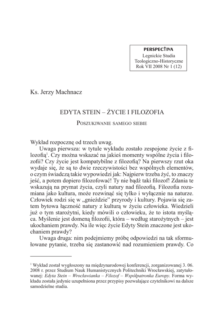 KS. JERZY MACHNACZ 126 † PERSPECTIVA Legnickie Studia Teologiczno-Historyczne Rok VII 2008 Nr 1 (12) Ks. Jerzy Machnacz EDYTA STEIN – ŻYCIE I FILOZOFIA POSZUKIWANIE SAMEGO SIEBIE Wykład rozpocznę od trzech uwag. Uwaga pierwsza: w tytule wykładu zostało zespojone życie z filozofią1. Czy można wskazać na jakieś momenty wspólne życia i filozofii? Czy życie jest kompatybilne z filozofią? Na pierwszy rzut oka wydaje się, że są to dwie rzeczywistości bez wspólnych elementów, o czym świadczą takie wypowiedzi jak: Najpierw trzeba żyć, to znaczy jeść, a potem dopiero filozofować! Ty nie bądź taki filozof! Zdania te wskazują na prymat życia, czyli natury nad filozofią. Filozofia rozumiana jako kultura, może rozwinąć się tylko i wyłącznie na naturze. Człowiek rodzi się w „gnieździe” przyrody i kultury. Pojawia się zatem bytowa łączność natury z kulturą w życiu człowieka. Wiedzieli już o tym starożytni, kiedy mówili o człowieku, że to istota myśląca. Myślenie jest domeną filozofii, która – według starożytnych – jest ukochaniem prawdy. Na ile więc życie Edyty Stein znaczone jest ukochaniem prawdy? Uwaga druga: nim podejmiemy próbę odpowiedzi na tak sformułowane pytanie, trzeba się zastanowić nad rozumieniem prawdy. Co Wykład został wygłoszony na międzynarodowej konferencji, zorganizowanej 3. 06. 2008 r. przez Studium Nauk Humanistycznych Politechniki Wrocławskiej, zatytułowanej: Edyta Stein – Wrocławianka – Filozof – Współpatronka Europy. Forma wykładu została jedynie uzupełniona przez przypisy pozwalające czytelnikowi na dalsze samodzielne studia. 1 Edyta Stein – życie i filozofia 127 to jest prawda? Wśród wielu odpowiedzi na to pytanie, a mamy ich wiele, jedna posiada dla nas znaczenie fundamentalne. Na niej będziemy budować odpowiedź na postawione pytanie2. Fundamentalne dla nas jest takie rozumienie prawdy, która wiąże ją z tym co realne. Nasze życie jest najbardziej realnym wydarzeniem. Klasyczna definicja prawdy – sformułowana przez starożytnych – mówi, że prawda to zgodność myśli z tym co jest; to odpowiedniość myśli do tego co jest; to dorzeczność – myśli trafiają dokładnie w to co jest. Tym samym są pojęcia – myśli czemuś odpowiadające, w coś trafiające, z czymś związane oraz pojęcia – myśli „puste”, za którymi nic się nie kryje. W tym sensie prawda jest wydarzeniem między podmiotem i przedmiotem, dokonuje się w wymiarze subiektywnym: podmiot wychyla się ku rzeczywistości względem niego obcej i obiektywnym: przedmiot „daje” mu się poznać. Sam subiektywizm prowadzi od relatywizmu i nihilizmu: każdy ma swoją prawdę, czyli: nie ma żadnej wspólnej prawdy. Sam obiektywizm prowadzi zaś do absolutyzmu: jest tak i na tym koniec, nie ma o czym dyskutować. Subiektywizm i obiektywizm nie pozwalają na poznanie prawdy, nie dopuszczają jej do głosu, gdyż nie liczą się z rzeczywistością, pierwszy neguje istnienie przedmiotu, drugi – podmiotu. Podejście subiektywno-obiektywne pozwala zbliżyć się do prawdy, zwłaszcza do prawdy życia. Zastanówmy się nad znaczeniem prawdy w życiu Edyty Stein lub inaczej mówiąc – nad jej wydarzeniem życia w prawdzie. Uwaga trzecia: zwraca naszą myśl na „niepokój serca”, o którym mówi św. Augustyn3. Ten niepokój serca odczuwają – mniej lub bardziej, wcześniej lub później – wszyscy ludzie. Niepokój serca można oddać w czterech pytaniach: Skąd przyszedłem? Dokąd zmierzam? Co powinienem czynić, to znaczy: co mi wolno? Te trzy pytania spoczywają na pytaniu podstawowym: kim właściwie jestem? Istota człowieka wyznacza jego nadzieje i powinności. Postawione pytania nazywamy pytaniami egzystencjalnymi i każdy ma na nie swoją własną, mniej lub bardziej przemyślaną odpowiedź. Każdy ma filozofię życia. W życiu i twórczości filozoficznej E. Stein dają się wydzielić trzy okresy poszukiwania prawdy własnego życia: 1) okres filozofii feno- Por. J. WOLEŃSKI. Epistemologia. Prawda i realizm. T. III. Kraków 2003. Św. AUGUSTYN. Wyznania. Kraków 1994 s. 23: „Stworzyłeś nas bowiem jako skierowanych ku Tobie. I niespokojne jest serce nasze, dopóki w Tobie nie spocznie”. 2 3 128 KS. JERZY MACHNACZ menologicznej; 2) okres filozofii klasycznej; 3) okres filozofii krzyża znaczony w znacznej mierze jej pracami: O zagadnieniu wczucia4, Byt skończony a byt wieczny5, Wiedza krzyża6. 1. OKRES FENOMENOLOGICZNY Jak wielu przed nią i wielu po niej, tak i E. Stein próbuje znaleźć odpowiedź na pytanie o samego siebie w psychologii. Psychologia, rozumiana jako nauka o życiu wewnętrznym człowieka, daje się być predysponowana do dania odpowiedzi na pytanie o to, co stanowi o człowieku, kim człowiek właściwie jest. Ogromne rozczarowanie do psychologii E. Stein, prawie psychiczne załamanie – świadczy o życiowej powadze studiów, które podjęła7. W pierwszym rzędzie zajmowała się przez cztery semestry psychologią nie po to, aby mieć dobry zawód, zabezpieczający jej godziwą przyszłość. To oczywiście było ważne, ale najważniejsze dla niej było zgłębienie tajemnicy jej własnego istnienia. Studiowała psychologię, aby dogłębnie poznać siebie, jednak nie mogła tego osiągnąć, ponieważ psychologia w wydaniu sławnego profesora Sterna nie miała silnych podstaw metodologicznych, była uprawiana na wyczucie, brakowało jej naukowych podstaw. Na przełomie XIX i XX w. psychologia stała się podstawową nauką o człowieku, ponieważ filozofia załamała się, przestała istnieć po wielkich systemach idealistycznych. Gdzie zatem szukać naukowej odpowiedzi na pytanie o człowieka? Przypadek, szczęśliwy traf, zdarzenie losu? E. Stein studiowała psychologię i przeżywała pierwszy głęboki kryzys. W tym czasie E. Husserl osiągnął szczyt sławy. Badaniami logicznymi rozprawił się E. STEIN. O zagadnieniu uczucia. Przeło