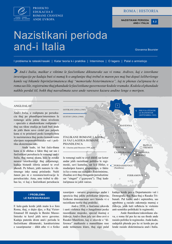 Council of Europe Conseil de l´Europe PROJEKTO EDUKACIJA E ROMANE CHAVENGI ANDE EVROPA Roma | Historia Nazistikani perioda and-i italia Nazistikani perioda and-i Italia 5.2 Giovanna Boursier I problema le rateski/rasaki | Katar teoria k-i praktika | Internimos | O lagero | Palal o armisticjo And-i Italia, maškar e viktime le fasčistikane diktaturake sas vi roma. Avdives, kaj e istorikane investigacije pe kadaja buti si numaj k-o anglunipe thaj trebul te maren pes maj but dopaš šeliberšenge kamle vaj bikamle biprinžarimatenca thaj “memoriake bisterimatenca”, šaj te phenas čačipnasa ke e roma sas lile, registruime thaj phandade le fasčistikane guvernostar kodole vramako. Kodola ol phandade nakhle perdal šil, bokh thaj nasvalimata save ande varesave kazura andine lenge o meripen. ANGLOALAV 1 Gotikani linia (1945) And-i Italia, e rodipnata pe persekucia thaj po phandlipen/internimos le romengo ačile jekhe tikne niveloste – specialo e akademikane rodipnata – thaj sas tikne studija pe kadi buti ande de jekh them savo cirdel pes palpale kana si te prinžarel peski kompliciteta le nazisturenca thaj pesko konsekvento ulavipen responsabilitatako vaš i politika eksterminaciaki. Anda kado, isi but čuče-thana kana si te dikhas e fakte thaj sar sas i fasčistikani persekucia le romengi and-i Italia, thaj numaj akana, nais le zorake nesave istorikurengi thaj ridjarnengi, kadaja bistardi istoria astarel te ovel phendi. Pe bibaxt, jekh numero le viktimengo inke nanaj prinžardo. Našti žanen pes ni e rezonura/motivacije le persekuciake. Ama, ame trubul te dikhas ke, vi kaj e fasčistikani persekucia i problema le rateski/rasaki E kale-gada kerde jekh mašo k-o foro Roma, thaj, o dujto djes, o Raj VictorEmanuel III mangla le Benito Mussolinieske te kerel jekh nevo guverno. Kadaja puterda drom and-i perioda le fasčistikane diktaturaki, karakterizime e xasaripnastar – dikh athe vi o fiziko 1 Gustav linia (1944) Phuvja uštavde le Rajxostar (septembra 1943) Ravenna Apenini Italikane romane lagerja vaj lagerja romane phandlenca Ill. 1 (bazime palal Boursiers 1999, p.24) Abruzzi Tossicia Campobasso le romengi našti te ovel dikhli sar kotor andar jekh rasistikani politika le regimoski, savi kamelas, sar k-o Hitler, o mudaripen kasave grupurengo, o fakto isi ke e roma sas sadajekh diskriminime, čhudine avri thaj čhingarde/persekutime sar “zingari” (“gypsyura”). Thaj kado čačipnasa isi jekh vareso. xasaripen – sarsave grupurengo andar i opozicia thaj jekhe politikatar imperialistikone dominaciatar savi bianda vi e rasistikane teorie thaj praktike. And-o 1938, o fasčismo sikavda i sasti violenca thaj o žungalimos peske rasostikane mujesko, special mamuj e židovja. And-o čhon july sas dino avri o Rasako Manifesto, kaj si sikavde e “diference” maškarale e manušikane rase ande termenura klaro, thaj sigo palal inzêlo Tremiti Agnona Boiano Perdasdefogu (Sardinia) Ferramonti kadaja kerde pes o Departamento vaš i Demografia thaj Rasa thaj o Rasako Tribunali. Pal kado, and-i septembra, sas aprobime e rasialo zakonurja mamuj e židovja, jekh šuži reflekcia le violento anti-semitiko politikaki le regimoski. Ande thamikane/zakonikane alava, e roma fal pes ke na sas thode ande rasialo politike le regimoske. Anda kado, sadajekh phenda pes ke ni kerda pes pe lende rasialo diskriminacia and-i Italia. I problema le rateski/rasaki Katar teoria k-i praktika Internimos O lagero Palal o armisticjo Tipurja internimaske Ill. 2 (Detalio) O ministerialo internimasko ordino andar 11 septembra 1940: “… liindos and-o dikhipen ke von varekana keren bare bilčhimata, kaj kadaja si lengo rat thaj e metode organizipnaske, thaj liindoj and-o dikhipen o šaipen ke maškar lende si alementura save dašti keren anti-nacionalo akcije, isi musaj kaj sa e gypsyura te oven kontrolime... Isi ordino kaj kodola italikane themutnimaske, vi te si konfirmime, vi te na, save inke si phirutne, te oven astarde sa maj sigo posibil thaj te oven kidine telal zurali paza/rakhipen ande jekh than kaj si lačho vaš kado ande svaki provincia... rigate katar e maj khanile vaj suspičiosa elementura savi si te oven bičhalde ande insule vaj regionurja...” Roma prizonierja sas čačipnasa subijekto vaš e generalo regule internimaske and-i Italia, saven sas len duj procedure: internimos ande”koncentracion lagerja” thaj musajutni/kompulsory rezidenca ande jekh than thodo vaš kodo (von trubulas te bešen ande jekh than thaj na sas mukle te inkljon othar). E duj tipurja iternimaske sas kerde pretele eksklusiv and-e durjarde thana thaj and-e tikne gava, ande phare kondicije živipnaske, kaj e prizonierja sas subijekto jekhe but-bare numeroske thaj butivar but khanile regule vaš lengo kontrolo thaj supervizia. O Andruno Ministeri dia ordino kaj e lagerja te oven kerde ande mukle vaj na but labjarde/uzime konstrukcije, dur e strategikane vasne centrurendar thaj sa maj posibil and-e durutne thana. But andar e lagerja sas and-e regioura le maškarutne Italiake, special and-e maškarutni Apeninjengi xar thaj and-o Abruzzi. Ill. 3 (lilo andar Boursier 1999, p. 18) Ama von sas, vorta de katar o anglunipen, dikhle kasave politikendar thaj ordinurendar. Vi and-i Italia sas jekh “gypsykani problema” savi, sar šaj te dikhas, astarda te sikavdjol andar 1926 orde thaj barili but palal o pharipen le maripnasko. And-e akanutne berša e arxive sikavde but andar i teorizacia po supozime “gypsykano trašavipen” le vramako, dikh athe e ideje te keren pes arxitektura le rasialo politikake, sar si o Guido Landra, šerutno le Ofisosko vaš e Rasialo Rodipnata/Studije katar o Ministeri le Popularo Kulturako. O Landra, sar vi aver anglal thaj palal leste, kerdja i problema jekh rasialo, le referencienca k-i evaluacia le fiziko thaj moralo kaliteturengi le “gypsikane rasake” [Ill. 5] katar teoriak-i praktika But andar kodola save studiisarde i problema le fasčistikane persekuciaki na kidine jekh arxivikano materiali, 