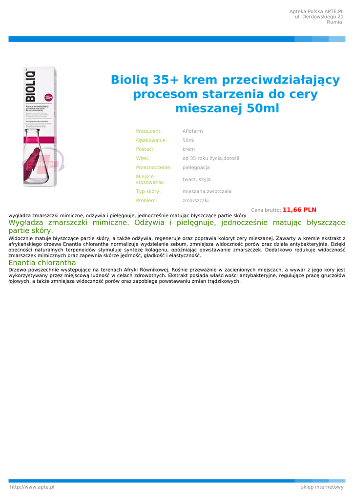 Apteka Polska APTE.PL ul. Derdowskiego 21 Rumia Bioliq 35+ krem przeciwdziałający procesom starzenia do cery mieszanej 50ml Producent: Aflofarm Opakowanie: 50ml Postać: krem Wiek: od 35 roku życia,dorośli Przeznaczenie: pielęgnacja Miejsce stosowania: twarz, szyja Typ skóry: mieszana,zwiotczała Problem: zmarszczki Cena brutto: 11,66 PLN wygładza zmarszczki mimiczne, odżywia i pielęgnuje, jednocześnie matując błyszczące partie skóry Wygładza zmarszczki mimiczne. Odżywia i pielęgnuje, jednocześnie matując błyszczące partie skóry. Widocznie matuje błyszczące partie skóry, a także odżywia, regeneruje oraz poprawia koloryt cery mieszanej. Zawarty w kremie ekstrakt z afrykańskiego drzewa Enantia chlorantha normalizuje wydzielanie sebum, zmniejsza widoczność porów oraz działa antybakteryjnie. Dzięki obecności naturalnych terpenoidów stymuluje syntezę kolagenu, opóźniając powstawanie zmarszczek. Dodatkowo redukuje widoczność zmarszczek mimicznych oraz zapewnia skórze jędrność, gładkość i elastyczność. Enantia chlorantha Drzewo powszechnie występujące na terenach Afryki Równikowej. Rośnie przeważnie w zacienionych miejscach, a wywar z jego kory jest wykorzystywany przez miejscową ludność w celach zdrowotnych. Ekstrakt posiada właściwości antybakteryjne, regulujące pracę gruczołów łojowych, a także zmniejsza widoczność porów oraz zapobiega powstawaniu zmian trądzikowych. http://www.apte.pl sklep internetowy