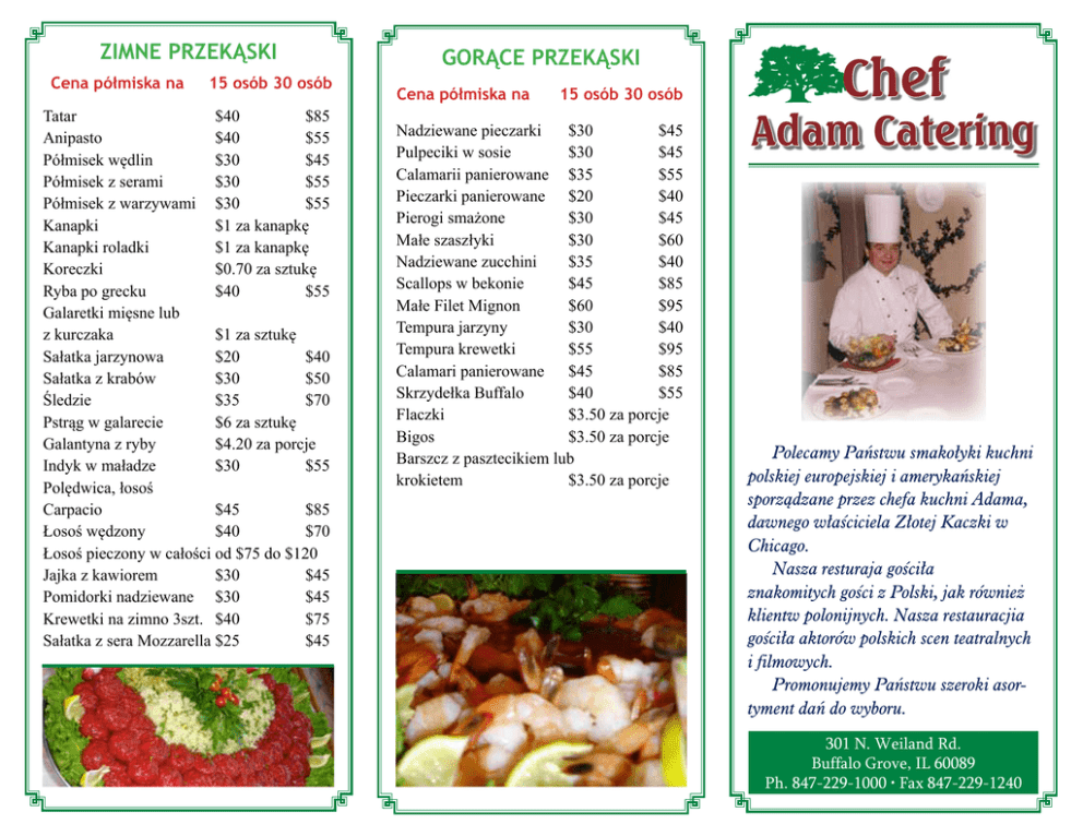 ZIMNE PRZEKĄSKI Cena półmiska na 15 osób 30 osób Tatar $40$85 Anipasto $40$55 Półmisek wędlin $30 $45 Półmisek z serami $30 $55 Półmisek z warzywami $30 $55 Kanapki $1 za kanapkę Kanapki roladki $1 za kanapkę Koreczki $0.70 za sztukę Ryba po grecku $40 $55 Galaretki mięsne lub z kurczaka $1 za sztukę Sałatka jarzynowa $20 $40 Sałatka z krabów $30 $50 Śledzie $35 $70 Pstrąg w galarecie $6 za sztukę Galantyna z ryby $4.20 za porcje Indyk w maładze $30 $55 Polędwica, łosoś Carpacio $45 $85 Łosoś wędzony $40 $70 Łosoś pieczony w całościod $75 do $120 Jajka z kawiorem $30 $45 Pomidorki nadziewane $30 $45 Krewetki na zimno 3szt. $40 $75 Sałatka z sera Mozzarella$25 $45 GORĄCE PRZEKĄSKI Cena półmiska na 15 osób 30 osób Nadziewane pieczarki $30 $45 Pulpeciki w sosie $30 $45 Calamarii panierowane $35 $55 Pieczarki panierowane $20 $40 Pierogi smażone $30 $45 Małe szaszłyki $30 $60 Nadziewane zucchini $35 $40 Scallops w bekonie $45 $85 Małe Filet Mignon $60 $95 Tempura jarzyny $30 $40 Tempura krewetki $55 $95 Calamari panierowane $45 $85 Skrzydełka Buffalo $40 $55 Flaczki $3.50 za porcje Bigos $3.50 za porcje Barszcz z pasztecikiem lub krokietem $3.50 za porcje Chef Adam Catering Polecamy Państwu smakołyki kuchni polskiej europejskiej i amerykańskiej sporządzane przez chefa kuchni Adama, dawnego właściciela Złotej Kaczki w Chicago. Nasza resturaja gościła znakomitych gości z Polski, jak również klientw polonijnych. Nasza restauracjia gościła aktorów polskich scen teatralnych i filmowych. Promonujemy Państwu szeroki asortyment dań do wyboru. 301 N. Weiland Rd. Buffalo Grove, IL 60089 Ph. 847-229-1000 • Fax 847-229-1240 Zestaw Nr 1 $12.00 od osoby Zestaw Nr 2 $15.00 od osoby Wybierz 2 dania gorące Wybierz 3 dania gorące (możesz wybierać również z zestawu Nr1) Pieczony Kurczak Kurczak po Grecku Kurczak nadziewany - pieczarki, karchochy, szpinak Pierś Kurczaka Polonaise Pierś Kurczaka z karczochami Paprykasz z Kurczka Pierś z Kurczka panierowana Stroganoff Bitki Pulpeciki wieprzowe z sosem do wyboru Gołąbki Rolada wieprzowa Gulasz wieprzowy Wieprzowina po staropolsku Gulasz węgierski Spaghetti z sosem Marinara i pulpecikami Pasta fettucini z sosem Alfredo Włosy anielskie z owocami morza Szaszłyki Pieczona szynka Kotlet mielony Kotlet schabowy Kiełbasa z Kapustą Zupy na specjalne życzenie Zrazy zawijane Wołowina w jarzynach Pot Roast Wołowina gotowana z sosem chrzanowym London broil BBQ żeberka Bryzol Kotlet schabowy Kurczak nadziewany karczochami i szpinakiem Kurczak nadziewany pieczarkami i masłem Kurczak Marsala Kurczak Alba Pieczony indyk z nadzieniem i brzoskwiniami Cornish Hen Pieczona baranina Pieczone ryby Łosoś lub inna ryba Florentine ze szpinakiem i serem Kaczka pieczona w całości $3 extra Schab pieczony w sosie pieczarkowym Polędwiczki wieprzowe w sosie Portabello DODATKOWA OPŁATA $10 OD OSOBY: Polędwica wołowa pieczona w całości Prime rib DODATKI DO WYBORU: WYBIERZ 4 Ziemniaki czerwone zapiekane Ziemniaki gotowane Ziemniaki ubite (mashed) Pierogi mix 2 na osobę Ryż pilaf Kasza gryczana Kopytka Makarony Jarzynki na gorąco Jarzynka mix Zielona fasolka Kalafior Brokuły Buraczki zasmażane Marchewka z groszkiem Kapusta zasmażana Na zimno Mizeria Kapusta czerwona Surówka z kapusty Sałatka bułgarska Buraczki na zimno Cole Slaw Sałatka z porów ZA DODATKOWĄ OPŁATĄ DOSTARCZAMY STOŁY, PODGRZEWACZE, OBRUSY, ROBIMY SPECJALNE MENU DLA POTRZEB KLIENTA. SERDECZNIE POLECAMY NASZA OBSŁUGĘ. DOLICZAMY $25 ZA DOWÓZ JEDZENIA. Min. 15 osób. TAX 9%