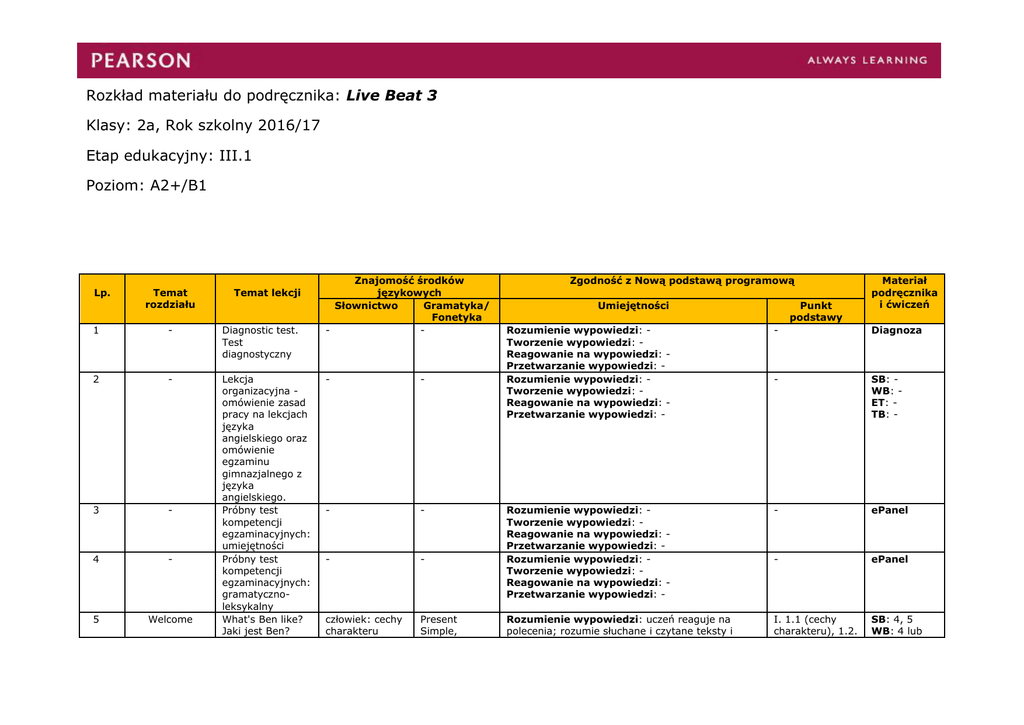Rozkład materiału do podręcznika: Live Beat 3 Klasy: 2a, Rok szkolny 2016/17 Etap edukacyjny: III.1 Poziom: A2+/B1 Lp. Temat rozdziału Temat lekcji 1 - Diagnostic test. Test diagnostyczny 2 - 3 - 4 - 5 Welcome Lekcja organizacyjna omówienie zasad pracy na lekcjach języka angielskiego oraz omówienie egzaminu gimnazjalnego z języka angielskiego. Próbny test kompetencji egzaminacyjnych: umiejętności Próbny test kompetencji egzaminacyjnych: gramatycznoleksykalny What's Ben like? Jaki jest Ben? Znajomość środków językowych Słownictwo Gramatyka/ Fonetyka - - - - - - - człowiek: cechy charakteru Present Simple, Zgodność z Nową podstawą programową Umiejętności Punkt podstawy Materiał podręcznika i ćwiczeń Rozumienie wypowiedzi: Tworzenie wypowiedzi: Reagowanie na wypowiedzi: Przetwarzanie wypowiedzi: Rozumienie wypowiedzi: Tworzenie wypowiedzi: Reagowanie na wypowiedzi: Przetwarzanie wypowiedzi: - - Diagnoza - SB: WB: ET: TB: - Rozumienie wypowiedzi: Tworzenie wypowiedzi: Reagowanie na wypowiedzi: Przetwarzanie wypowiedzi: Rozumienie wypowiedzi: Tworzenie wypowiedzi: Reagowanie na wypowiedzi: Przetwarzanie wypowiedzi: - - ePanel - ePanel Rozumienie wypowiedzi: uczeń reaguje na polecenia; rozumie słuchane i czytane teksty i I. 1.1 (cechy charakteru), 1.2. SB: 4, 5 WB: 4 lub Present Continuous 6 Welcome This is my house. To jest mój dom. dom: opis domu, pomieszczeń domu i ich wyposażenia rzeczowniki policzalne i niepoliczalne z some, any, a/an, no 7 Welcome Martin's blog. Blog Martina. praca: popularne zawody i związane z nimi czynności; życie rodzinne i towarzyskie: czynności życia codziennego Past Simple, Past Continuous 8 Welcome Where's that? Gdzie to jest? człowiek: ubrania; zakupy i usługi: sprzedawanie i kupowanie pytania szczegółowe 9 Performance I'm going to człowiek: sposoby znajduje w nich określone informacje; stosuje strategie komunikacyjne i kompensacyjne w celu zrozumienia tekstu zawierającego nieznane słowa i zwroty Tworzenie wypowiedzi: uczeń opisuje charakter osób Reagowanie na wypowiedzi: Przetwarzanie wypowiedzi: Rozumienie wypowiedzi: uczeń reaguje na polecenia; rozumie słuchane i czytane teksty i znajduje w nich określone informacje; stosuje strategie komunikacyjne i kompensacyjne w celu zrozumienia tekstu zawierającego nieznane słowa i zwroty Tworzenie wypowiedzi: uczeń opisuje wymarzony pokój Reagowanie na wypowiedzi: Przetwarzanie wypowiedzi: Rozumienie wypowiedzi: uczeń reaguje na polecenia; rozumie słuchane i czytane teksty i znajduje w nich określone informacje; stosuje strategie komunikacyjne i kompensacyjne w celu zrozumienia tekstu zawierającego nieznane słowa i zwroty Tworzenie wypowiedzi: Reagowanie na wypowiedzi: uczeń uczestniczy w rozmowie - uzyskuje i udziela informacji na temat czynności, które wykonywali członkowie rodziny w podanych terminach Przetwarzanie wypowiedzi: uczeń przekazuje w języku angielskim informacje zawarte w tekście obcojęzycznym Rozumienie wypowiedzi: uczeń reaguje na polecenia; rozumie słuchane i czytane teksty i znajduje w nich określone informacje; stosuje strategie komunikacyjne i kompensacyjne w celu zrozumienia tekstu zawierającego nieznane słowa i zwroty Tworzenie wypowiedzi: uczeń wyraża i uzasadnia swoją opinię na temat ubrań przedstawionych na fotografii Reagowanie na wypowiedzi: uczeń uczestniczy w rozmowie - uzyskuje i udziela informacji na temat ubrań osób z fotografii Przetwarzanie wypowiedzi: Rozumienie wypowiedzi: uczeń reaguje na (opis domu, pomieszczeń domu i ich wyposażenia); II. 2.1., 2.3., 3.3.; III. 4.1.; 12. MEL ET: TB: 28, 29 I. 1.2. (opis domu, pomieszczeń domu i ich wyposażenia); II. 2.1., 2.3., 3.3.; III. 4.1.; 12. SB: 6, 7 WB: 5 lub MEL ET: TB: 30, 31 I. 1.4. (popularne zawody i związane z nimi czynności), 1.5. (czynności życia codziennego), 1.7. (sprzedawanie i kupowanie); II. 2.1., 2.3., 3.3.; III. 4.1., 4.5.; IV. 6.4.; V. 8.1.; 12. I. 1.1. (ubrania), 1.7. (sprzedawanie i kupowanie); II. 2.1., 2.3., 3.3.; III. 4.1., 4.5.; IV. 6.4.; 12. SB: 8, 9 WB: 6 lub MEL ET: TB: 32, 33 I. 1.1. SB: 12, 13 SB: 10, 11 WB: 7 lub MEL ET: TB: 34, 35 apply. Zamierzam się zgłosić. zainteresowania ; kultura: gatunki muzyczne, instrumenty muzyczne wyrażania przyszłości: going to, Future Simple 10 Performance I'm going out. Wychodzę. życie rodzinne i towarzyskie: formy spędzania czasu wolnego Present Continuous plany na przyszłość; głoski /eı/, /aı/ 11 Performance They're the best films ever! To najlepsze filmy! kultura: film; przymiotniki wyrażające opinię stopniowanie przymiotników 12 Performance Music festivals. Festiwale muzyczne. kultura: uczestnictwo w kulturze; elementy wiedzy o - polecenia; rozumie słuchane i czytane teksty i znajduje w nich określone informacje; stosuje strategie komunikacyjne i kompensacyjne w celu zrozumienia tekstu zawierającego nieznane słowa i zwroty Tworzenie wypowiedzi: uczeń opowiada o ulubionym gatunku muzycznym, ulubionym wykonawcy, na jakim instrumencie chciałby grać, czy chodzi na koncerty, itp. Reagowanie na wypowiedzi: Przetwarzanie wypowiedzi: uczeń przekazuje w języku angielskim informacje zawarte w tekście obcojęzycznym Rozumienie wypowiedzi: uczeń reaguje na polecenia; rozumie słuchane i czytane teksty i znajduje w nich określone informacje; stosuje strategie komunikacyjne i kompensacyjne w celu zrozumienia tekstu zawierającego nieznane słowa i zwroty Tworzenie wypowiedzi: uczeń opisuje plany Luke'a i Jodie na nadchodzący tydzień; opowiada o swoich planach na nadchodzący tydzień Reagowanie na wypowiedzi: uczeń uczestniczy w rozmowie - zaprasza, przyjmuje i odrzuca zaproszenie Przetwarzanie wypowiedzi: uczeń przekazuje w języku angielskim informacje zawarte w tekście obcojęzycznym Rozumienie wypowiedzi: uczeń reaguje na polecenia; rozumie słuchane i czytane teksty i znajduje w nich określone informacje; stosuje strategie komunikacyjne i kompensacyjne w ce