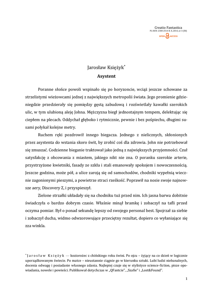 Creatio Fantastica PL ISSN: 2300-2514 R. X, 2014, nr 3 (50) Jarosław Księżyk Asystent Poranne słońce powoli wspinało się po horyzoncie, wciąż jeszcze schowane za strzelistymi wieżowcami jednej z największych metropolii świata. Jego promienie gdzieniegdzie przedzierały się pomiędzy gęstą zabudową i rozświetlały kawałki szerokich ulic, w tym ulubioną aleję Johna. Mężczyzna biegł jednostajnym tempem, delektując się ciepłem na plecach. Oddychał głęboko i rytmicznie, pewnie i bez pośpiechu, długimi susami połykał kolejne metry. Ruchem ręki pozdrowił innego biegacza. Jednego z nielicznych, skłonionych przez asystenta do wstania skoro świt, by zrobić coś dla zdrowia. John nie potrzebował się zmuszać. Codzienne bieganie traktował jako jedną z największych przyjemności. Czuł satysfakcję z obcowania z miastem, jakiego nikt nie zna. O poranku szerokie arterie, przystrzyżone kwietniki, fasady ze szkła i stali emanowały spokojem i nowoczesnością. Jeszcze godzina, może pół, a ulice zaroją się od samochodów, chodniki wypełnią wiecznie zagonionymi pieszymi, a powietrze straci rześkość. Poprawił na nosie swoje najnowsze aery, Discovery Z, i przyspieszył. Zielone strzałki układały się na chodniku tuż przed nim. Ich jasna barwa dobitnie świadczyła o bardzo dobrym czasie. Właśnie minął bramkę i zobaczył na tafli przed oczyma pomiar. Był o ponad sekundę lepszy od swojego personal best. Spojrzał za siebie i zobaczył ducha, widmo odwzorowujące przeciętny rezultat, dopiero co wyłaniające się zza winkla. J a r o s ł a w K s i ę ż y k — koziorożec z chińskiego roku świni. Po ojcu – żyjący na co dzień w logicznie uporządkowanym świecie. Po matce – nieustannie ciągnie go w kierunku sztuki. Lubi ludzi niebanalnych, docenia odwagę i posiadanie własnego zdania. Najlepiej czuje się w stylistyce science-fiction, pisze opowiadania, nowele i powieści. Publikował dotychczas w „QFantcie”, „Szafie” i „Lost&Found”. 1 — Wspaniale ci idzie, Johnie Longhornie! — powiedziała z entuzjazmem jego prywatna, wirtualna asystentka, Chloe. Smukła twarz uśmiechniętej brunetki zamigotała w prawym górnym rogu okularów rzeczywistości rozszerzonej. — Dzięki, Chloe. — Już widzę zazdrość znajomych, gdy pochwalisz się nowym rekordem. — Nie zależy mi na poklasku, robię to dla przyjemności — mówił lekko zdyszany. — Każdy tak twierdzi. Jednak statystyki Toddle dowodzą… — Bo cię wyłączę! — Już milknę… Trasa prowadziła wzdłuż szerokiego, spacerowego bulwaru, skąd odbijała w prawo w kierunku niewielkiego parku, właściwie skweru, i dalej wiodła wprost do domu. Gdy mijał wysokie, stalowe latarnie, przypomniał sobie, że kiedyś biegał inaczej. Zdaje się, że skręcał w lewo i nadrabiał dobry kilometr. A potem Chloe zmieniła szlak, w trosce o rozkład dnia. Tak to przynajmniej tłumaczyła. — John, co robisz? — zaniepokoiła się asystentka. W tym samym momencie John zobaczył w szkłach ostrzeżenie. Zbaczał z wytyczonej trasy. — Wprowadzam odmianę. Mam dziś trochę więcej czasu. — Ale co z wynikiem? Zmarnujesz taki dobry rezultat? — Do diabła z rekordami. Skręcił gwałtownie i wbiegł w uliczkę odchodzącą w lewo. Gdzieś za jego plecami przebiegły fantomy prezentujące historyczne rezultaty. Pogodził się z tym, że dobry czas został stracony. Przeszedł w trucht i rozejrzał się wokoło. Wzdłuż czerwonego chodnika posadzono niewysoki żywopłot. Za nim rosła gęsta i zielona trawa. Parędziesiąt metrów dalej piętrzyły się zabudowania nowej dzielnicy biznesowej, wzniesione według współczesnych wzorców. Fasadą przypominały kamienice, kształtem nierówno ułożone wieże z klocków. Każdą wypustkę bądź zagłębienie wykorzystano na zbudowanie małego tarasiku czy loggii. Tam, gdzie było to niemożliwe, w powietrzu wisiał na linach stalowy chodnik, wyścielony trawą i ozdobiony krzewami. Natura, zieleń, spokój, lepsza wydajność. — John, nie powinieneś tam iść — powiedziała spokojnie, acz dobitnie Chloe. Jej obraz, od pasa w górę, zajął teraz cały okular aerek tak, że przesłaniał większość widoku. Splotła ręce na piersi i spojrzała podejrzliwie. 2 — Dlaczego? — wymamrotał zbity z tropu. — Granica wpływów. Tutaj zaraz kończy się Toddle. — Dziwne, pamiętam przecież... — To było dawno temu — przerwała mu ostro. — Strefy cały czas się zmieniają. Nie zawsze jesteśmy w stanie wygrywać. — Hmm — zasępił się i przystanął przy samej barierze. W szkłach widział przed sobą czerwoną, półprzeźroczystą ścianę, zaraz za plecami Chloe. Sprawiała wrażenie szyby oddzielającej dwa światy. Zupełnie jak ścianka akwarium. Z tą różnica, że bariera była wirtualna, a co za tym idzie… — Patrz! Nic mi nie jest — wykrzyknął zaskoczony, gdy przełożył dłoń przez granicę. — Oczywiście, że nic. Możesz tam nawet wejść. Proszę bardzo, jesteś wolnym człowiekiem. Tylko nie licz wtedy na mnie, już ci nie pomogę. Będziesz poza zasięgiem. Stracisz dostęp do map, powiadomień, strumienia aktywności… Zostaniesz pozostawiony na łasce Mysoftu. — Ale czy to źle? — Przestąpił z nogi na nogę i na chwilę zdjął swoje Discovery Z. Zniknęły wszelkie wspomagacze. Czerwona bariera, ikony ze statusami aktywności, najnowsze wiadomości ze świata, zdjęcia profilowe najczęściej używanych kontaktów oraz Chloe. — Ej! — gruchnęła asystentka. — Co robisz? — Nic. Tylko się rozglądam — odpowiedział, wpatrzony w najbliższy wieżowiec. Na jednym z balkonów przechadzał się człowiek. Oddychał głęboko i spoglądał w niebo. Na twarzy miał aerki, podobne do tych od Johna. Bardziej przypominały ciągnący się od ucha do ucha wizjer kasku, niż okulary znane z poprzednich epok. Nieznajomy wybrał wersję przyciemnioną. John wolał c