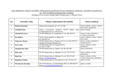 Lista mediatorów stałych i ośrodków mediacyjnych przekazanych przez organizacje społeczne i zawodowe na podstawie art. 1832§3 kodeksu postępowania cywilnego działających na terenie okręgu Sądu Okręgowego w Jeleniej Górze Lp. Nazwisko i imię Miejsce zamieszkania lub siedziba Zakres mediacji 1. Bożenta Sławomir Jelenia Góra (Legnica), tel. 517 172 540 2. Cieśliński Piotr 3. Chochol Krystyna miejsce prowadzenia mediacji: 58-570 Jelenia ul. Karkonoska 8/4, tel. 796 834 516 58-306 Wałbrzych, ul. Książańska 27, tel. 608 346 072 4. Fac Robert 5. Gniewosz Dorota 6. Kras Anna 7. Musiałowska Alina 58-521 Jeżów Sudecki, ul. Długa 129 tel. 600 268 216 58-506 Jelenia Góra, ul. Kiepury 39 A/13, tel. 601 999 575 [email protected] 58-500 Jelenia Góra, ul. Sudecka 89/32 tel. 530 171 866 58-560 Jelenia Góra, ul. Fałata 4, tel. 601 993 499 8. Róg Anna 58-570 Jelenia Góra, ul. Młyńska 7/6, tel. 796 779 799 9. Róg Piotr 10. Rogulska Ewelina 58-570 Jelenia Góra, ul. Młyńska 7/6, tel. 796 455 445 Email: [email protected] 58-500 Jelenia Góra, ul. Norwida 6A/12, tel. 792 434 737 11. Wesołowska Karolina sprawy rodzinne, cywilne, z zakresu prawa pracy, gospodarcze Góra, sprawy rodzinne 58-573 Piechowice, ul. Żymierskiego 98/5, tel. 609 020 417 Email: [email protected] sprawy cywilne, gospodarcze i z zakresu prawa pracy sprawy rodzinne, cywilne, z zakresu prawa pracy sprawy cywilne, gospodarcze, ubezpieczeniowe sprawy rodzinne, cywilne, gospodarcze sprawy gospodarcze sprawy rodzinne, cywilne, gospodarcze sprawy rodzinne, cywilne, z zakresu prawa pracy, gospodarcze sprawy cywilne sprawy cywilne