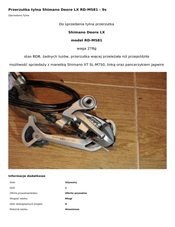 Przerzutka tylna Shimano Deore LX RD-M581 - 9s [Sprzedam] Tylne Do sprzedania tylna przerzutka Shimano Deore LX model RD-M581 waga 278g stan BDB, żadnych luzów, przerzutka więcej przeleżała niż przejeździła możliwość sprzedaży z manetką Shimano XT SL-M750, linką oraz pancerzykiem jagwire Informacje dodatkowe Stan Używany Ilość 1 Oferta prywatna/sklepu Oferta prywatna Długość wózka Długi Ilość obsługiwanych biegów 9 Materiał wózka Aluminium Adres ogłoszenia http://rowerowybazar.com.pl/przerzutka-tylna-shimano-deore-lx-rd-m581-9s,o4193 Kontakt Mail: [email protected] Telefon: 690240543 Lokalizacja , Kraków Małopolskie (Polska) Ogłoszenie dodano: 2016-07-20 15:24:18 Ogłoszenie wygasa: 2016-07-26 15:32:51 Powered by TCPDF (www.tcpdf.org)