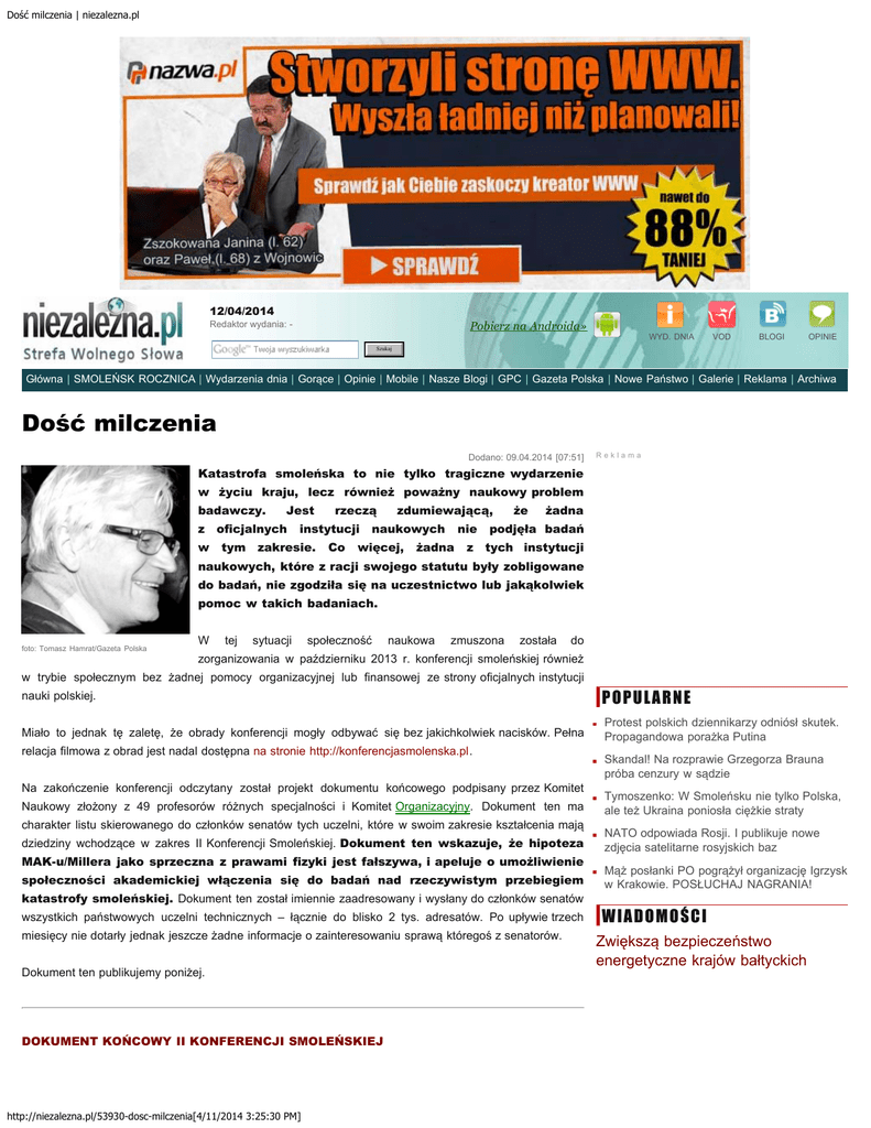 Dość milczenia | niezalezna.pl 12/04/2014 Pobierz na Androida» Redaktor wydania: - WYD. DNIA VOD BLOGI OPINIE Szukaj Główna | SMOLEŃSK ROCZNICA | Wydarzenia dnia | Gorące | Opinie | Mobile | Nasze Blogi | GPC | Gazeta Polska | Nowe Państwo | Galerie | Reklama | Archiwa Dość milczenia Dodano: 09.04.2014 [07:51] Reklama Katastrofa smoleńska to nie tylko tragiczne wydarzenie w życiu kraju, lecz również poważny naukowy problem badawczy. z w Jest oficjalnych tym rzeczą instytucji zakresie. Co zdumiewającą, naukowych więcej, żadna że żadna nie podjęła badań z tych instytucji naukowych, które z racji swojego statutu były zobligowane do badań, nie zgodziła się na uczestnictwo lub jakąkolwiek pomoc w takich badaniach. foto: Tomasz Hamrat/Gazeta Polska W tej sytuacji społeczność naukowa zmuszona została do zorganizowania w październiku 2013 r. konferencji smoleńskiej również w trybie społecznym bez żadnej pomocy organizacyjnej lub finansowej ze strony oficjalnych instytucji nauki polskiej. POPULAR NE Miało to jednak tę zaletę, że obrady konferencji mogły odbywać się bez jakichkolwiek nacisków. Pełna Protest polskich dziennikarzy odniósł skutek. Propagandowa porażka Putina relacja filmowa z obrad jest nadal dostępna na stronie http://konferencjasmolenska.pl. Na zakończenie konferencji odczytany został projekt dokumentu końcowego podpisany przez Komitet Naukowy złożony z 49 profesorów różnych specjalności i Komitet Organizacyjny. Dokument ten ma charakter listu skierowanego do członków senatów tych uczelni, które w swoim zakresie kształcenia mają dziedziny wchodzące w zakres II Konferencji Smoleńskiej. Dokument ten wskazuje, że hipoteza MAK-u/Millera jako sprzeczna z prawami fizyki jest fałszywa, i apeluje o umożliwienie społeczności akademickiej włączenia się do badań nad rzeczywistym przebiegiem katastrofy smoleńskiej. Dokument ten został imiennie zaadresowany i wysłany do członków senatów wszystkich państwowych uczelni technicznych – łącznie do blisko 2 tys. adresatów. Po upływie trzech miesięcy nie dotarły jednak jeszcze żadne informacje o zainteresowaniu sprawą któregoś z senatorów. Dokument ten publikujemy poniżej. DOKUMENT KOŃCOWY II KONFERENCJI SMOLEŃSKIEJ http://niezalezna.pl/53930-dosc-milczenia[4/11/2014 3:25:30 PM] Skandal! Na rozprawie Grzegorza Brauna próba cenzury w sądzie Tymoszenko: W Smoleńsku nie tylko Polska, ale też Ukraina poniosła ciężkie straty NATO odpowiada Rosji. I publikuje nowe zdjęcia satelitarne rosyjskich baz Mąż posłanki PO pogrążył organizację Igrzysk w Krakowie. POSŁUCHAJ NAGRANIA! WIADOM OŚCI Zwiększą bezpieczeństwo energetyczne krajów bałtyckich Dość milczenia | niezalezna.pl Szanowni Senatorowie, II Konferencja Smoleńska, która odbyła się w Warszawie w dniach 21 i 22 października br., postawiła sobie jako cel „stworzenie forum dla przedstawienia interdyscyplinarnych badań dotyczących zagadnień technicznych, medycznych, socjologicznych i prawnych Katastrofy Smoleńskiej”. Cel ten w pełni został osiągnięty, a zakończone obrady dały świadectwo aktualnego stanu naukowego rozpoznania tragicznego wydarzenia, w którym w dniu 10.04.2010 zginął Prezydent Rzeczypospolitej wraz Adrian Zieliński mistrzem Europy! z 95 towarzyszącymi mu osobami. Ewenement na skalę światową Konferencja nie tylko osiągnęła założony cel, lecz również odniosła sukces na innych polach. Stała się świadectwem możliwości integracyjnych i badawczych środowiska naukowego. Bez jakiejkolwiek pomocy organizacyjnej lub finansowej oficjalnych instytucji stu kilkudziesięciu profesorów z 5 krajów potrafiło połączyć swe wysiłki dla wspólnego celu badawczego i udowodniło, że nawet przy braku dostępu do zasadniczych dowodów materialnych w postaci wraku, możliwy jest postęp w dochodzeniu do prawdy o okolicznościach Katastrofy Smoleńskiej. Podstawowym założeniem organizacyjnym Konferencji była całkowita jej otwartość i jawność. Zaproszenia do udziału w Konferencji zostały rozesłane do wszystkich wydziałów wszystkich uczelni akademickich, do wszystkich instytutów i jednostek naukowych na terenie W Kielcach upamiętniono ofiary zbrodni katyńskiej Polski, zarówno państwowych, jak i prywatnych, jeśli tylko w kręgu ich zainteresowania leżała dowolna z nauk objętych zakresem Konferencji. Dodatkowo zaproszenie umieszczone zostało na stronie internetowej. W wyniku tej akcji napłynęło na Konferencję blisko 50 referatów. Do bezpośrednich obrad Komitet Naukowy dopuścił 38 referatów reprezentujących cały wachlarz współczesnych dziedzin nauki – 23 referaty z nauk technicznych, 3 z medycznych, 6 z socjologicznych i 6 referatów z nauk prawnych. Dla zapewnienia jawności obrad i uniemożliwienia manipulacji medialnej, obrady w całości były transmitowane na żywo poprzez Internet. Dzięki tej transmisji obradom przysłuchiwało się nie tylko 220 uczestników obecnych na sali, lecz również wielka rzesza internautów. Obrady były retransmitowane przez kilka telewizji internetowych, a szacunkowa liczba oglądających je internautów wyniosła 200 tys. Czyni to z II Trzy lata za jajo na Komorowskim Konferencji Smoleńskiej ewenement na skalę światową. Dość fałszywych hipotez II Konferencja Smoleńska przeanalizowała techniczne, medyczne, socjologiczne i prawne aspekty Katastrofy Smoleńskiej. Kilkadziesiąt przedstawionych referatów ukazuje łącznie aktualny stan naszej wiedzy odnośnie do przebiegu Katastrofy Smoleńskiej. Ukazuje też zakres dalszych badań, jakie są niezbędne dla pełnego wyjaśnienia przebiegu tej wielkiej narodowej tragedii. Obraz, jaki się wyłania z przedstawionych prac dowodzi jednoznacznie, że hipoteza jakoby w dniu 10.04.2010 samolot Tu-154 w Smoleńsku stracił kawałek skrzydła w wyniku uderzenia w brzozę, a następnie rozbił się doszczętnie w wyniku uderzenia 