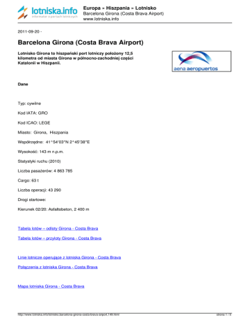 Europa » Hiszpania » Lotnisko Barcelona Girona (Costa Brava Airport) www.lotniska.info 2011-09-20 - Barcelona Girona (Costa Brava Airport) Lotnisko Girona to hiszpański port lotniczy położony 12,5 kilometra od miasta Girona w północno-zachodniej części Katalonii w Hiszpanii. Dane Typ: cywilne Kod IATA: GRO Kod ICAO: LEGE Miasto: Girona, Hiszpania Współrzędne: 41°54′03″N 2°45′38″E Wysokość: 143 m n.p.m. Statystyki ruchu (2010) Liczba pasażerów: 4 863 785 Cargo: 63 t Liczba operacji: 43 290 Drogi startowe: Kierunek 02/20: Asfaltobeton, 2 400 m Tabela lotów – odloty Girona - Costa Brava Tabela lotów – przyloty Girona - Costa Brava Linie lotnicze operujące z lotniska Girona - Costa Brava Połączenia z lotniska Girona - Costa Brava Mapa lotniska Girona - Costa Brava http://www.lotniska.info/lotnisko,barcelona-girona-costa-brava-airport,149.html strona 1 / 5 Europa » Hiszpania » Lotnisko Barcelona Girona (Costa Brava Airport) www.lotniska.info OPIS Lotnisko Girona jest bardzo dobrze połączone z Cosa Brava, Barceloną i Pyrenees. Lotnisko zostało wybudowane w 1965 roku. W latach 2000 lotnisko zanotowało dynamiczny wzrost ruchu pasażerskiego ze względu na współpracę z linią lotniczą Ryanair która stworzyła bazę na lotnisku w Costa Brava. W 1993 roku lotnisko notowało ruch pasażerski na poziomie 275 tysięcy a już między latami 2002 (500 tysięcy pasażerów) a 2008 (5,5 miliona) lotnisko dziesięciokrotnie zwiększyło ruch pasażerski. Port lotniczy Girona – Costa Brava jest alternatywnym lotniskiem dla lotniska w Barcelonie. Wiele osób właśnie wybiera to lotnisko ze względu na obecność tanich linii lotniczych. Dystans pomiędzy Barceloną a lotniskiem w Girona - Costa Brava to 92 kilometry. Połączenie z lotniska Girona do Barcelony jest zapewniane dzięki autobusom jak i pociągom ze stacji w mieście Girona. Dojechać można w 60 minut z lotniska Girona do centrum Barcelony. Z Girony Ryanair posiada 62 połączeń i jest to trzecie co do wielkości największe lotnisko jako baza dla irlandzkiej linii lotniczej. Lądowanie na lotnisku Girona Airport (video) DOJAZD Auto Na lotnisko można dojechać używając drogi N-II, AP-7 (exit 8) i C-25. Autobusy Z lotniska Girona – Costa Brava kursuje wiele autobusów do różnych miejscowości, m.in. do Barcelony. Z Girona – Costa Brava Airport do Andorra Z Girona – Costa Brava Airport do Barcelony Połączenie realizowane przez Ryanair Buses, rozkład jazdy uwarunkowany jest od przylotów i odlotów samolotów Ryanair. Czas podróży wynosi 1 godzinę i 10 minut. http://www.lotniska.info/lotnisko,barcelona-girona-costa-brava-airport,149.html strona 2 / 5 Europa » Hiszpania » Lotnisko Barcelona Girona (Costa Brava Airport) www.lotniska.info Więcej informacji: http://www.barcelonabus.com/ (902 361 550) Z Girona – Costa Brava Airport do Costa Brava Norte Autobusy zatrzymują się również w takich miejscowościach jak Figueres, Empuriabrava i Roses. Połączenia realizowane są przez Sarfa http://www.sarfa.es/ i Barcelona Bus http://www.barcelonabus.com/ Z Girona – Costa Brava Airport do Costa Brava South Autobusy realizujące te połączenia przejeżdżają przez nadmorskie miejscowości Lloret de Mar, Blanes, Malgrat de Mar, Santa Susanna, Pineda de Mar, Maresme, Calella de la Costa, san Pol, Canet, Arenys de Mar, St. Andreu de Llavaneres, Mataró i Tossa de Mar. Połączenia realizowane są przez Sarfa http://www.sarfa.es/ i Barcelona Bus http://www.barcelonabus.com/ Z Girona – Costa Brava Airport do Fornells de la Selva – Girona Autobus łączy dworzec w Girona z lotniskiem w Girona. Z Girona – Costa Brava Airport do Girona Połączenie realizowane przez Ryanair łączące lotnisko z miastem Girona. Czas podróży to 25 minut. Autobusy kursują z Girona, co godzinę od 04:00 do 00:00, od lotniska, co godzinę od 04:30 do 00:30. Z Girona – Costa Brava Airport do Le Boulou - Perpignan Line Autobusy realizują z lotniska połączenia do francuskich miejscowości Le Boulou and Perpignan. Więcej informacji na temat tego połączenia znajdziesz na stronie http://www.frogbus.com/fr Z Girona – Costa Brava Airport do Lleida Połączenie łączy lotnisko z miastami Vic, Manresa, Cervera, Tarrega i Lleida. Więcej informacji na stronie http://www.teisa-bus.com/ Taxi Na lotnisku znajduje się wiele taksówek które zabiorą nas do różnych miejscowości. Przybliżona cena do Barcelony to 125-135 euro http://www.lotniska.info/lotnisko,barcelona-girona-costa-brava-airport,149.html strona 3 / 5 Europa » Hiszpania » Lotnisko Barcelona Girona (Costa Brava Airport) www.lotniska.info Telefon: 972 203 377 972 222 323 Obsługa klienta 24 h/24 h 676 669 814 Parking Na lotnisku znajduje się wiele miejsc parkingowych, cennik: 20 minut :€0.30. Za dzień do 4 dni: €9.05. Za dzień po 4 dniu:€7.25. Wynajem samochodów na lotnisku Girona Atesa http://www.atesa.es/ E-mail:[email protected] 972 068 002 902 100 101 Fax: 972 473 971 AurigaCrown Car Hire http://www.aurigacrown.com 972 186 832 Fax: 972 473 669 http://www.lotniska.info/lotnisko,barcelona-girona-costa-brava-airport,149.html strona 4 / 5 Europa » Hiszpania » Lotnisko Barcelona Girona (Costa Brava Airport) www.lotniska.info Europcar http://www.europcar.es 972 186 618 902 105 030 Fax: 972 473 550 Gold Car Spain http://www.goldcar.es E-mail:[email protected] 965 233 179 902 119 726 Fax: 972 474 651 Hertz http://www.hertz.es E-mail:[email protected] 972 186 619 Fax:972 474 216 http://www.lotniska.info/lotnisko,barcelona-girona-costa-brava-airport,149.html http://www.lotniska.info/lotnisko,barcelona-girona-costa-brava-airport,149.html Powered by TCPDF (www.tcpdf.org) strona 5 / 5
