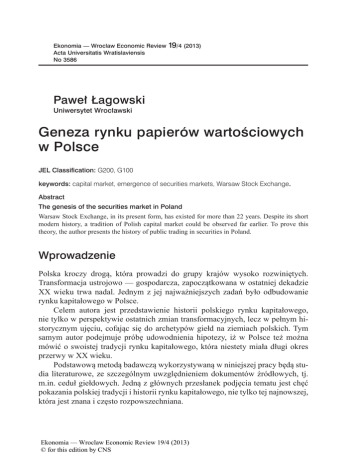 Ekonomia — Wroclaw Economic Review Acta Universitatis Wratislaviensis No 3586 19/4 (2013) Paweł Łagowski Uniwersytet Wrocławski Geneza rynku papierów wartościowych w Polsce JEL Classification: G200, G100 keywords: capital market, emergence of securities markets, Warsaw Stock Exchange. Abstract The genesis of the securities market in Poland Warsaw Stock Exchange, in its present form, has existed for more than 22 years. Despite its short modern history, a tradition of Polish capital market could be observed far earlier. To prove this theory, the author presents the history of public trading in securities in Poland. Wprowadzenie Polska kroczy drogą, która prowadzi do grupy krajów wysoko rozwiniętych. Transformacja ustrojowo — gospodarcza, zapoczątkowana w ostatniej dekadzie XX wieku trwa nadal. Jednym z jej najważniejszych zadań było odbudowanie rynku kapitałowego w Polsce. Celem autora jest przedstawienie historii polskiego rynku kapitałowego, nie tylko w perspektywie ostatnich zmian transformacyjnych, lecz w pełnym historycznym ujęciu, cofając się do archetypów giełd na ziemiach polskich. Tym samym autor podejmuje próbę udowodnienia hipotezy, iż w Polsce też można mówić o swoistej tradycji rynku kapitałowego, która niestety miała długi okres przerwy w XX wieku. Podstawową metodą badawczą wykorzystywaną w niniejszej pracy będą studia literaturowe, ze szczególnym uwzględnieniem dokumentów źródłowych, tj. m.in. ceduł giełdowych. Jedną z głównych przesłanek podjęcia tematu jest chęć pokazania polskiej tradycji i historii rynku kapitałowego, nie tylko tej najnowszej, która jest znana i często rozpowszechniana. Ekonomia — Wroclaw Economic Review 19/4 (2013) © for this edition by CNS 70 Paweł Łagowski Rys historyczny Termin g i e ł d a (bourse) zaistniał najprawdopodobniej w roku 13091, jako określenie na odbywające się w domu rodziny Van der Beurse (Burse)2 w Brugii spotkania kupców. Fronton ich domu służył kupcom jako miejsce spotkań, w którym realizowano transakcje kupna-sprzedaży, wymieniano pieniądze itp. Alternatywnie uważa się, że wyraz bourse pochodzi od łacińskiego słowa bursa oznaczającego sakiewkę3 do trzymania pieniędzy. Za pierwszą międzynarodową giełdę uznaje się giełdę w Antwerpii, która powstała w 1515 roku. W roku 1531 otrzymała ona nowy budynek, ze względu na istotne zwiększenie się wolumenu zawieranych transakcji. Na giełdzie handlowano przede wszystkim zbożem i wekslami. W połowie XVI wieku roczny obrót wynosił ok. 40 milionów dukatów4. O giełdzie w Antwerpii można przeczytać: […] Giełda antwerpska otwierała swe podwoje początkowo o 11, potem o godz. 10 rano, a zamykała je niedługo po 12 godz. Oprócz tego odbywały się jeszcze zebrania wieczorem o 6 godz. Każda ,,nacja” miała swoje oddzielne miejsce na giełdzie. Większość transakcji jednakże zawierano poza giełdą, w biurach notariuszy i w kantorach kupców. Na giełdę nie wolno było wchodzić z bronią, gdyż mogłoby dojść do krwawych starć między poszczególnymi narodowościami. Niełatwo jednak było postanowienie to wprowadzić w życie. Faktor króla portugalskiego dawał innym zły przykład, gdyż, jako pełnomocnik królewski wzbraniał się złożyć swoją szpadę. Miasto musiało ustąpić. Istotnie na giełdzie zdarzały się wypadki nie tylko utarczek słownych, […] uczestnicy zebrań chwytali za broń i zadawali sobie rany sztyletem[...]5. Pierwsza6 giełda papierów wartościowych powstała w Amsterdamie w roku 1611 w związku z wyemitowaniem akcji przez Holenderskie Kompanie Wschodnio- i Zachodnioindyjskie. Przyczyniło się to do zwiększenia i upowszechnia obrotu akcjami na giełdzie w Amsterdamie. Po sukcesie giełd niderlandzkich zaczęto przenosić tę ideę do innych krajów europejskich. W roku 1566 sir Thomas Gresham założył giełdę w Londynie, nazywając ją Exchange, a w roku 1571 Królowa Elżbieta I nadała jej przywileje, zmieniając jednocześnie nazwę na the Royal Exchange. W roku 1760 utworzono London Stock Exchange, która obecnie jest jedną z największych giełd papierów wartościowych na świecie, ustępując pierwszeństwa jedynie giełdom amerykańskim. 1 F. Braudel, Civilization and Capitalism, vol. III. The Perspective of the World, London 1984. Istnieją rozbieżności co do nazwiska. 3 Prawdopodobnie na fasadzie domu rodziny Van der Bourse widniało godło rodowe, w którym znajdowały się trzy sakiewki. 4 D.T. Dziuba, Giełdy i ich archetypy na ziemiach polskich, Warszawa 2006, s. 24. 5 S. Kuliszer, Powszechna historia gospodarcza średniowiecza i czasów nowożytnych, t. 2, Warszawa 1961, s. 322. 6 Istnieją spory, gdzie powstała pierwsza giełda papierów wartościowych, niektórzy historycy uważają, iż pierwsza taka giełda powstała we Francji w XII w. wraz z pojawieniem się akcji (praw własności) do manufaktur tekstylnych, prawdopodobnie handlowano nimi już ok. roku 1100. 2 Ekonomia — Wroclaw Economic Review 19/4 (2013) © for this edition by CNS Geneza rynku papierów wartościowych w Polsce 71 Pierwszą giełdę w Stanach Zjednoczonych otwarto w 1790 roku w Filadelfii7, a w roku 1792 powstała największa i najbardziej znana giełda nowojorska (New York Stock Exchange)8. Do historii giełdy przeszedł dzień 24 października 1929 roku9 jako czarny czwartek, uznany za symboliczny początek Wielkiego Kryzysu w Stanach Zjednoczonych. Tego dnia indeks DJIA10 spadł o ponad 10%. Podczas kryzysu indeks giełdy spadł o blisko 89%, osiągając dno w lipcu 1932 roku11. Drugim znanym parkietem amerykańskim jest NASDAQ, utworzony w 1971 roku, jako alternatywny w pełni elektroniczny system obrotu akcjami, gdzie początkowo notowano jedynie spółki związane z nowoczesnymi technologiami (IT). Obecnie NYSE i NASDAQ to największe giełdy na świecie pod względem obrotu i kapitalizacji12. W języku polskim termin g i e ł d a wywodz