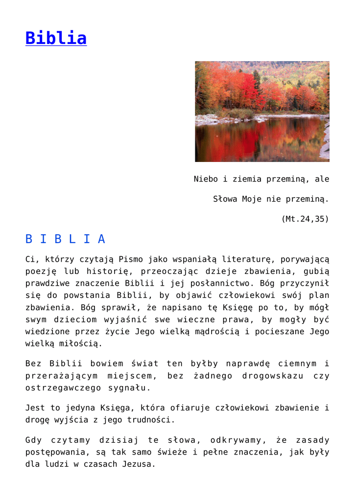 Biblia Niebo i ziemia przeminą, ale Słowa Moje nie przeminą. (Mt.24,35) B I B L I A Ci, którzy czytają Pismo jako wspaniałą literaturę, porywającą poezję lub historię, przeoczając dzieje zbawienia, gubią prawdziwe znaczenie Biblii i jej posłannictwo. Bóg przyczynił się do powstania Biblii, by objawić człowiekowi swój plan zbawienia. Bóg sprawił, że napisano tę Księgę po to, by mógł swym dzieciom wyjaśnić swe wieczne prawa, by mogły być wiedzione przez życie Jego wielką mądrością i pocieszane Jego wielką miłością. Bez Biblii bowiem świat przerażającym miejscem, ten byłby naprawdę ciemnym i bez żadnego drogowskazu czy ostrzegawczego sygnału. Jest to jedyna Księga, która ofiaruje człowiekowi zbawienie i drogę wyjścia z jego trudności. Gdy czytamy dzisiaj te słowa, odkrywamy, że zasady postępowania, są tak samo świeże i pełne znaczenia, jak były dla ludzi w czasach Jezusa. Biblia obejmuje całą wiedzę, jaką potrzebuje człowiek, by wypełnić pragnienia swej duszy i rozwiązać wszystkie swe problemy. Jest to plan doskonałego Architekta i, kierując się tylko Jego wskazaniami, możemy zbudować takie życie, jakiego poszukujemy. Biblia jest najwyższą Konstytucją dla całej ludzkości i jej prawa odnoszą się bez wyjątków jednakowo dla wszystkich, których ona obejmuje. Biblia jest najwyższym prawem Boga. W Biblii Bóg ustanowił swe prawa duchowe i dał trwałe obietnice, objawił plan zbawienia rodzaju ludzkiego. Na jej stronicach znajdujemy jasno i bezbłędnie sformułowane poselstwo, na którym opiera się całe prawdziwe chrześcijaństwo. Żaden prawdziwy chrześcijanin nie neguje żadnej jej części, ani też nie usiłuje dodać coś do Słowa Boga. W Biblii żadna poprawka nigdy nie jest potrzebna. Ludzie, którzy napisali Biblię, byli wiedzeni Duchem Świętym zarówno w wyrażaniu myśli jak i doborze słów. W czasie czytania Biblii, stronice wydają się zwierciadłami naszych umysłów i serc, odbijającymi naszą dumę i nasze przesądy, nasze własne upadki i nasze upokorzenia, nasze grzechy i smutki. W Biblii nie ma ukrytego celu. Nie potrzebuje Ona specjalnej interpretacji. Ma Ona jedyne, jasne i wyraźne posłannictwo dla wszystkich żyjących istot – posłannictwo Chrystusa, ofiarujące przez Niego pokój z Bogiem. Znajomość Biblii jest podstawą bogatego i wartościowego życia. Słowa bowiem tej Księgi umieją wypełnić pustkę, zastąpić braki, przywrócić przyćmionym barwom naszego życia blask klejnotów. Biblia jest objawieniem natury Boga. (B. Graham „Pokój z Bogiem”) Kanon Pisma Świętego : W Bibliach katolickich znajdujemy 73 księgi, natomiast kanon protestancki zawiera 66 ksiąg. Dlaczego istnieje różnica i jak do tego doszło? Aby to zrozumieć, należy się cofnąć do czasów Starego Testamentu, gdyż różnica dotyczy ksiąg starotestamentowych. Wśród Żydów istniały dwa, różniące się między sobą kanony: (a) Kanon jerozolimski, składający się z 39 ksiąg uznawanych za natchnione, oraz (b) kanon aleksandryjski (kanon Żydów zamieszkałych w Egipcie), który zawierał 39 ksiąg kanonicznych (w pełni natchnionych) oraz 7 ksiąg (Tobiasza, Judyty, 1 Machabejska, 2 Machabejska, Mądrości, Mądrości Syracha, deuterokanonicznych (wtórnie natchnionych). Barucha) tzw. Zebrani na Synodzie w Jawneh (Jamnia) ok. 100 r. po Chrystusie najwybitniejsi uczeni żydowscy ostatecznie ustalili, że w pełni natchniony kanon ksiąg świętych tworzy 39 ksiąg. Taki kanon został przyjęty przez protestantów. Natomiast Kościół rzymskokatolicki na Soborze Trydenckim (1546 r.) przyjął do kanonu także księgi deuterokanoniczne. Zmiany tej, jako niezgodnej ze stanowiskiem Żydów, protestanci nie uznali. W czasach Starego Testamentu, Pismo Święte dzieliło się na trzy części: Zakon (Tora) Proroków (Newim) Pisma (Wektuwim). Pierwsze jej rozdziały opisują piękno stworzonego przez Boga świata i szczęście bezgrzesznego człowieka, by potem, poprzez dzieje ludzkości doprowadzić do ziemskich dni Syna Bożego, Jego zwycięstwa odniesionego na Golgocie – i dalej – poprzez czasy nowotestamentowe, do ostatecznego zwycięstwa: wprowadzenia zbawionych na Nową Ziemię! Stary Testament był pisany po hebrajsku (niektóre, nieliczne fragmenty po aramejsku), zaś Nowy Testament po grecku: a. w wieku III/II przed Chrystusem powstał przekład Starego Testamentu tzw. „SEPTUAGINTA” (LXX); b. w wieku IV po Chr. całe Pismo Święte zostało przetłumaczone na język łaciński (tzw. AFRA i ITALA). Z kolei w wieku V po Chr. Hieronim dokonał najbardziej dotąd rozpowszechnionego przekładu Pisma Świętego na język łaciński („Wulgata”); c. na język polski przełożono Biblię po raz pierwszy w wieku XIV (Psałterz Floriański); d. najstarsze manuskrypty Starego Testamentu, np. niektóre rękopisy znad Morza Martwego (Qumran), sięgają III i IV wieku przed Chr. a zatem czasów bliskich Ezdraszowi; e. z kolei najstarsze manuskrypty Nowego Testamentu (np. fragmenty Rylanda), pochodzą z początku II wieku po Chr., czyli z czasów bliskich Janowi, który zmarł ok. 100 roku. PISMO ŚWIĘTE JEST NATCHNIONĄ KSIĘGĄ BOŻĄ! Szczery i nieuprzedzony człowiek może współcześnie – bardziej niż kiedykolwiek wcześniej – poznać szereg przekonujących dowodów, na rzecz nadprzyrodzonej inspiracji Pisma Świętego. Dowody te można podzielić na dwie zasadnicze grupy: 1. fenomen proroctwa biblijnego: Proroctwo, czyli znajomość przyszłych wydarzeń, pochodzi od Boga i wynika z Jego wszechwiedzy (DzAp 15,18). Proroctwa biblijne są liczne, a ich wypełnianie zawsze ścisłe i dokładne co stanowi niepodważalny dowód ich boskiej inspiracji; – Księgi Starego Testamentu zawierają szereg proroctw określających fakty związane z narodzeniem, życiem i działalnością, a następnie śmiercią i zmartwychwstaniem Jezusa Chrystusa (czytaj: Iz 7,14; Mt 1,18-2