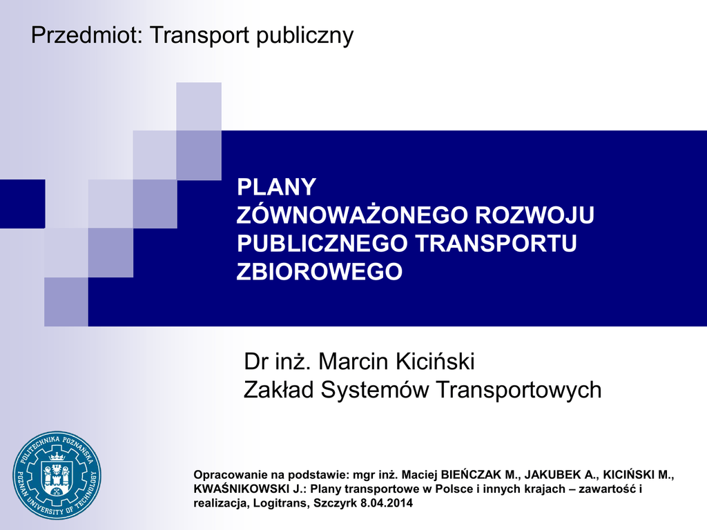 Przedmiot: Transport publiczny PLANY ZÓWNOWAŻONEGO ROZWOJU PUBLICZNEGO TRANSPORTU ZBIOROWEGO Dr inż. Marcin Kiciński Zakład Systemów Transportowych Opracowanie na podstawie: mgr inż. Maciej BIEŃCZAK M., JAKUBEK A., KICIŃSKI M., KWAŚNIKOWSKI J.: Plany transportowe w Polsce i innych krajach – zawartość i realizacja, Logitrans, Szczyrk 8.04.2014 PLAN PREZENTACJI Plany transportowe na świecie i czym jest plan transportowy? Podstawa prawna do sporządzenia planu transportowego w Polsce Akty prawne Zawartość planu transportowego Podmioty zobowiązane do opracowania planu transportowego Realizacja planów transportowych w Polsce Podsumowanie 2 Wprowadzenie Co to jest plan transportowy? 3 Podstawa prawna do sporządzenia planu transportowego Ustawa z dnia 16 grudnia 2010 r. o publicznym transporcie zbiorowym (Dz.U. 2011 nr 5 poz. 13) Rozporządzenie Ministra Infrastruktury z dnia 25 maja 2011 r. Ustawa o publicznym transporcie zbiorowym jest sformułowana na poziomie ogólności charakterystycznym dla tego typu aktów prawnych, jednakże rozporządzanie Ministra infrastruktury stanowi (z punktu widzenia wykonawcy planu transportowego) niejako kalkę ustawy, nie precyzując wystarczająco poszczególnych komponentów planu transportowego. 4 Kto musi opracować plan transportowy? gminy liczące powyżej 50 tys. mieszkańców powiaty liczące powyżej 80 tys. mieszkańców województwa porozumienia i związki międzygminne liczące więcej niż 80 tys. mieszkańców porozumienia i związki powiatowe liczące więcej niż 120 tys. mieszkańców . 5 kraj, województwo, powiat, gmina Wszystkie inne jednostki terytorialne mogą opracować plany transportowe. Plan transportowy niższego rzędu musi być zgodny z planem wyższego rzędu 6 Zawartość planu transportowego (cz. tekstowa) Charakterystyka wszystkich linii komunikacyjnych Ocena i prognoza potrzeb przewozowych Przewidywane finansowanie usług przewozowych Preferencje dotyczące wyboru rodzaju środków transportu Zasady organizacji rynku przewozów Pożądany standard usług przewozowych w przewozach o charakterze użyteczności publicznej Przewidywany sposób organizowania systemu informacji dla pasażera Kierunki rozwoju publicznego transportu zbiorowego 7 Zawartość planu transportowego (cz. graficzna) określenie skali w formie liczbowej i liniowej, granice administracyjne organizatora uchwalającego plan, objaśnienia użytych na rysunku oznaczeń i symboli, oznaczenia zintegrowanych węzłów przesiadkowych. Uwaga – miejskie plany transportowe nie muszą zawierać tej części. 8 Przykłady elementów „dodatkowych” planu transportowego Informacje o ruchu rowerowym Informacje o polityce P&R Informacje o przewozach komercyjnych Opisy wdrażania strategii Procedury sprawdzania realizacji planu transportowego Inne 9 Badania konieczne do opracowania planu transportowego Analiza dostępnych danych z przeprowadzonych badań, lub systemów elektronicznych Badania muszą być dostosowane do realnych potrzeb organizatora transportu Badania muszą uwzględniać ograniczenia kadrowe, finansowe i czasowe W przypadku braku możliwości trzeba wykorzystać dane wtórne Należy przeanalizować dane innych samorządów (jeśli jest to możliwe) Ustawodawca nie nakłada obowiązku prowadzenia badań!!! 10 Konsekwencje nie uchwalenia planu transportowego Ryzyko wystąpienia braku możliwości finansowania publicznego transportu zbiorowego w zakresie przewozów użyteczności publicznej Ryzyko wystąpienia braku możliwości zawierania umów z operatorami transportu dłuższych niż 3 lata Trudności w pozyskiwaniu grantów europejskich 11 Metodyka opracowania planu transportowego Badania terenowe wśród mieszkańców województwa wielkopolskiego w gospodarstwach domowych wśród pasażerów transportu zbiorowego (TZ): Inwentaryzacja sieci Budowa modelu transportowego województwa wielkopolskiego: w pociągach w autobusach modelowanie ruchu, prognozy ruchu Konstrukcja planu transportowego scenariusze rozwoju optymalizacja 12 Metodyka opracowania planu transportowego Podejście najtańsze Podejście najprostsze Dobre dla mały samorządów np. Gmin Wątpliwe w przypadku planów dla większych obszarów Dostępne dane, dostępna dokumentacja Plan transportowy 13 Metodyka opracowania planu transportowego Podejście podobne do pierwszego Badania mogą właściwie potwierdzić część posiadanych danych, ale nie wszystkie Dostępne dane, dostępna dokumentacja Uproszczone badania np. w kluczowych węzłach Plan transportowy 14 Metodyka opracowania planu transportowego Znacznie lepsze możliwości prognostyczne Dane zasilające model mogą być niewiarygodne Dostępne dane, dostępna dokumentacja Plan transportowy Model ruchu 15 Metodyka opracowania planu transportowego Podejście jest kompletne Bazuje na danych pozyskanych z gospodarstw domowych, badań kordonowych i w środkach transportu Dostępne dane, dostępna dokumentacja Plan transportowy KBR Model ruchu 16 Metodyka opracowania planu transportowego Posiada wszelkie zalety podejścia czwartego Daje gwarancję racjonalnego wydatkowania środków na transport publiczny Jest niesamowicie pracochłonne, a przez to kosztowne Dostępne dane, dostępna dokumentacja KBR Optymalizacja oferty transportu publicznego Plan transportowy Model ruchu 17 Dylematy Określenie rejonów komunikacyjnych (gmina vs. powiat) Jak traktować miasta na prawach powiatu? Ile przystanków autobusowych modelować dla rejonów komunikacyjnych? Jak agregować rozkłady jazdy dla zagregowanych przystanków? Jakie atrybuty nadawać konektorom? Jakie podróże modelować (między gminami czy powiatami?) . 18 Dylematy Czy należy prowadzić badania w gospodarstwach domowych? O jakich podróżach pozyskiwać informacje? Jak zdefiniować kryteria punktów prowadzenia badań i pomiarów? Jak ocenić wiarygodność już przeprowadzonych badań? Czy w czasie badań pozyskiwać informacje o standardach? Czy w czasie badań
