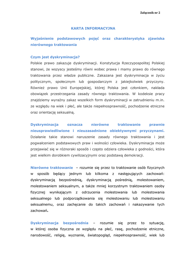 Załącznik nr 2 KARTA INFORMACYJNA Wyjaśnienie podstawowych pojęć oraz charakterystyka zjawiska nierównego traktowania Czym jest dyskryminacja? Polskie prawo zakazuje dyskryminacji. Konstytucja Rzeczypospolitej Polskiej stanowi, że wszyscy jesteśmy równi wobec prawa i mamy prawo do równego traktowania przez władze publiczne. Zakazana jest dyskryminacja w życiu politycznym, społecznym lub gospodarczym z jakiejkolwiek przyczyny. Również prawo Unii Europejskiej, której Polska jest członkiem, nakłada obowiązek przestrzegania zasady równego traktowania. W kodeksie pracy znajdziemy wyraźny zakaz wszelkich form dyskryminacji w zatrudnieniu m.in. ze względu na wiek i płeć, ale także niepełnosprawność, pochodzenie etniczne oraz orientację seksualną. Dyskryminacja oznacza nierówne traktowanie prawnie nieusprawiedliwione i nieuzasadnione obiektywnymi przyczynami. Działanie takie stanowi naruszenie zasady równego traktowania i jest pogwałceniem podstawowych praw i wolności człowieka. Dyskryminacja może przejawiać się w różnoraki sposób i często odziera człowieka z godności, która jest wielkim dorobkiem cywilizacyjnymi oraz podstawą demokracji. Nierówne traktowanie – rozumie się przez to traktowanie osób fizycznych w sposób będący dyskryminacją jednym lub bezpośrednią, kilkoma z dyskryminacją następujących pośrednią, zachowań: molestowaniem, molestowaniem seksualnym, a także mniej korzystnym traktowaniem osoby fizycznej wynikającym seksualnego z odrzucenia lub podporządkowania się molestowania molestowaniu lub molestowania lub molestowaniu seksualnemu, oraz zachęcanie do takich zachowań i nakazywanie tych zachowań. Dyskryminacja bezpośrednia – rozumie się przez to sytuację, w której osoba fizyczna ze względu na płeć, rasę, pochodzenie etniczne, narodowość, religię, wyznanie, światopogląd, niepełnosprawność, wiek lub Załącznik nr 2 orientację seksualną jest traktowana mniej korzystnie niż jest, była lub byłaby traktowana inna osoba w porównywalnej sytuacji. Dyskryminacja pośrednia – rozumie się przez to sytuację, w której dla osoby fizycznej ze względu na płeć, rasę, pochodzenie etniczne, narodowość, religię, wyznanie, światopogląd, niepełnosprawność, wiek lub orientację seksualną na skutek pozornie neutralnego postanowienia, zastosowanego kryterium lub podjętego działania występują lub mogłyby wystąpić niekorzystne dysproporcje lub szczególnie niekorzystna dla niej sytuacja, chyba że postanowienie, kryterium lub działanie jest obiektywnie uzasadnione ze względu na zgodny z prawem cel, który ma być osiągnięty, a środki służące osiągnięciu tego celu są właściwe i konieczne. Dyskryminacja przez asocjację - działanie dotyczące osoby, która choć sama nie jest nosicielem cechy prawnie chronionej, to jednak ze względu na więź łączącą ją z taką osobą, doświadcza nierównego traktowania. Molestowanie – rozumie się przez to każde niepożądane zachowanie, którego celem lub skutkiem jest naruszenie godności osoby fizycznej i stworzenie wobec niej zastraszającej, wrogiej, poniżającej, upokarzającej lub uwłaczającej atmosfery. Molestowanie seksualne – rozumie się przez to każde niepożądane zachowanie o charakterze seksualnym wobec osoby fizycznej lub odnoszące się do płci, którego celem lub skutkiem jest naruszenie godności tej osoby, w szczególności przez stworzenie wobec niej zastraszającej, wrogiej, poniżającej, upokarzającej lub uwłaczającej atmosfery; na zachowanie to mogą się składać fizyczne, werbalne lub pozawerbalne elementy. Seksizm – to przekonanie o biologicznej, intelektualnej i/lub moralnej – naturalnej lub ustanowionej – wyższości jednej płci nad drugą. Przekonanie o wynikającej z tej hierarchii zasadności nierównego traktowania osób różnych płci, uprzedzenie i/lub dyskryminacja ze względu na płeć. Załącznik nr 2 Pierwsze symptomy mogące świadczyć o nierównym traktowaniu W każdym środowisku służby/pracy istnieją czynniki negatywnie wpływające na zdrowie i samopoczucie funkcjonariuszy/pracowników. Kiedy myślimy o takich czynnikach, to w pierwszej kolejności bierzemy pod uwagę zarobki, premie, rozwój zawodowy itp. Na jakość funkcjonowania personelu wpływ mają także presja czasu, niewłaściwe relacje między ludźmi, zła organizacja pracy etc. – nazywane czynnikami psychospołecznymi, które niekontrolowane mogą spowodować równie groźne skutki. Współczesny model ochrony zdrowia powinien obejmować rozpoznawanie, monitorowanie oraz próby eliminowania zagrożeń psychospołecznych. Wśród czynników ryzyka psychospołecznego dotyczących relacji między ludźmi wyróżnić możemy takie jak: stres, agresja, mobbing, przemoc, dyskryminacja, seksualne. Światowa Organizacja molestowanie, Zdrowia szacuje, czy że molestowanie do 2020 roku podstawową przyczyną niezdolności do pracy będą problemy psychiczne, w tym przede wszystkim depresja, wynikające z patologii kontekstu pracy związanego z relacjami ze współpracownikami, podwładnymi i przełożonymi. Uwaga: Polskie Europejskiej prawo pracy dotyczących zostało dostosowane przeciwdziałania do mobbingowi, wymogów Unii dyskryminacji i nierównemu traktowaniu w miejscu pracy. Nierówne, dyskryminujące zachowanie zaczyna się często od bardzo niepozornych sygnałów, które z czasem stają się niczym „kula śniegowa”. Oto kilka przykładów: Przełożony pierwszy raz nie odpowiedział na moje powitanie; Przełożony wszystkim podał rękę na przywitanie - mnie nie, nawet na mnie nie spojrzał; Tylko mnie zwraca uwagę na wygląd; Jestem często jedyną osobą, która doświadcza zawodowych lub pozazawodowych uwag na temat siebie/swojej pracy w gronie współpracowników; Doświadczam czegoś w rodzaju izolowania budowania wokół mnie atmosfery nieufności. w miejscu pracy, Załącznik nr 2 WAŻNE: 