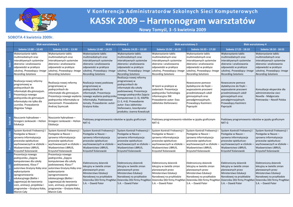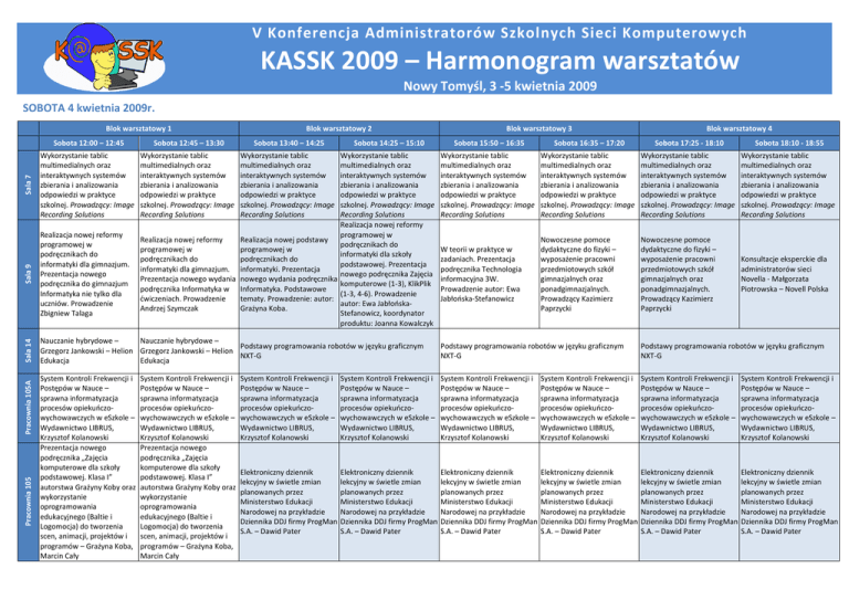 V Konferencja Administratorów Szkolnych Sieci Komputerowych KASSK 2009 – Harmonogram warsztatów Nowy Tomyśl, 3 -5 kwietnia 2009 SOBOTA 4 kwietnia 2009r. Blok warsztatowy 1 Blok warsztatowy 2 Sobota 14:25 – 15:10 Realizacja nowej reformy programowej w podręcznikach do informatyki dla gimnazjum. Prezentacja nowego podręcznika do gimnazjum Informatyka nie tylko dla uczniów. Prowadzenie Zbigniew Talaga Nauczanie hybrydowe – Nauczanie hybrydowe – Podstawy programowania robotów w języku graficznym Grzegorz Jankowski – Helion Grzegorz Jankowski – Helion NXT-G Edukacja Edukacja Pracownia 105 Pracownia 105A Sala 7 Sobota 13:40 – 14:25 Wykorzystanie tablic multimedialnych oraz interaktywnych systemów zbierania i analizowania odpowiedzi w praktyce szkolnej. Prowadzący: Image Recording Solutions Sala 9 Sobota 12:45 – 13:30 Wykorzystanie tablic multimedialnych oraz interaktywnych systemów zbierania i analizowania odpowiedzi w praktyce szkolnej. Prowadzący: Image Recording Solutions Sala 14 Sobota 12:00 – 12:45 Wykorzystanie tablic multimedialnych oraz interaktywnych systemów zbierania i analizowania odpowiedzi w praktyce szkolnej. Prowadzący: Image Recording Solutions System Kontroli Frekwencji i Postępów w Nauce – sprawna informatyzacja procesów opiekuoczowychowawczych w eSzkole – Wydawnictwo LIBRUS, Krzysztof Kolanowski Prezentacja nowego podręcznika „Zajęcia komputerowe dla szkoły podstawowej. Klasa I” autorstwa Grażyny Koby oraz wykorzystanie oprogramowania edukacyjnego (Baltie i Logomocja) do tworzenia scen, animacji, projektów i programów – Grażyna Koba, Marcin Cały Wykorzystanie tablic multimedialnych oraz interaktywnych systemów zbierania i analizowania odpowiedzi w praktyce szkolnej. Prowadzący: Image Recording Solutions Realizacja nowej reformy programowej w Realizacja nowej reformy Realizacja nowej podstawy podręcznikach do programowej w programowej w informatyki dla szkoły podręcznikach do podręcznikach do podstawowej. Prezentacja informatyki dla gimnazjum. informatyki. Prezentacja nowego podręcznika Zajęcia Prezentacja nowego wydania nowego wydania podręcznika komputerowe (1-3), KlikPlik podręcznika Informatyka w Informatyka. Podstawowe (1-3, 4-6). Prowadzenie dwiczeniach. Prowadzenie tematy. Prowadzenie: autor: autor: Ewa JabłooskaAndrzej Szymczak Grażyna Koba. Stefanowicz, koordynator produktu: Joanna Kowalczyk System Kontroli Frekwencji i Postępów w Nauce – sprawna informatyzacja procesów opiekuoczowychowawczych w eSzkole – Wydawnictwo LIBRUS, Krzysztof Kolanowski Prezentacja nowego podręcznika „Zajęcia komputerowe dla szkoły podstawowej. Klasa I” autorstwa Grażyny Koby oraz wykorzystanie oprogramowania edukacyjnego (Baltie i Logomocja) do tworzenia scen, animacji, projektów i programów – Grażyna Koba, Marcin Cały Blok warsztatowy 3 Blok warsztatowy 4 Sobota 15:50 – 16:35 Sobota 16:35 – 17:20 Sobota 17:25 - 18:10 Sobota 18:10 - 18:55 Wykorzystanie tablic multimedialnych oraz interaktywnych systemów zbierania i analizowania odpowiedzi w praktyce szkolnej. Prowadzący: Image Recording Solutions Wykorzystanie tablic multimedialnych oraz interaktywnych systemów zbierania i analizowania odpowiedzi w praktyce szkolnej. Prowadzący: Image Recording Solutions Wykorzystanie tablic multimedialnych oraz interaktywnych systemów zbierania i analizowania odpowiedzi w praktyce szkolnej. Prowadzący: Image Recording Solutions Wykorzystanie tablic multimedialnych oraz interaktywnych systemów zbierania i analizowania odpowiedzi w praktyce szkolnej. Prowadzący: Image Recording Solutions W teorii w praktyce w zadaniach. Prezentacja podręcznika Technologia informacyjna 3W. Prowadzenie autor: Ewa Jabłooska-Stefanowicz Nowoczesne pomoce dydaktyczne do fizyki – wyposażenie pracowni przedmiotowych szkół gimnazjalnych oraz ponadgimnazjalnych. Prowadzący Kazimierz Paprzycki Nowoczesne pomoce dydaktyczne do fizyki – wyposażenie pracowni przedmiotowych szkół gimnazjalnych oraz ponadgimnazjalnych. Prowadzący Kazimierz Paprzycki Konsultacje eksperckie dla administratorów sieci Novella - Małgorzata Piotrowska – Novell Polska Podstawy programowania robotów w języku graficznym NXT-G Podstawy programowania robotów w języku graficznym NXT-G System Kontroli Frekwencji i Postępów w Nauce – sprawna informatyzacja procesów opiekuoczowychowawczych w eSzkole – Wydawnictwo LIBRUS, Krzysztof Kolanowski System Kontroli Frekwencji i Postępów w Nauce – sprawna informatyzacja procesów opiekuoczowychowawczych w eSzkole – Wydawnictwo LIBRUS, Krzysztof Kolanowski System Kontroli Frekwencji i Postępów w Nauce – sprawna informatyzacja procesów opiekuoczowychowawczych w eSzkole – Wydawnictwo LIBRUS, Krzysztof Kolanowski System Kontroli Frekwencji i Postępów w Nauce – sprawna informatyzacja procesów opiekuoczowychowawczych w eSzkole – Wydawnictwo LIBRUS, Krzysztof Kolanowski System Kontroli Frekwencji i Postępów w Nauce – sprawna informatyzacja procesów opiekuoczowychowawczych w eSzkole – Wydawnictwo LIBRUS, Krzysztof Kolanowski System Kontroli Frekwencji i Postępów w Nauce – sprawna informatyzacja procesów opiekuoczowychowawczych w eSzkole – Wydawnictwo LIBRUS, Krzysztof Kolanowski Elektroniczny dziennik lekcyjny w świetle zmian planowanych przez Ministerstwo Edukacji Narodowej na przykładzie Dziennika DDJ firmy ProgMan S.A. – Dawid Pater Elektroniczny dziennik lekcyjny w świetle zmian planowanych przez Ministerstwo Edukacji Narodowej na przykładzie Dziennika DDJ firmy ProgMan S.A. – Dawid Pater Elektroniczny dziennik lekcyjny w świetle zmian planowanych przez Ministerstwo Edukacji Narodowej na przykładzie Dziennika DDJ firmy ProgMan S.A. – Dawid Pater Elektroniczny dziennik lekcyjny w świetle zmian planowanych przez Ministerstwo Edukacji Narodowej na przykładzie Dziennika DDJ firmy ProgMan S.A. – Dawid Pater Elektroniczny dziennik lekcyjny w świetle zmian planowan