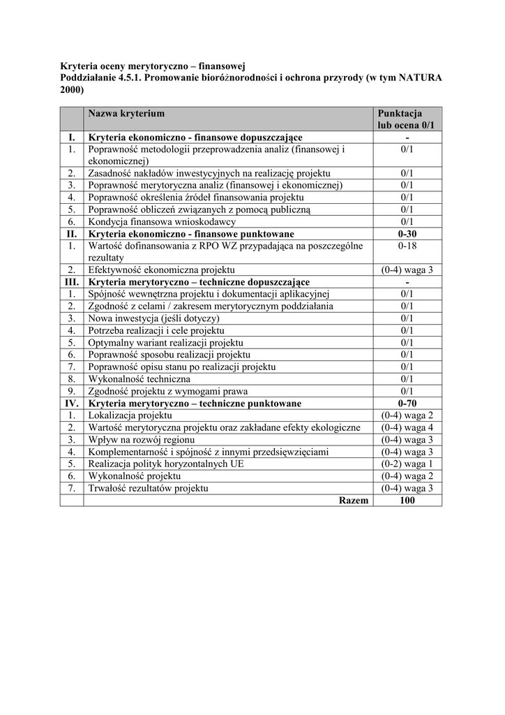 Kryteria oceny merytoryczno – finansowej Poddziałanie 4.5.1. Promowanie bioróŜnorodności i ochrona przyrody (w tym NATURA 2000) Nazwa kryterium I. 1. Kryteria ekonomiczno - finansowe dopuszczające Poprawność metodologii przeprowadzenia analiz (finansowej i ekonomicznej) 2. Zasadność nakładów inwestycyjnych na realizację projektu 3. Poprawność merytoryczna analiz (finansowej i ekonomicznej) 4. Poprawność określenia źródeł finansowania projektu 5. Poprawność obliczeń związanych z pomocą publiczną 6. Kondycja finansowa wnioskodawcy II. Kryteria ekonomiczno - finansowe punktowane 1. Wartość dofinansowania z RPO WZ przypadająca na poszczególne rezultaty 2. Efektywność ekonomiczna projektu III. Kryteria merytoryczno – techniczne dopuszczające 1. Spójność wewnętrzna projektu i dokumentacji aplikacyjnej 2. Zgodność z celami / zakresem merytorycznym poddziałania 3. Nowa inwestycja (jeśli dotyczy) 4. Potrzeba realizacji i cele projektu 5. Optymalny wariant realizacji projektu 6. Poprawność sposobu realizacji projektu 7. Poprawność opisu stanu po realizacji projektu 8. Wykonalność techniczna 9. Zgodność projektu z wymogami prawa IV. Kryteria merytoryczno – techniczne punktowane 1. Lokalizacja projektu 2. Wartość merytoryczna projektu oraz zakładane efekty ekologiczne 3. Wpływ na rozwój regionu 4. Komplementarność i spójność z innymi przedsięwzięciami 5. Realizacja polityk horyzontalnych UE 6. Wykonalność projektu 7. Trwałość rezultatów projektu Razem Punktacja lub ocena 0/1 0/1 0/1 0/1 0/1 0/1 0/1 0-30 0-18 (0-4) waga 3 0/1 0/1 0/1 0/1 0/1 0/1 0/1 0/1 0/1 0-70 (0-4) waga 2 (0-4) waga 4 (0-4) waga 3 (0-4) waga 3 (0-2) waga 1 (0-4) waga 2 (0-4) waga 3 100
